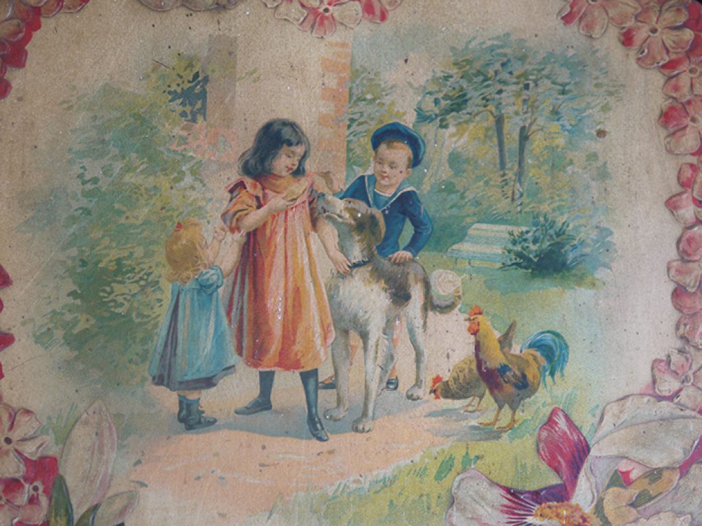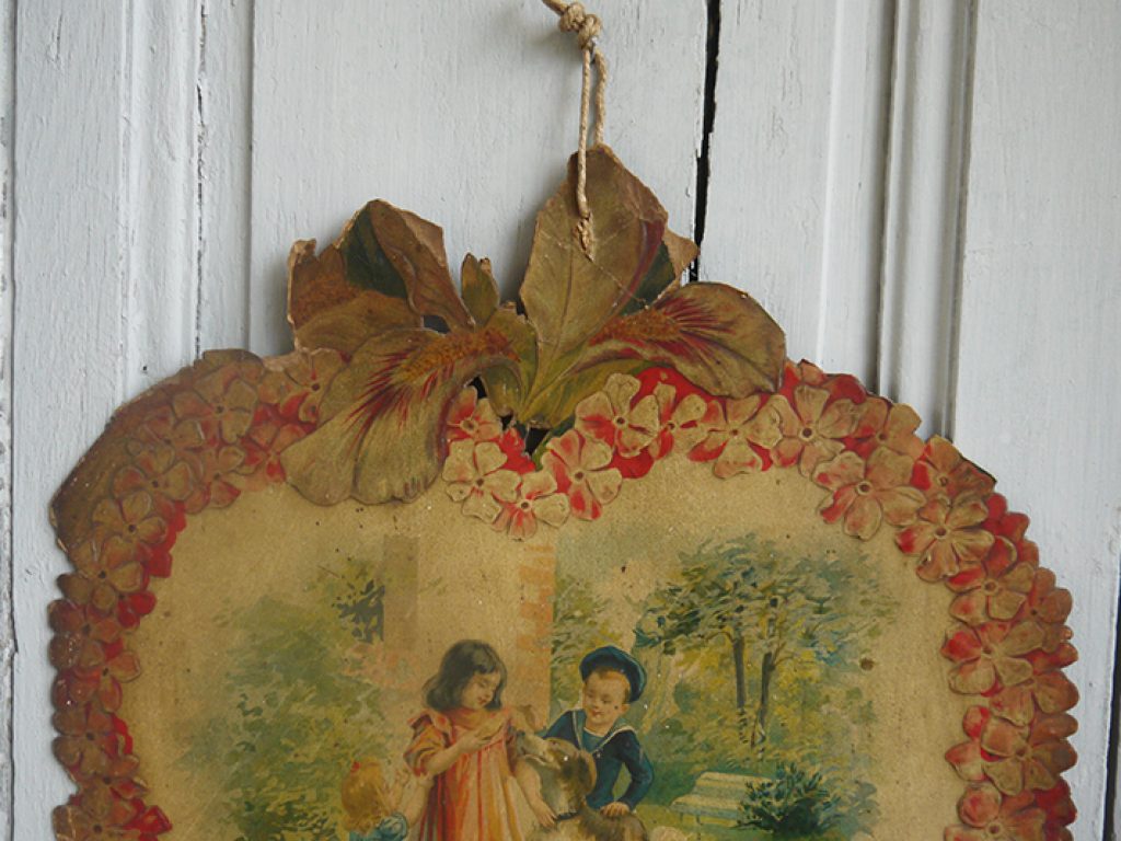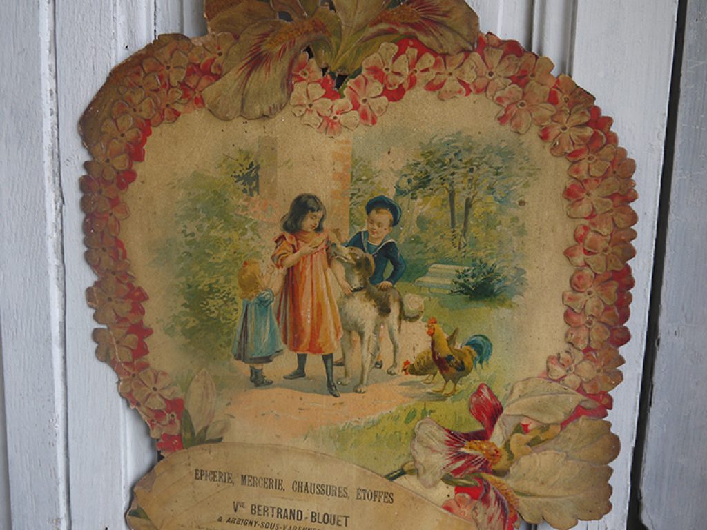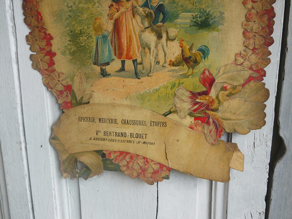 Grand chromo publicitaire ancien en forme de coeur, bordé de fleurs, avec charmant décor d’enfants. Petits manques sur les bords, une déchirure sur le bas, pliure. Beaucoup de charme !