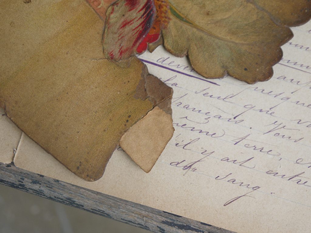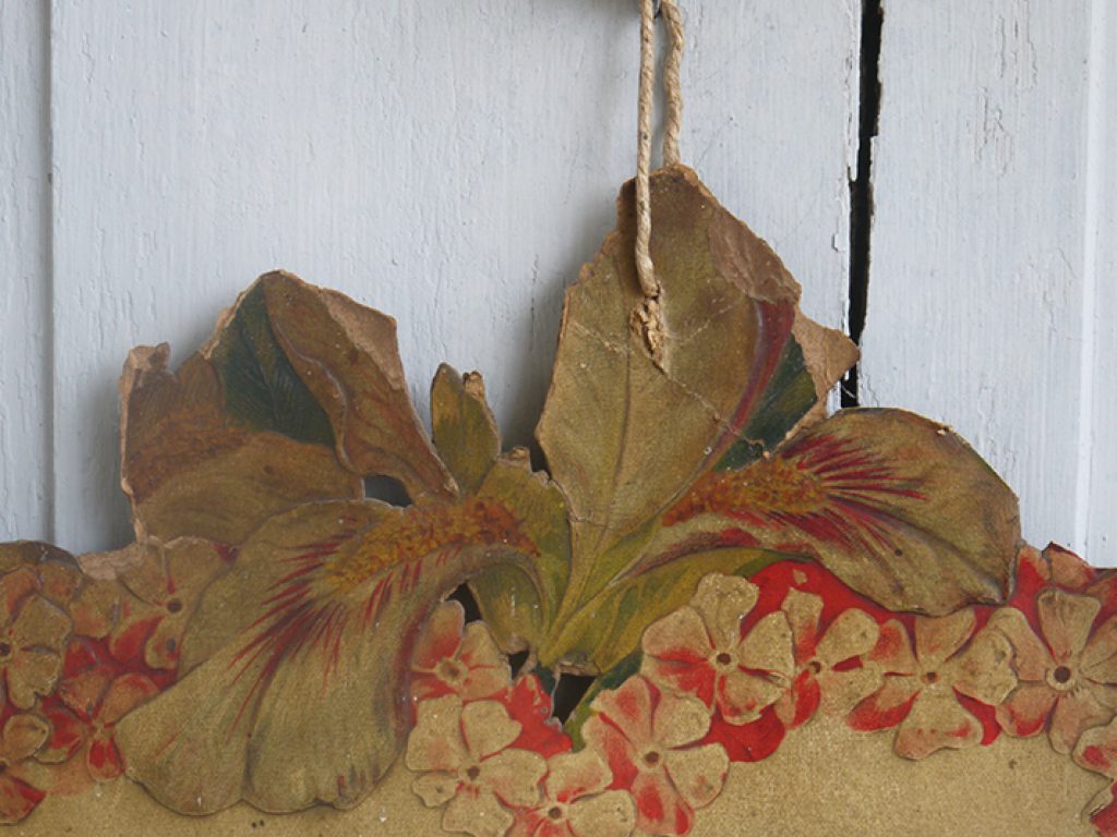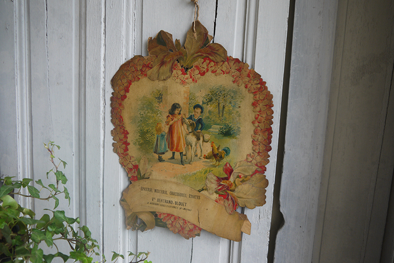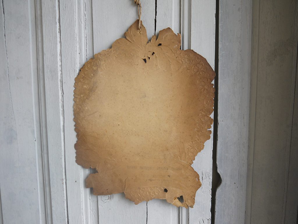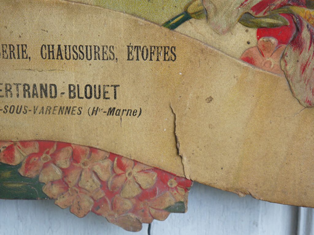 Grand chromo publicitaire ancien en forme de coeur, bordé de fleurs, avec charmant décor d’enfants. Petits manques sur les bords, une déchirure sur le bas, pliure. Beaucoup de charme !