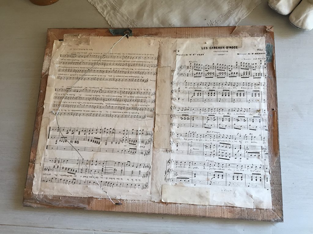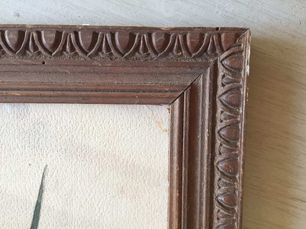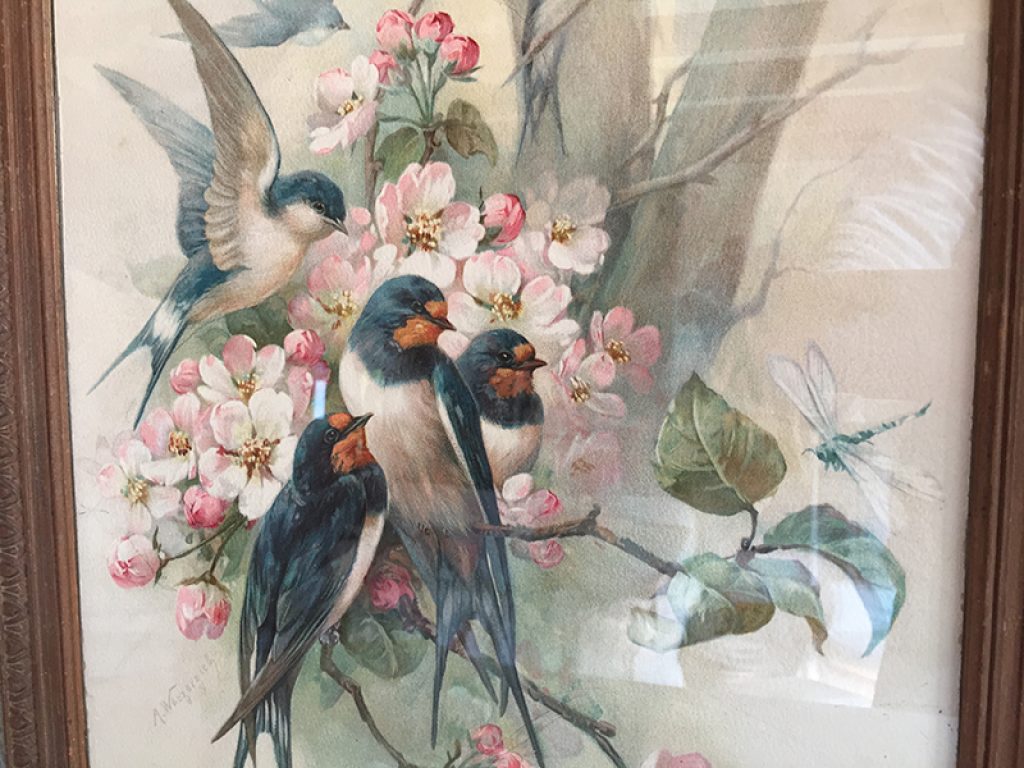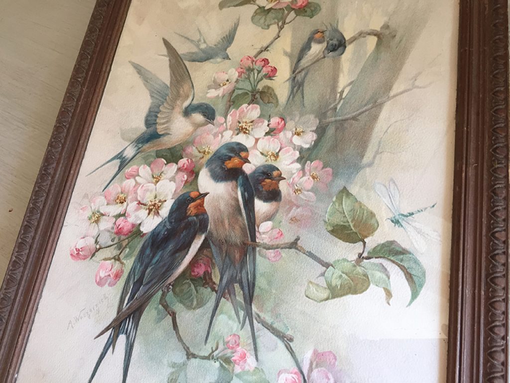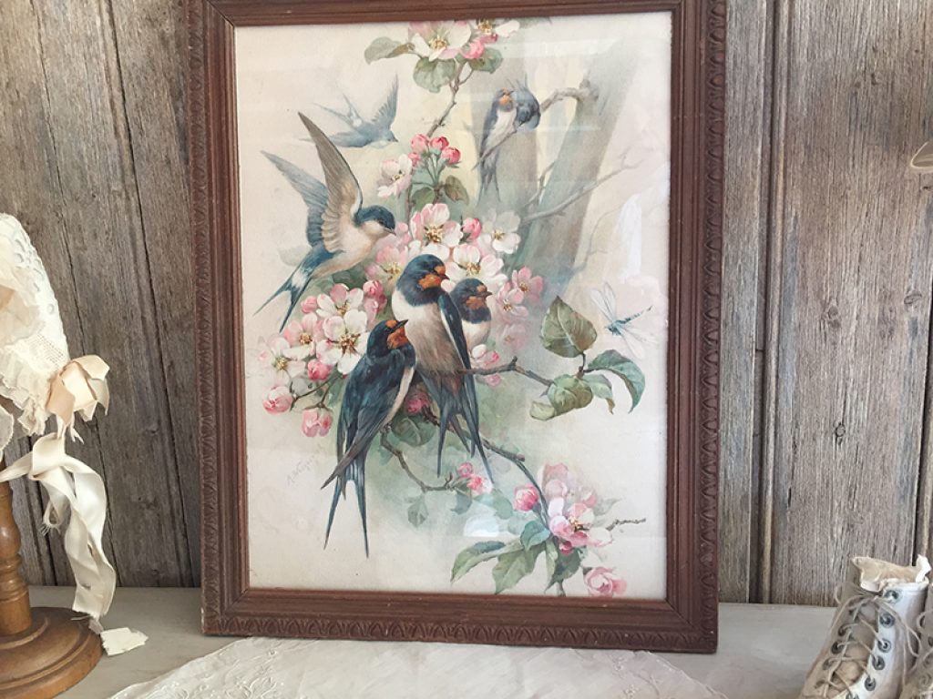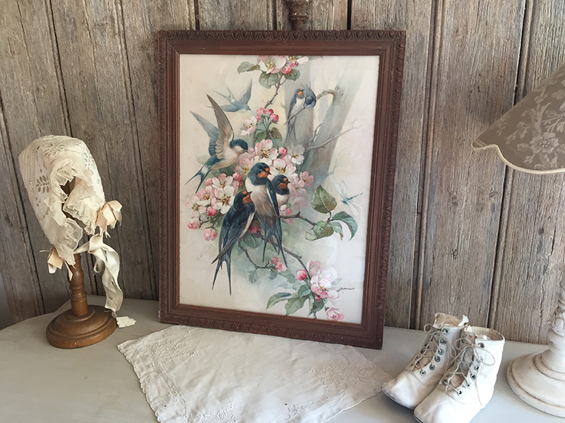 Ravissant chromo ancien sous verre dans un cadre en bois, avec joli décor d’oiseaux et de fleurs.
