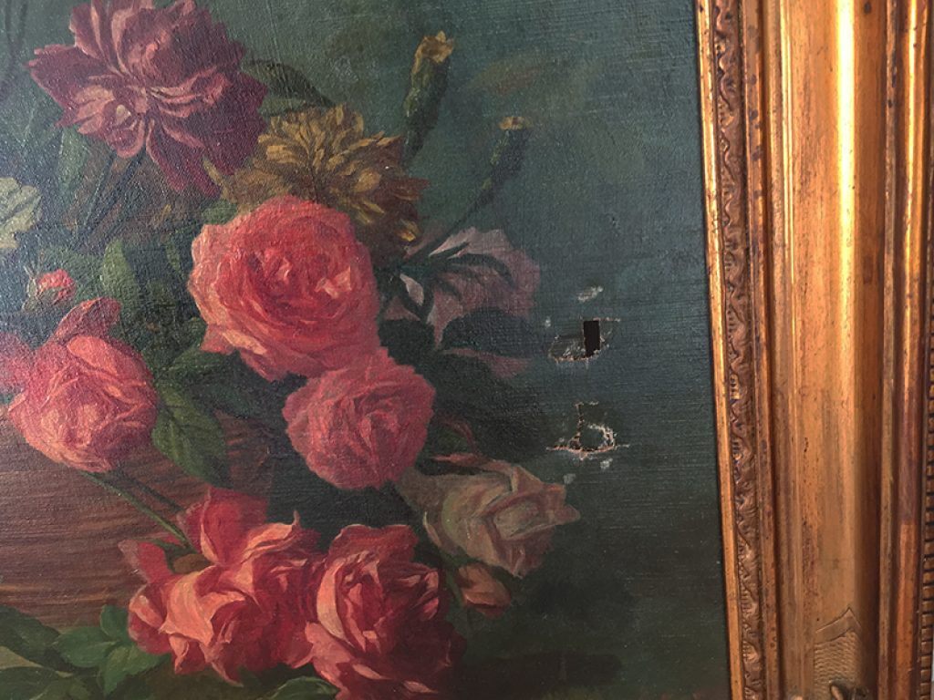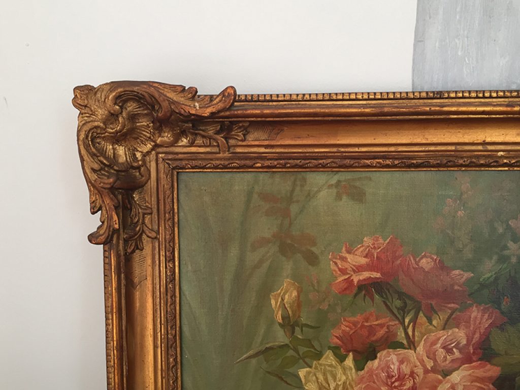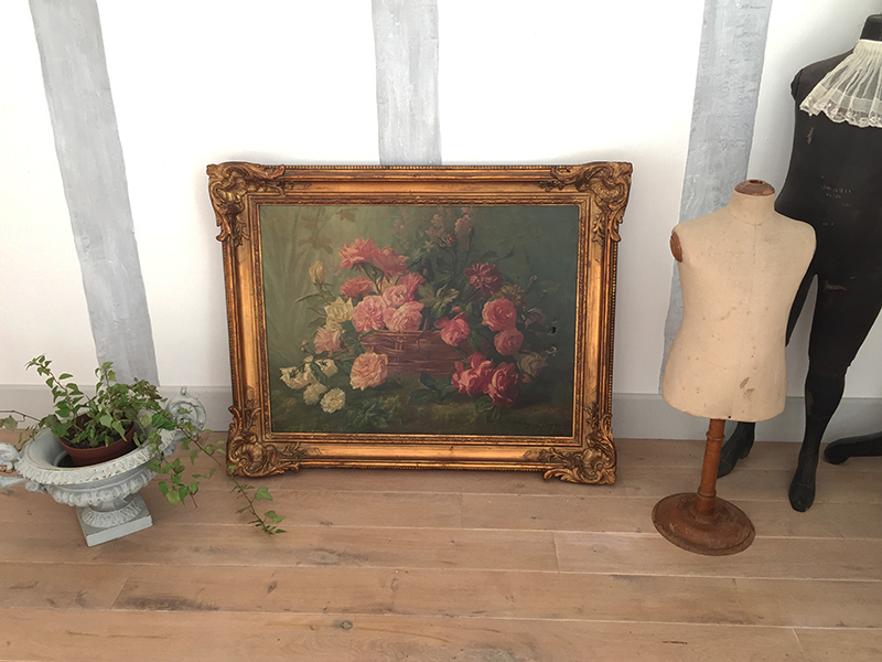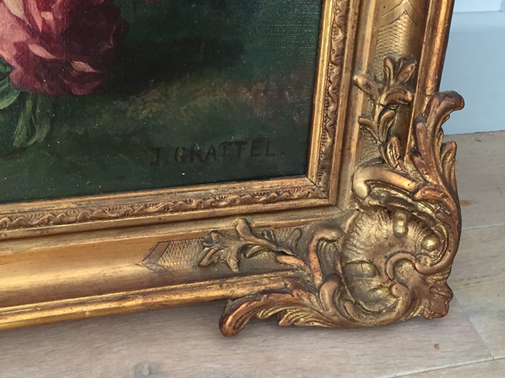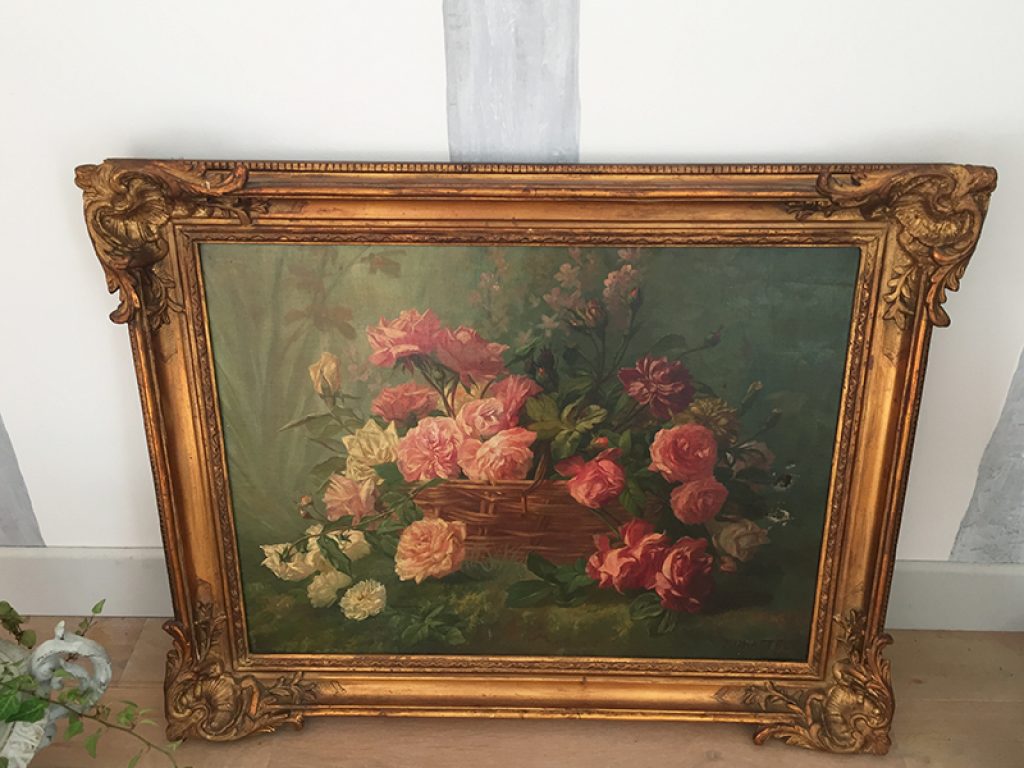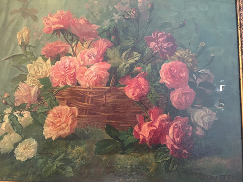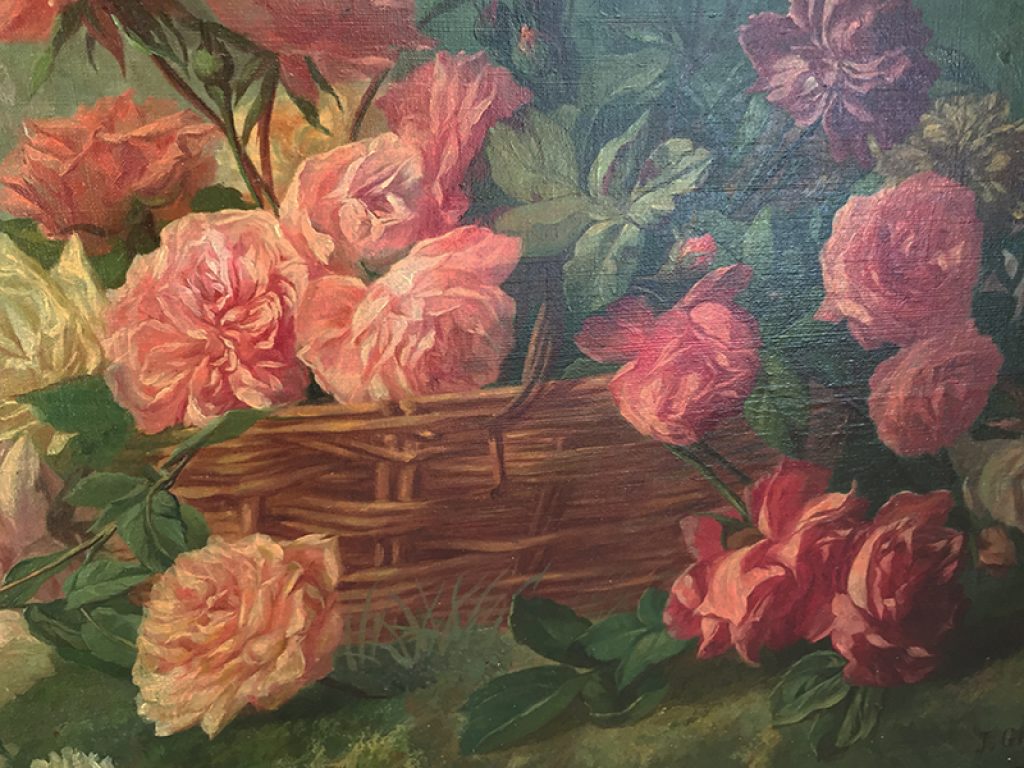 Elégante et grande huile sur toile ancienne avec son cadre, au très charmant décor de roses exécuté avec beaucoup de finesse. Une signature en bas J. Grattel. Petits accidents dus à son âge