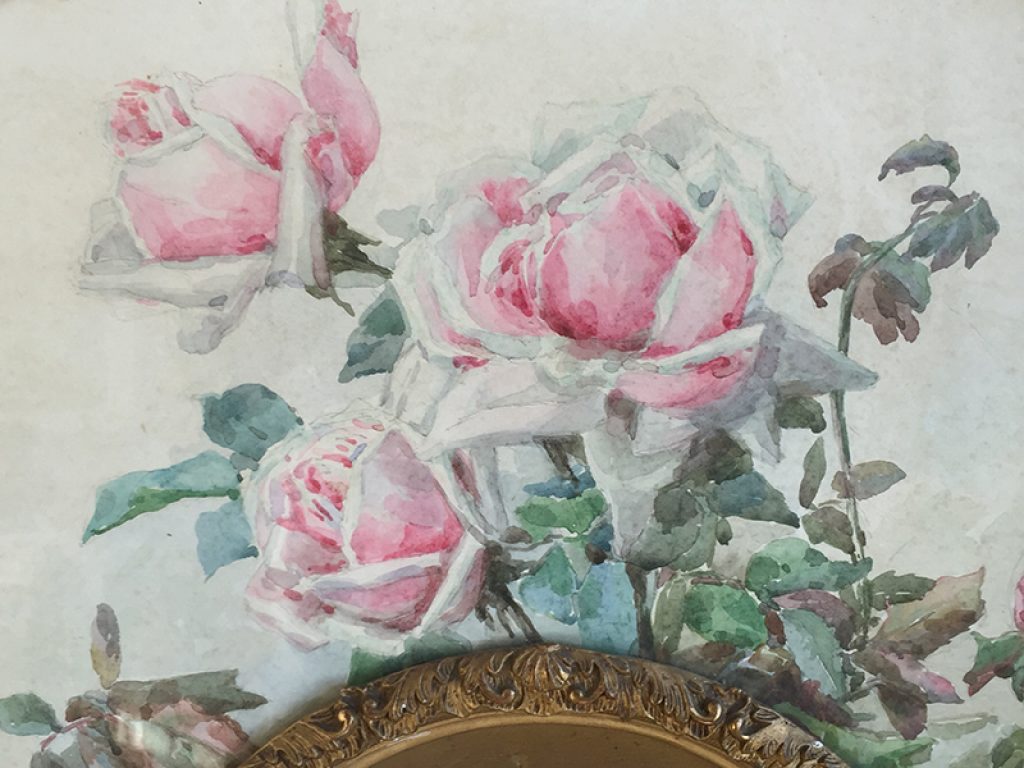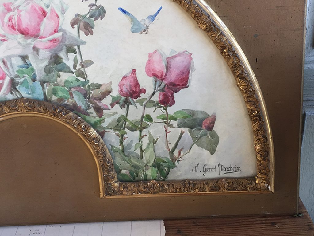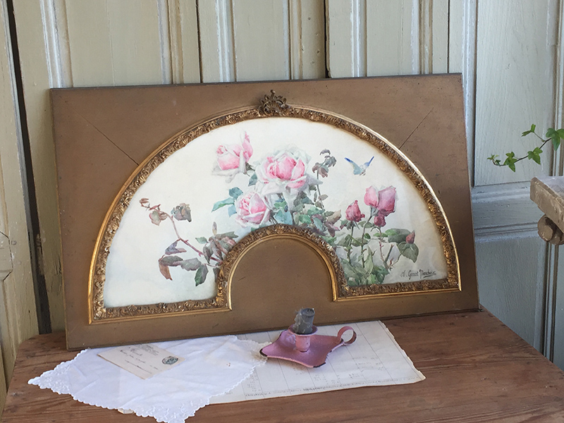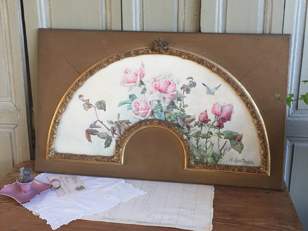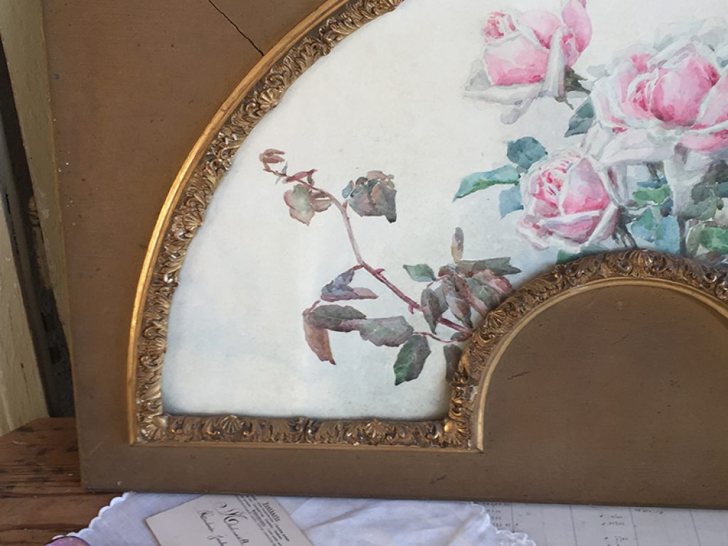 Ancienne aquarelle au joli décor de roses, servant de projet pour éventail, sous verre dans son cadre d’origine en bois et plâtre doré. Une signature en bas. Beaucoup de charme, parfait en déco shabby.