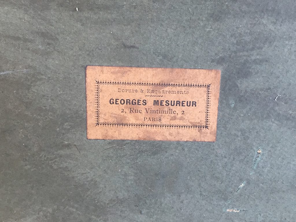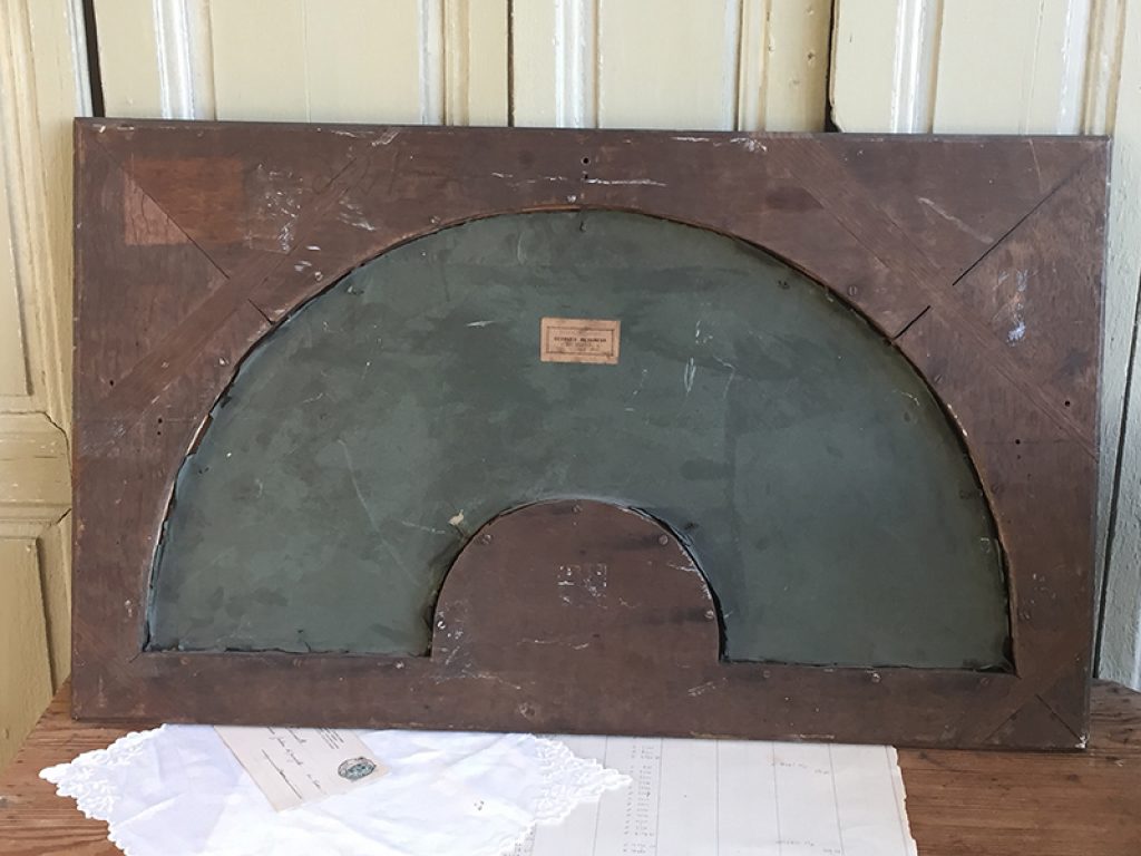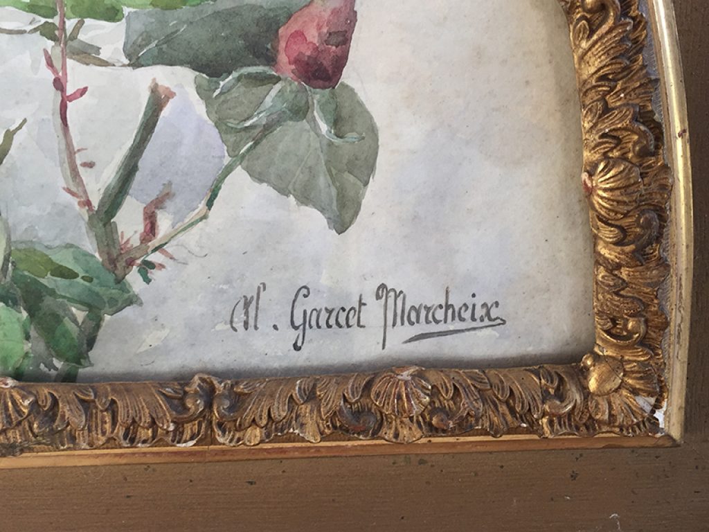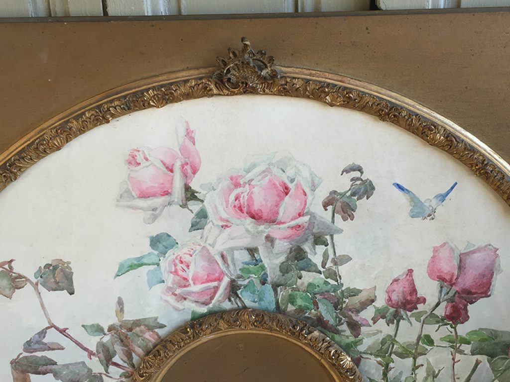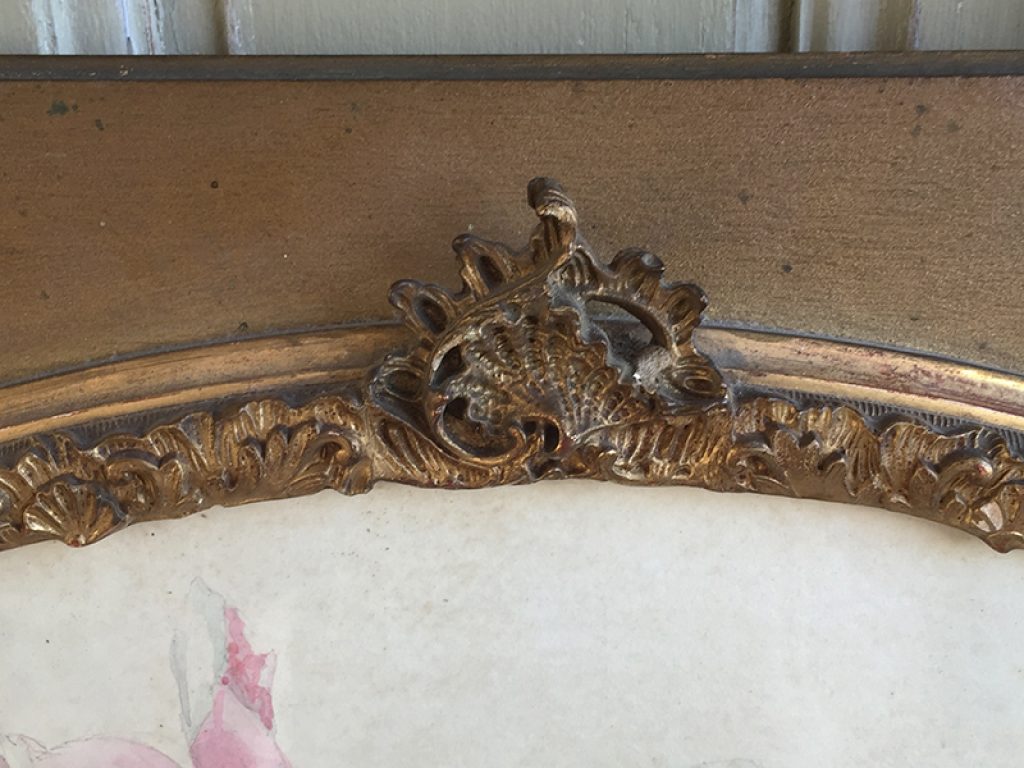 Ancienne aquarelle au joli décor de roses, servant de projet pour éventail, sous verre dans son cadre d’origine en bois et plâtre doré. Une signature en bas. Beaucoup de charme, parfait en déco shabby.
