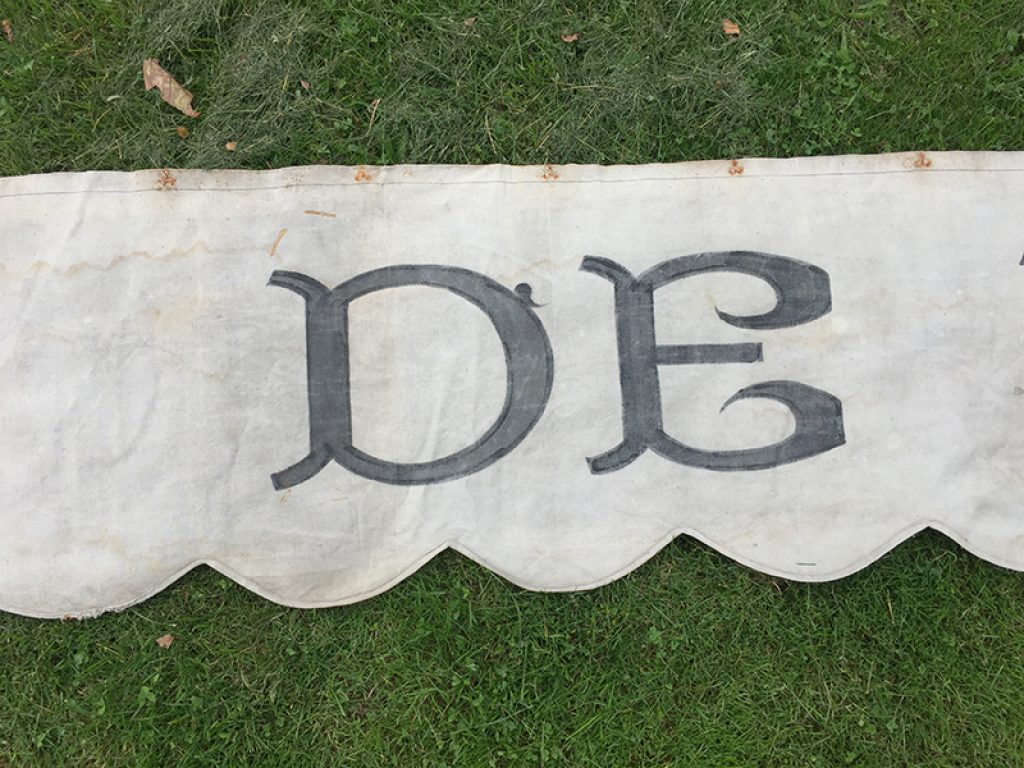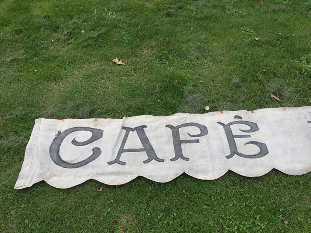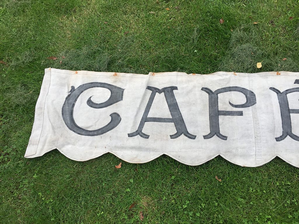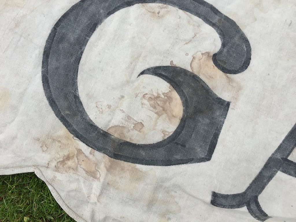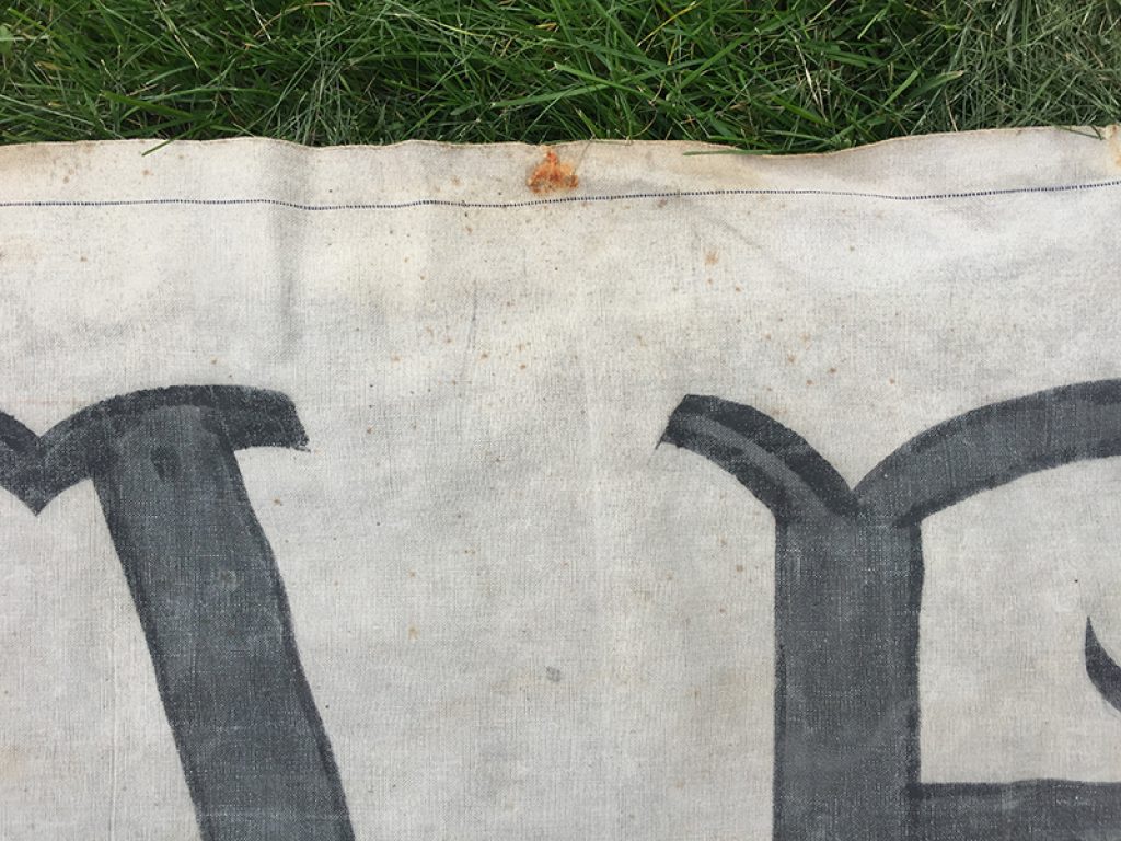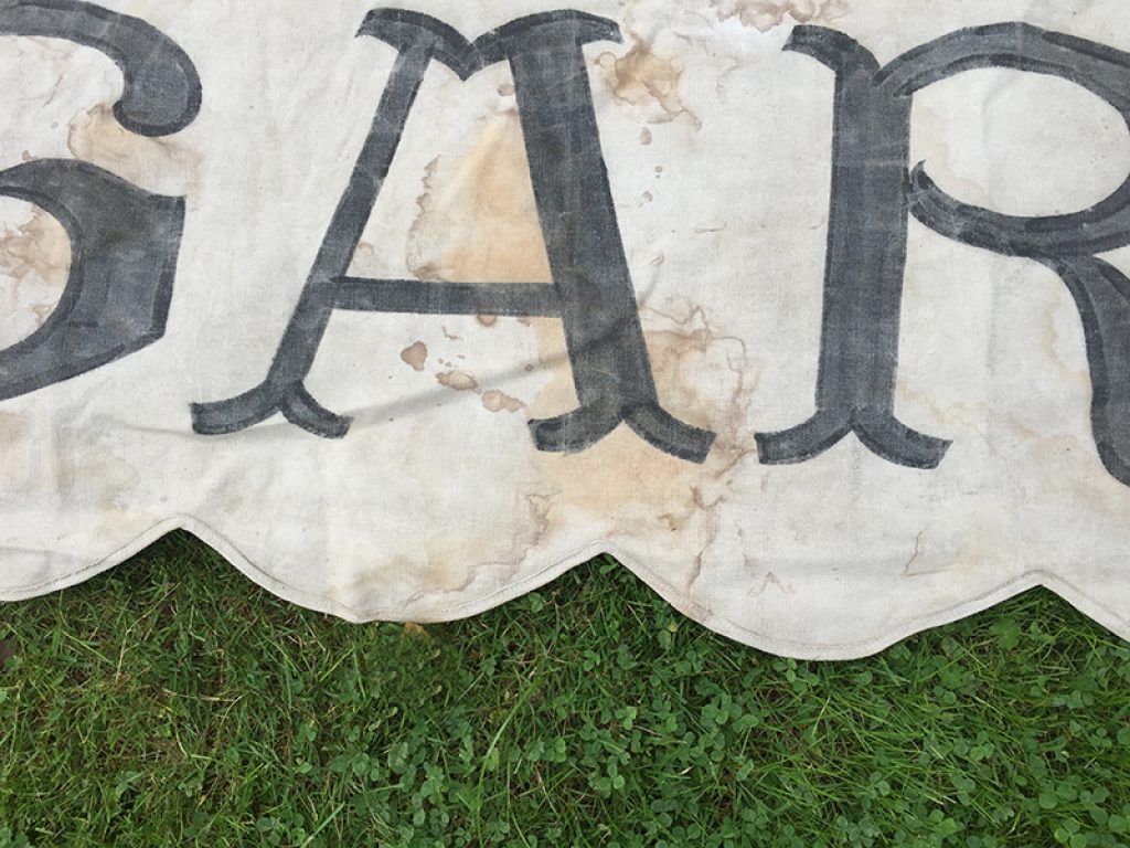 Très grande enseigne ancienne en toile peinte à la main, comportant des taches et auréoles dues à son âge.