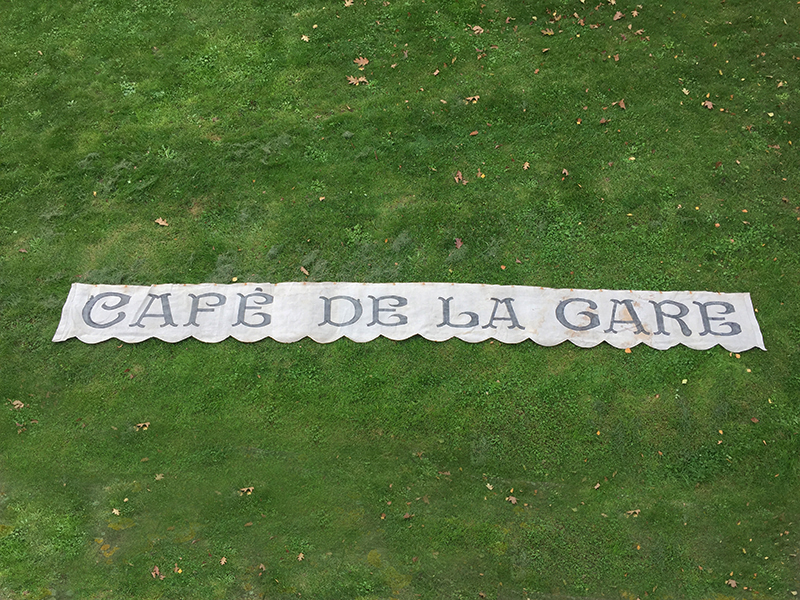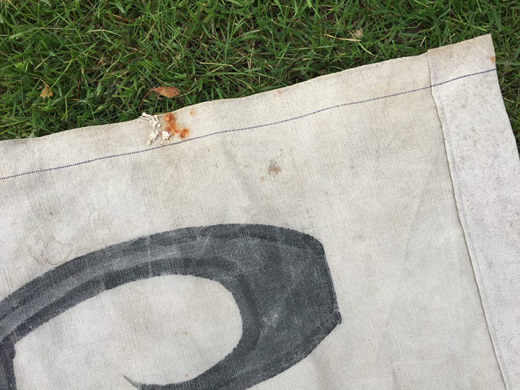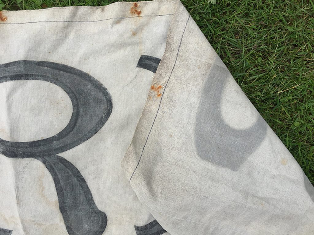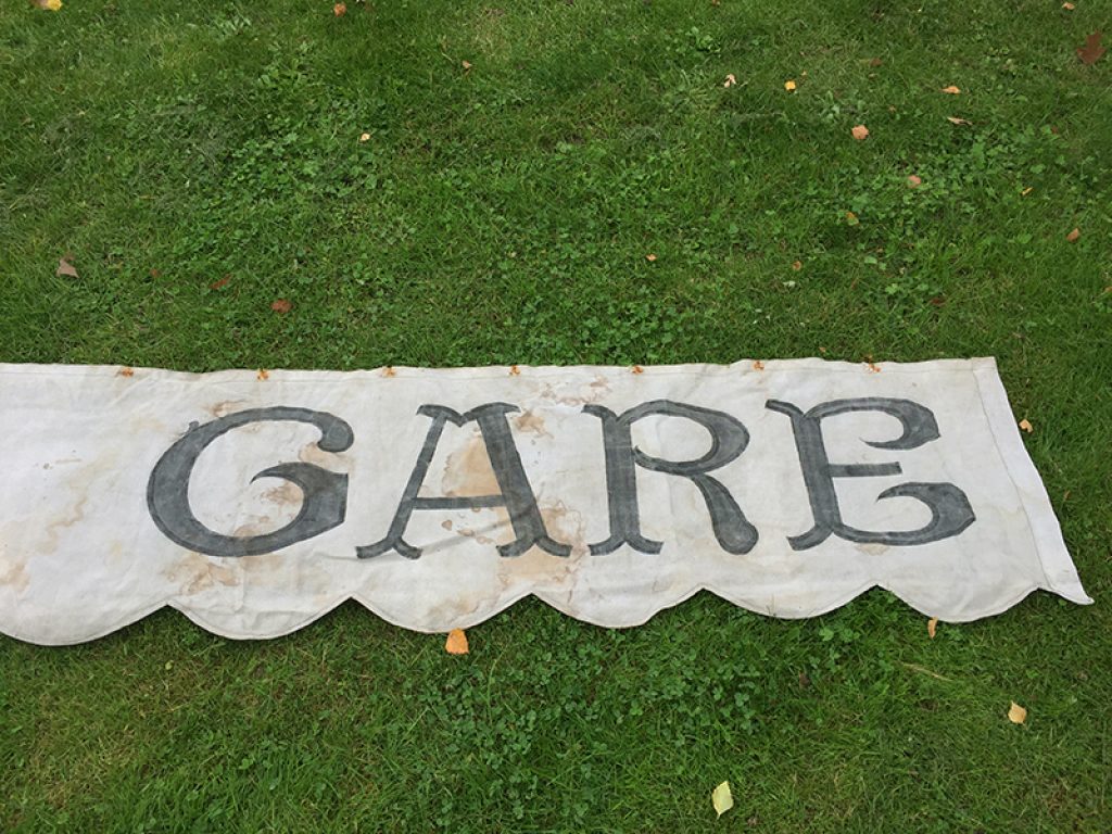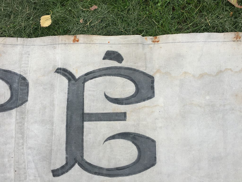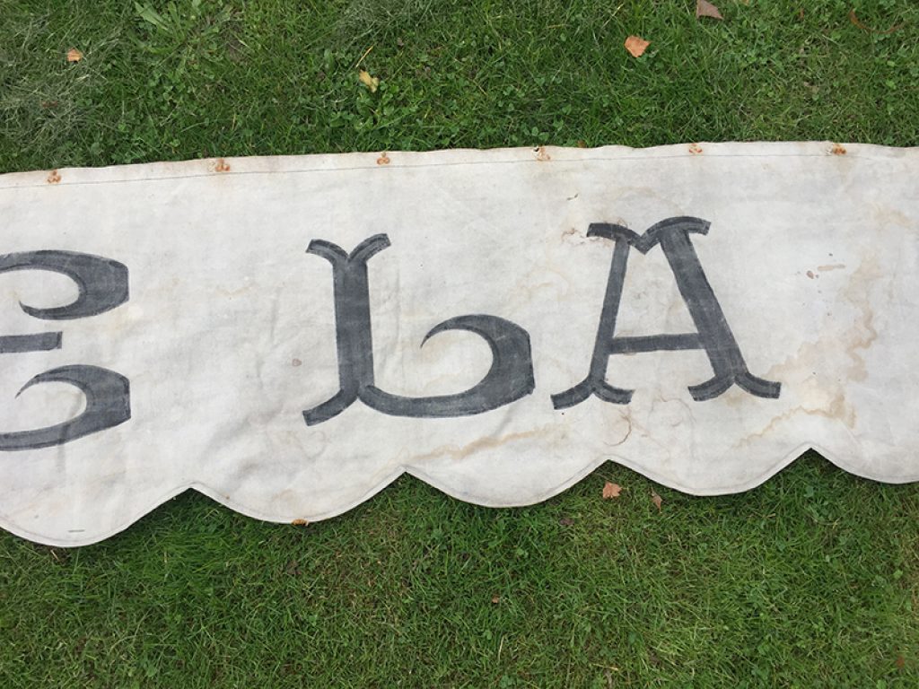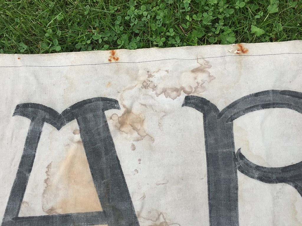 Très grande enseigne ancienne en toile peinte à la main, comportant des taches et auréoles dues à son âge.
