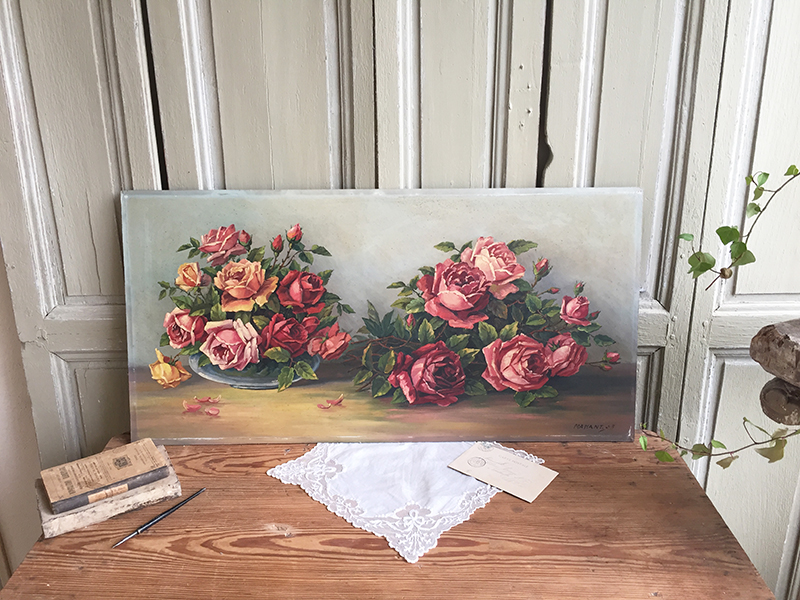 Ravissante huile sur isorel ancienne, signée en bas à droite. Joli décor de roses en vase et en bouquet.