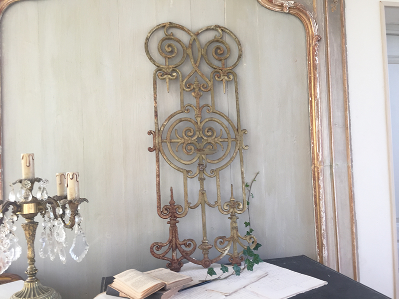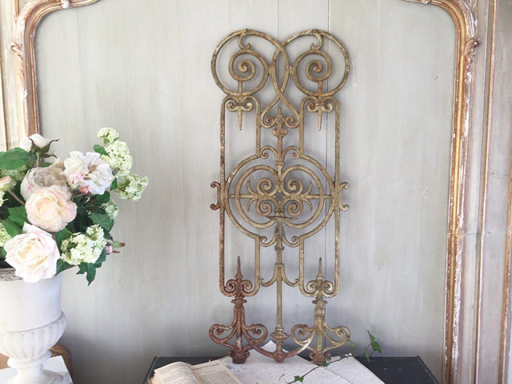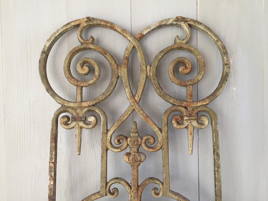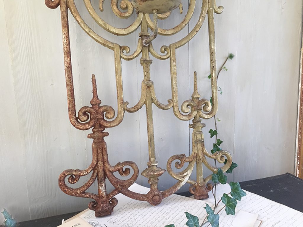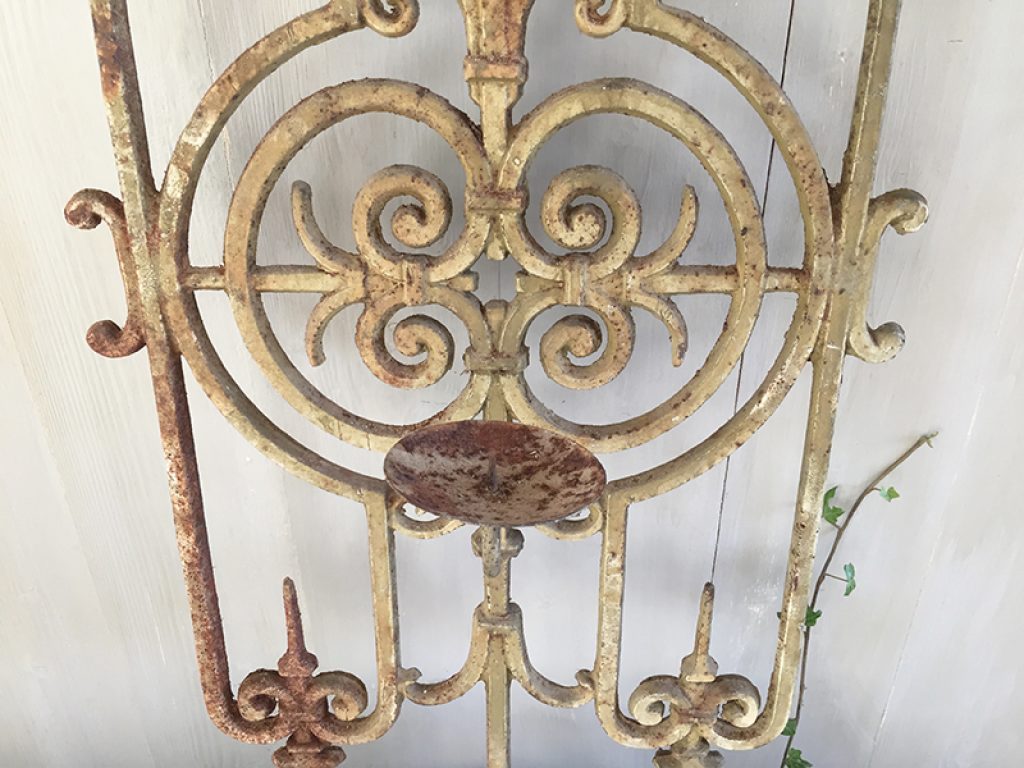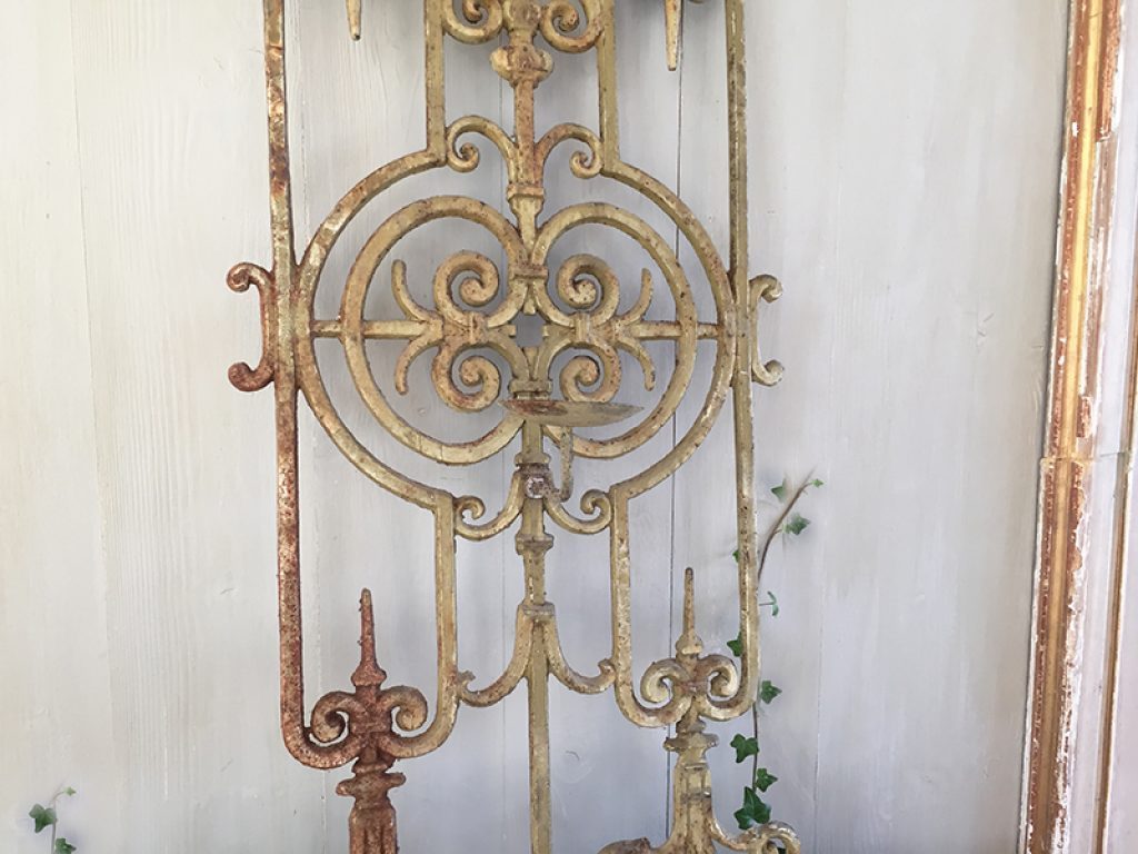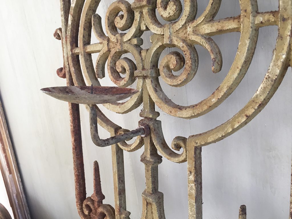 Ancienne grille en fonte avec jolie patine laissée par le temps, agrémentée d’un bras pour poser une bougie.
