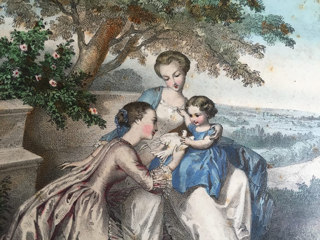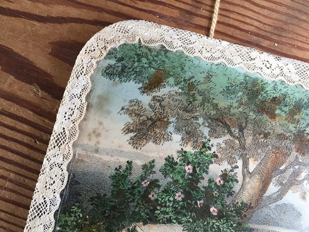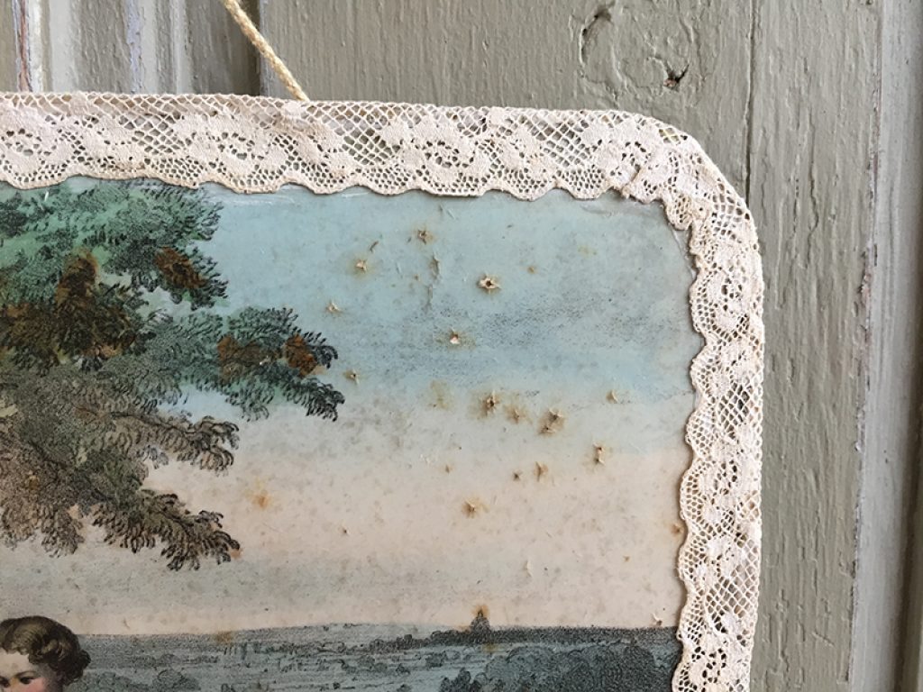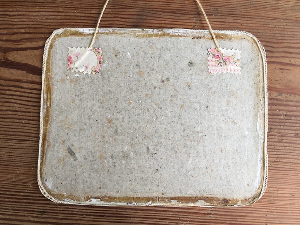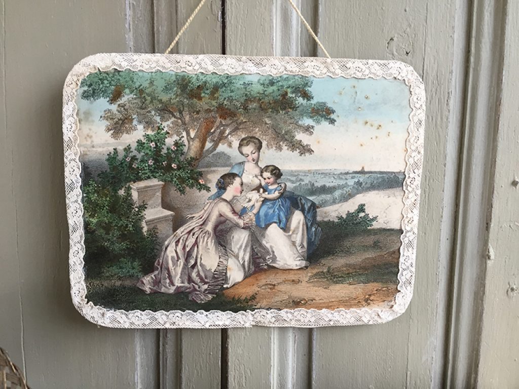 Ancien grand couvercle de boite en carton recouvert de papier glacé au charmant décor romantique, bordé de dentelle et paré d’une cordelette et attache au dos pour l’accroche. Petites taches et traces d’usage