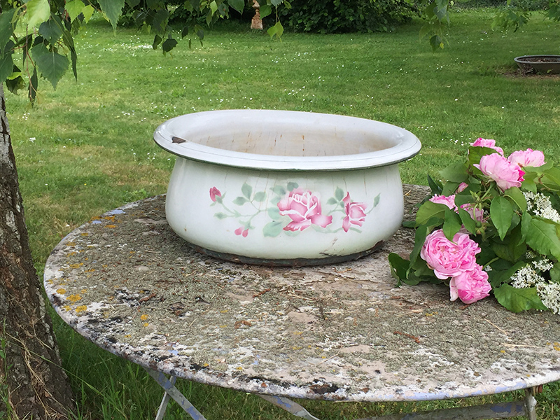 Ancienne grande jardinière émaillée, au joli décor de roses. Le fond est en mauvais état, ce qui permet d’y planter directement des fleurs.