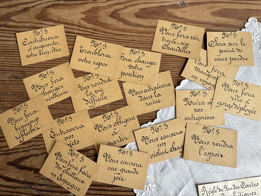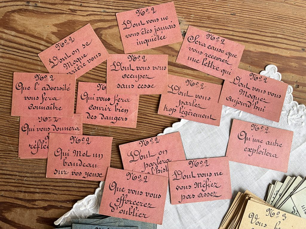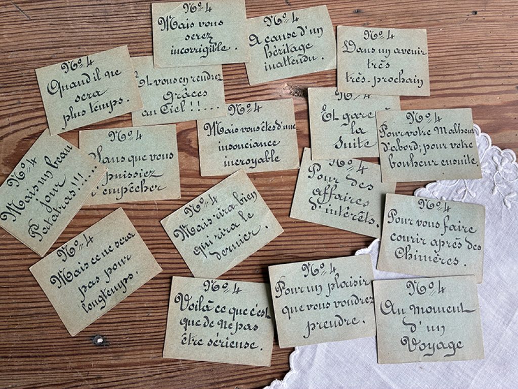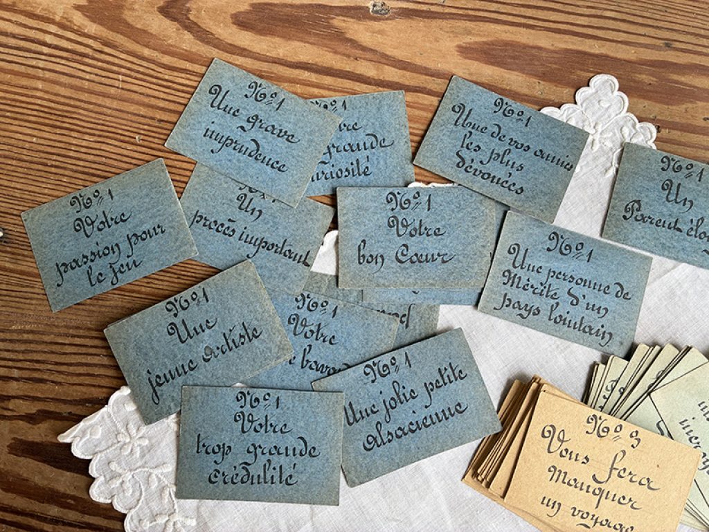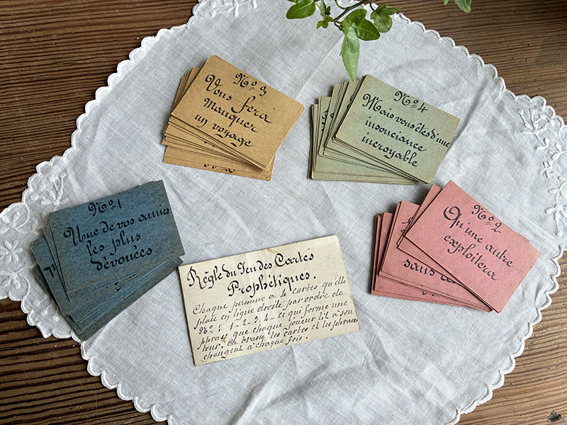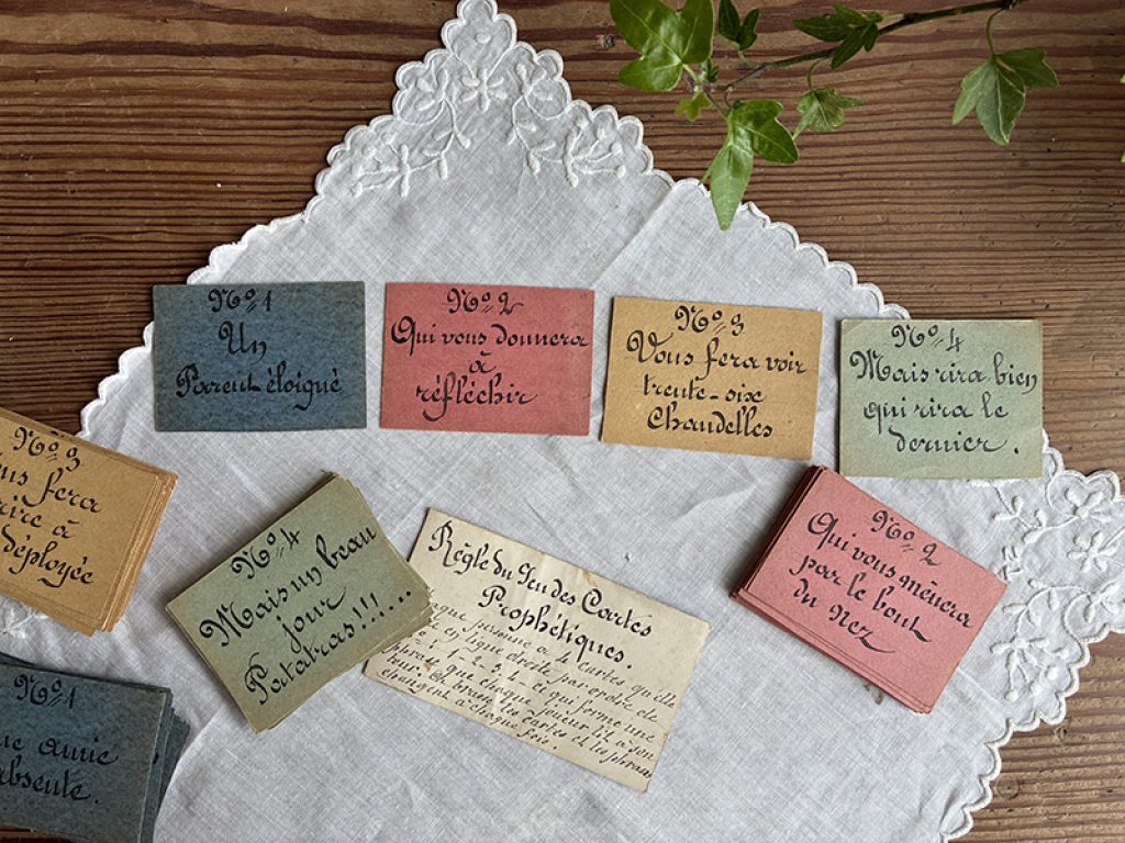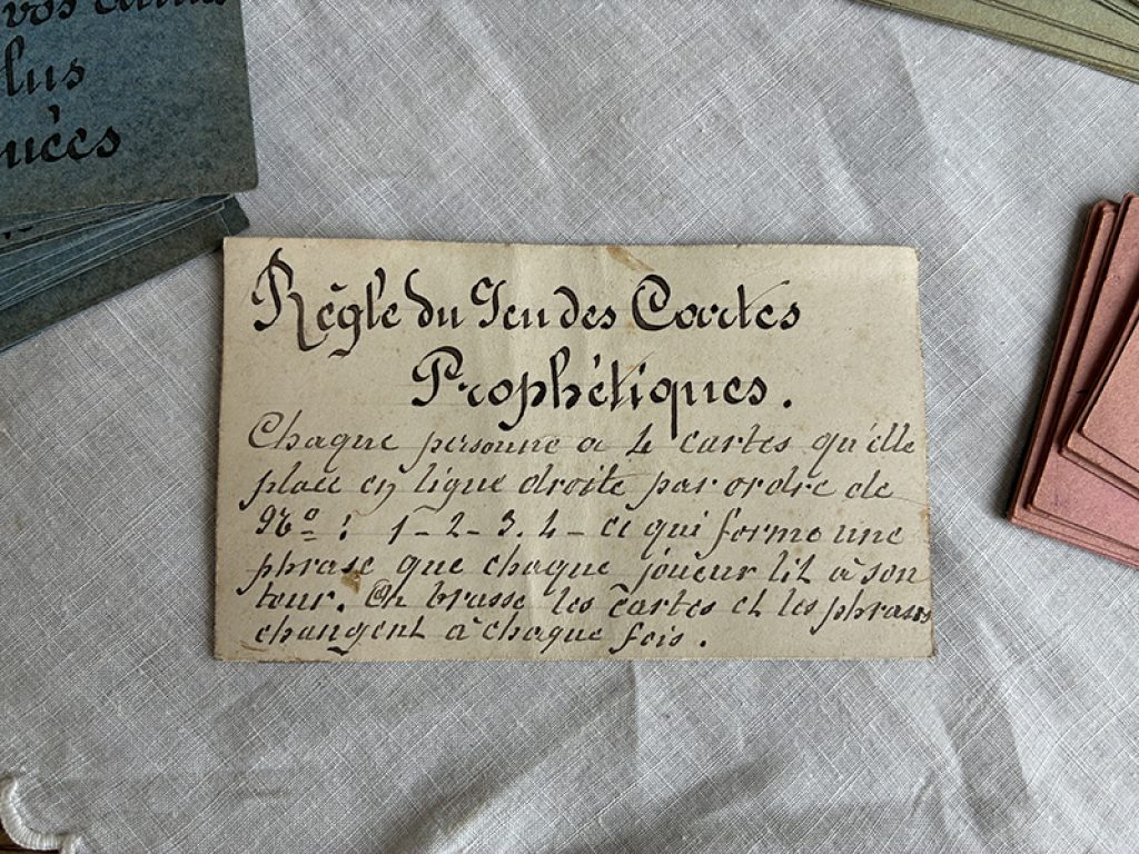 Ancien jeu des cartes prophétiques, composé de cartes entièrement écrites à la main d’une belle écriture à la plume. Chaque joueur doit tirer 4 cartes (1 de chaque couleur) et les placer dans l’ordre des numéros. Cela forme une phrase qui sera lue par chacun. Une date au dos de la règle du jeu : 1870 ? Très drôle (ou pas !)