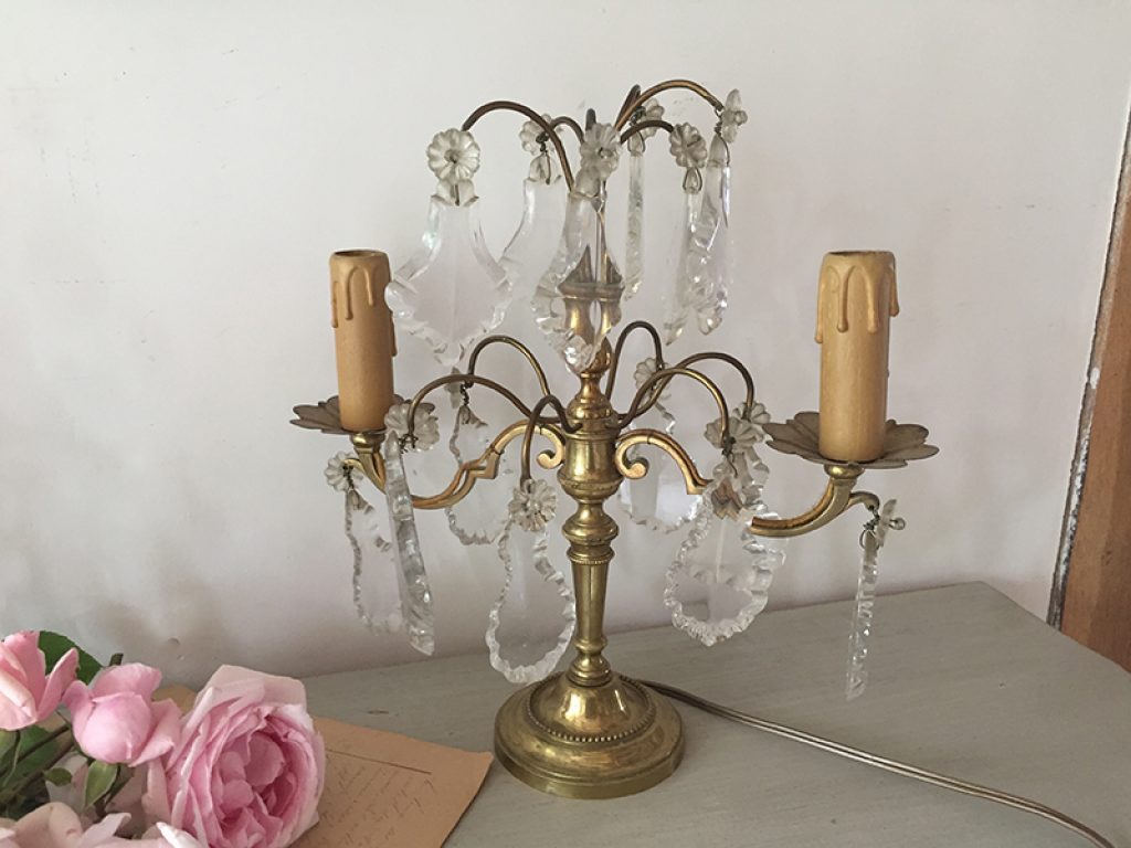 Deux anciennes lampes en métal doré garnies de toutes leurs pampilles, vendues séparément. Fonctionnent avec des ampoules à visser, non fournies. Electricité d’origine. Hauteur 31 cm
