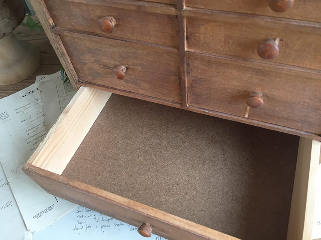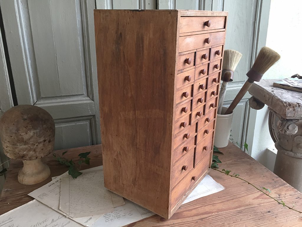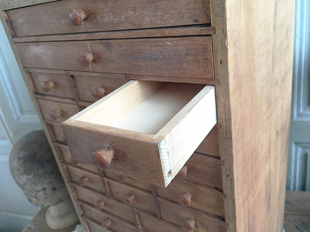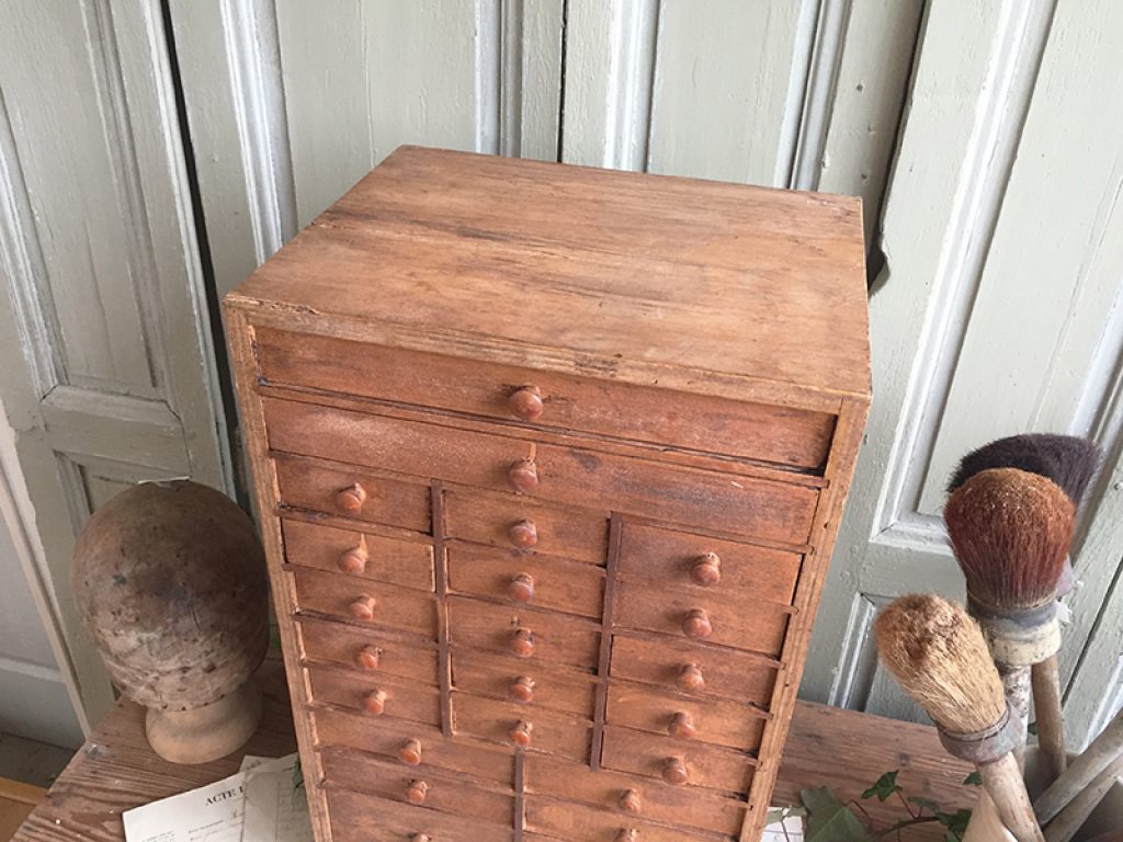 Ancien petit meuble d’horloger avec 24 tiroirs, très utile pour le petit bricolage ou la mercerie !
