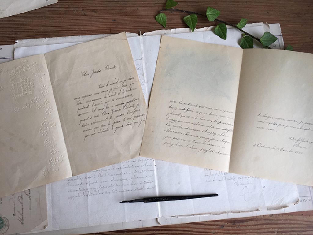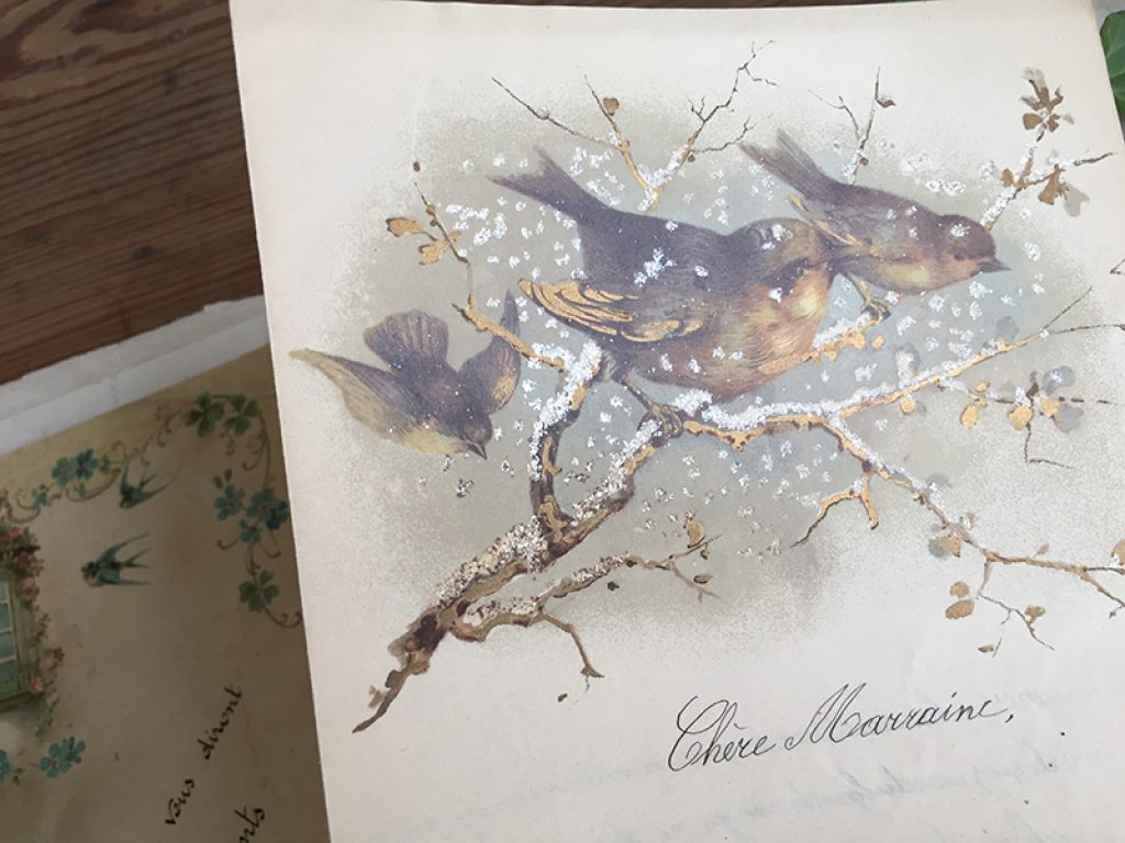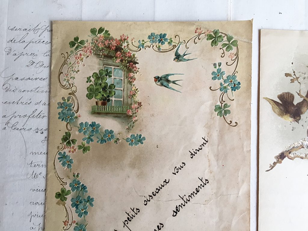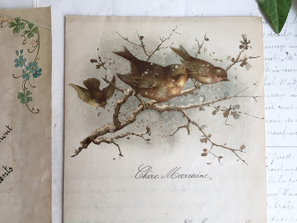 Deux anciennes lettres écrites à la main sur du joli papier décor oiseaux, vendues séparément. 21 x 14 cm environ