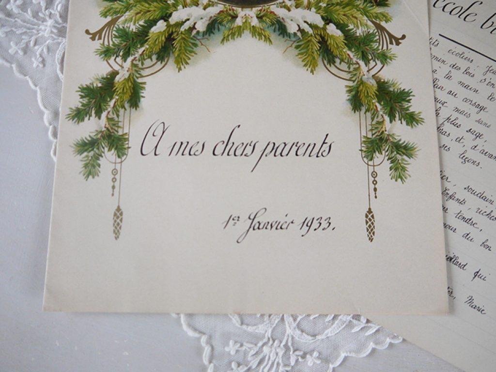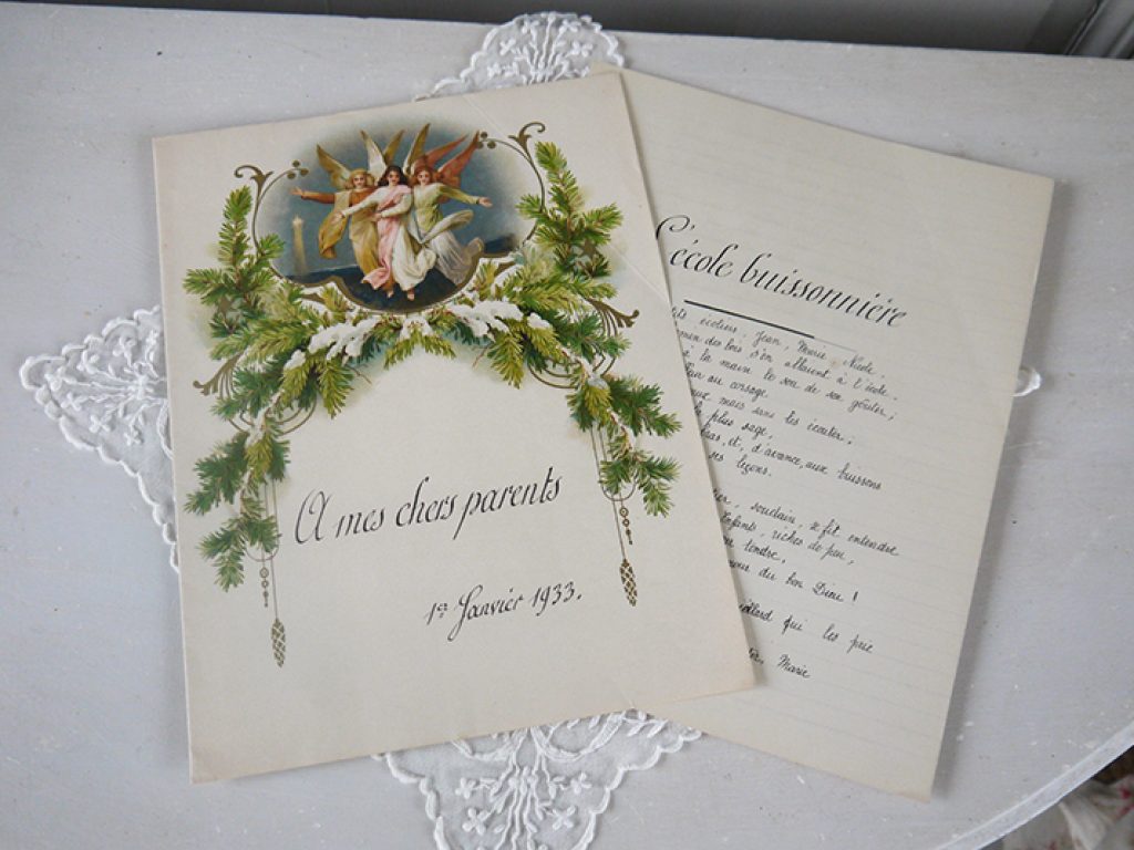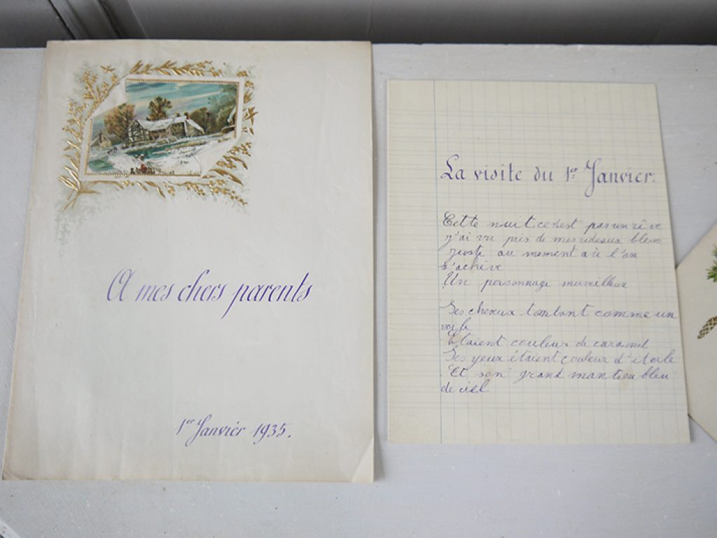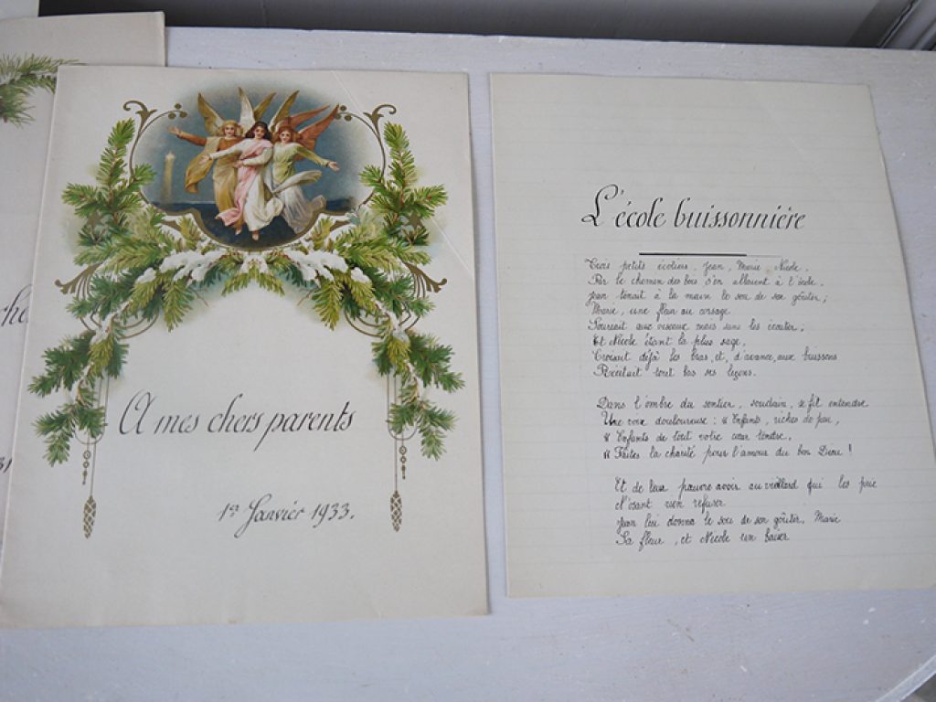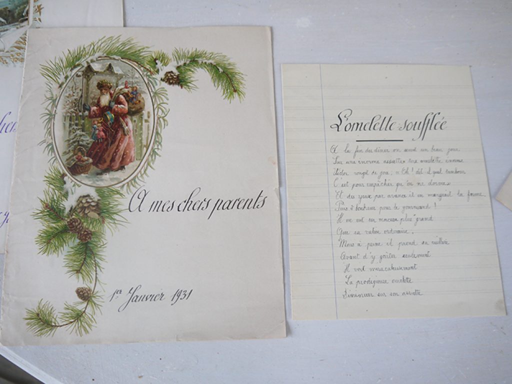 Trois anciennes pochettes (feuilles doubles ) au très charmant décor d’hiver en chromo, avec inscriptions » A mes chers parents » garnies chacune d’une jolie poésie écrite à la main par un enfant. Vendues séparément. 21 x 27.5 cm