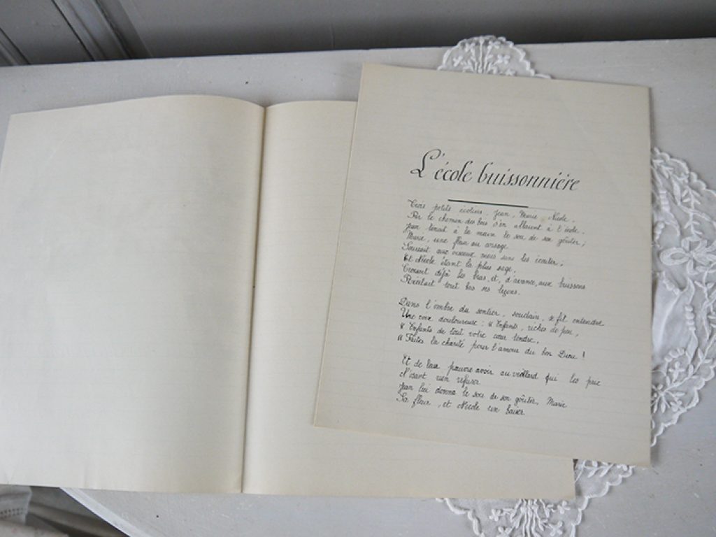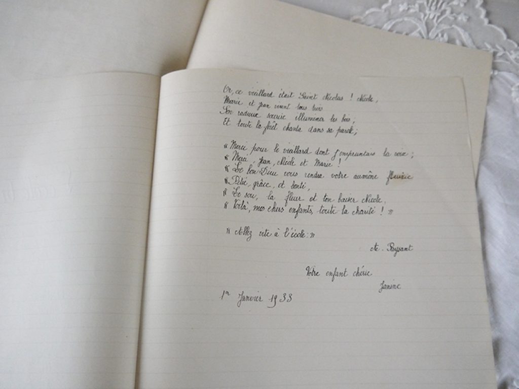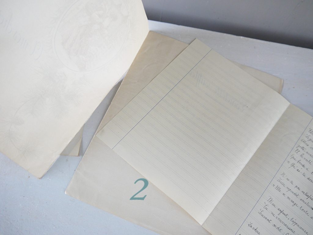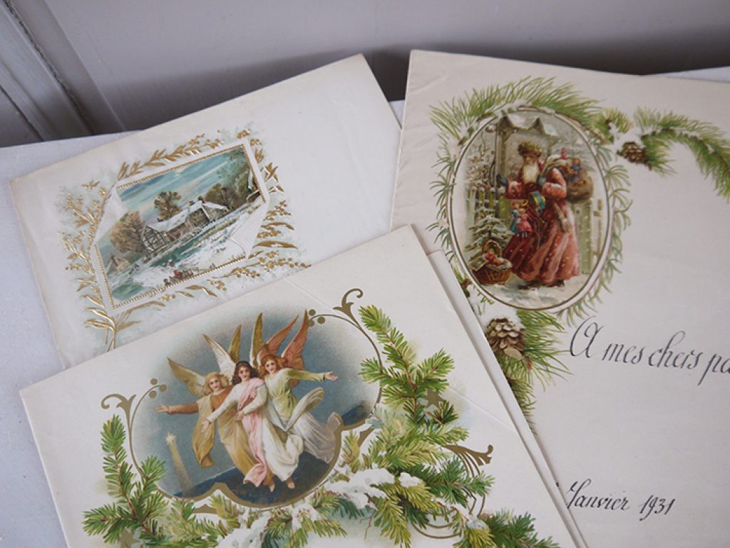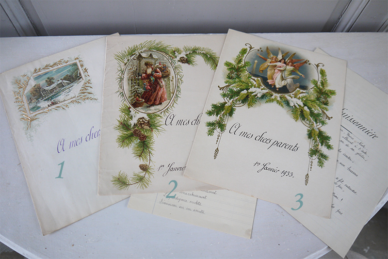 Trois anciennes pochettes (feuilles doubles ) au très charmant décor d’hiver en chromo, avec inscriptions » A mes chers parents » garnies chacune d’une jolie poésie écrite à la main par un enfant. Vendues séparément. 21 x 27.5 cm