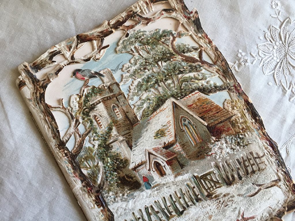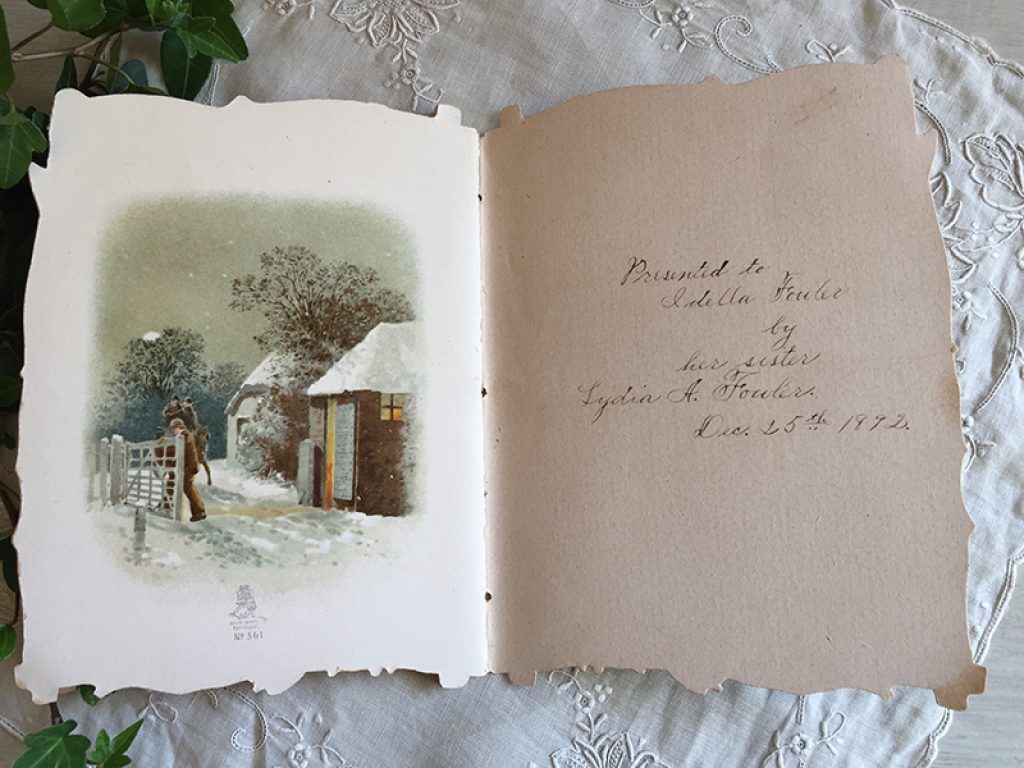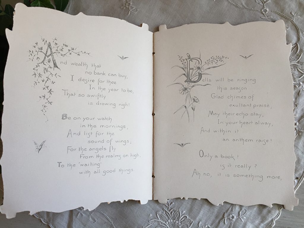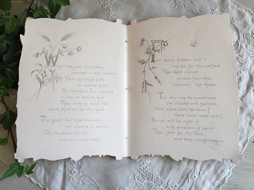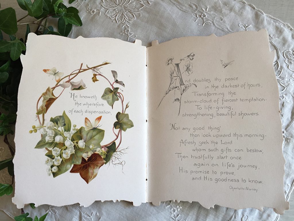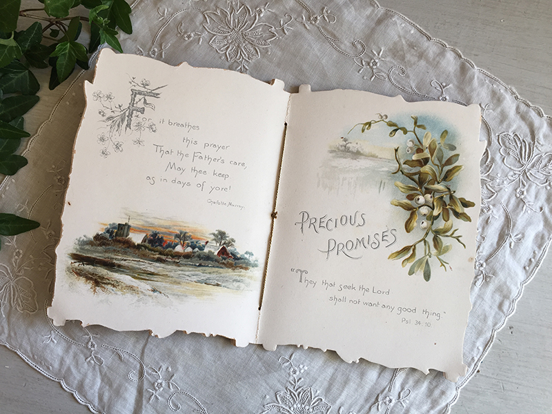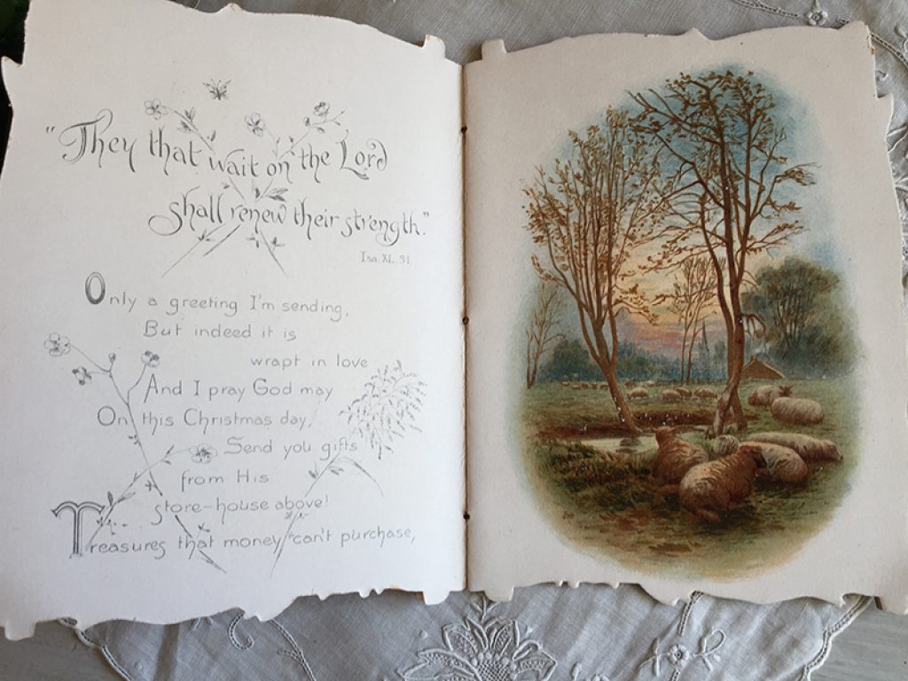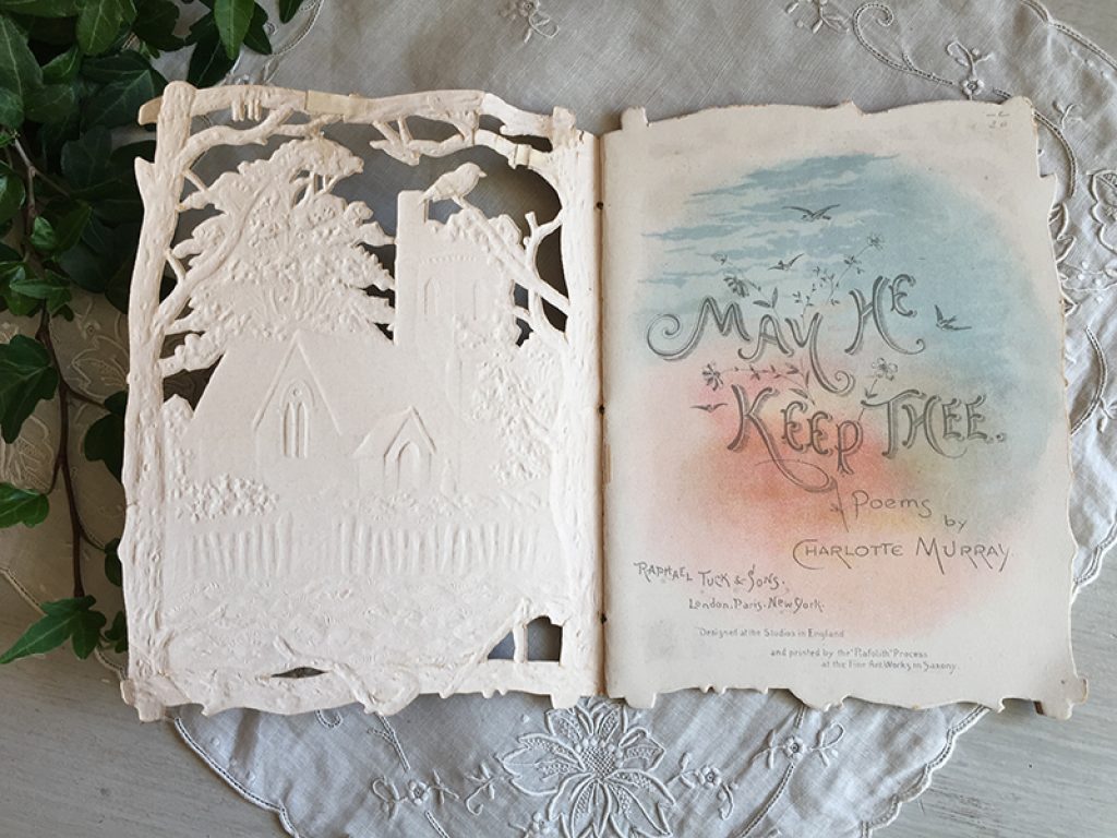 Adorable petit livre ancien , éditeur Raphael Tuck « May he keep thee » se six pages + couverture. Jolies illustrations en couleur. Annotation manuscrite sur la dernière page, datée de 1892. Petites taches au dos.