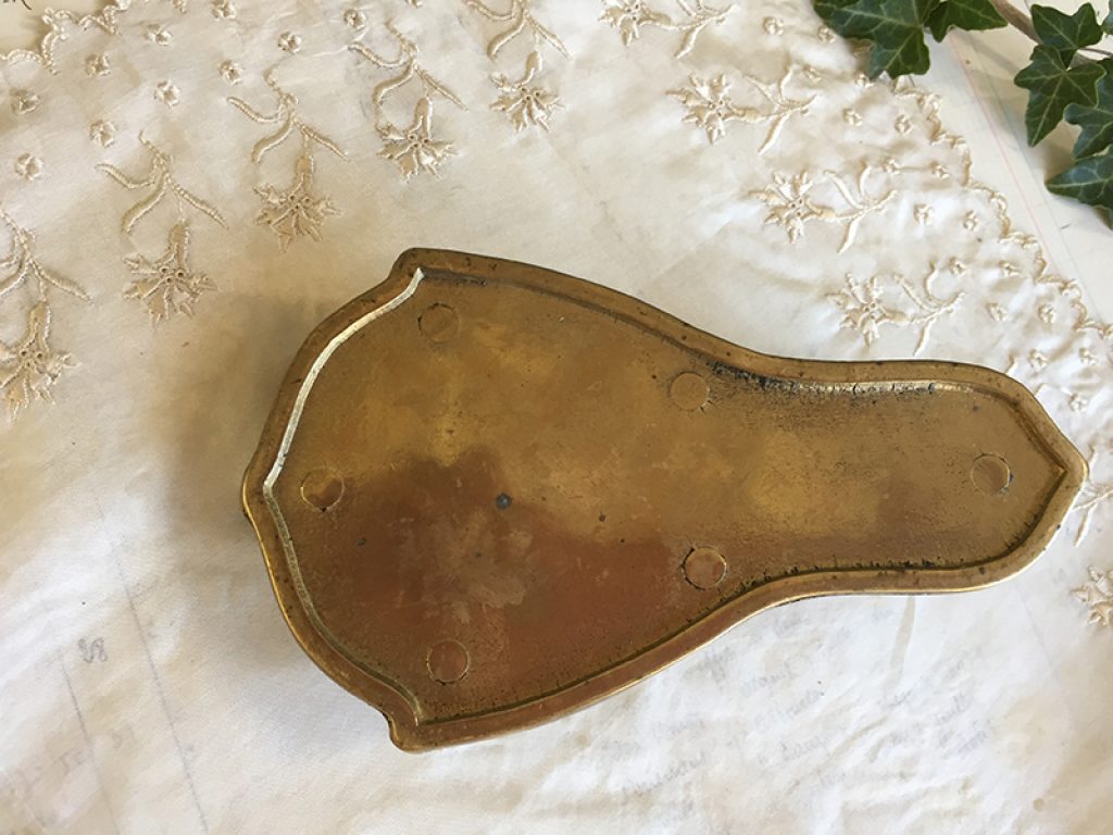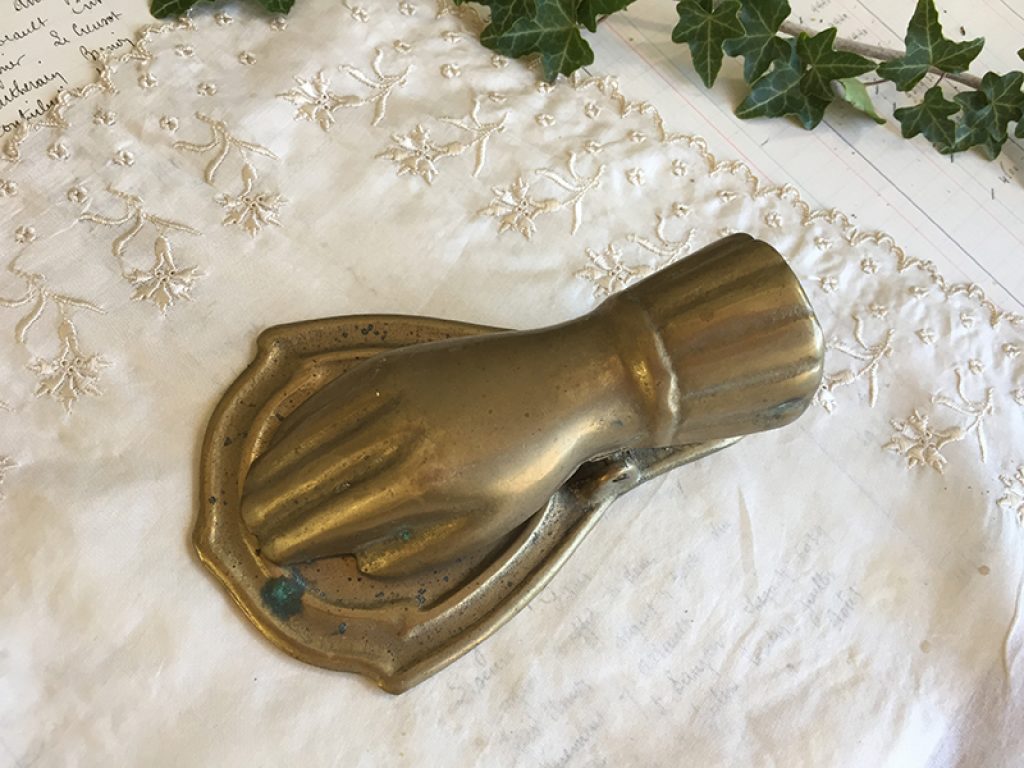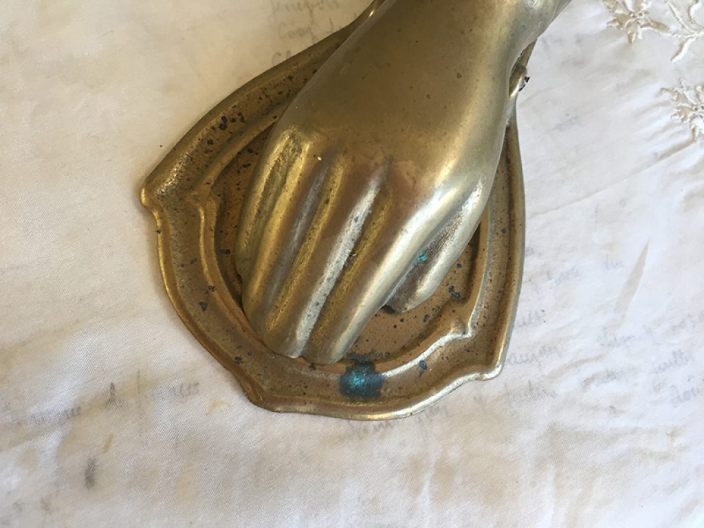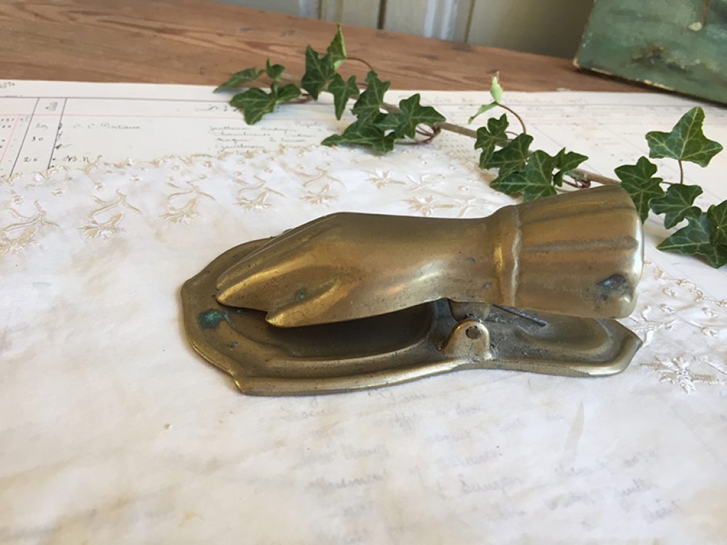 Ancienne main pince document en laiton comportant une petite trace d’oxydation due à son âge.