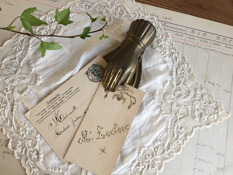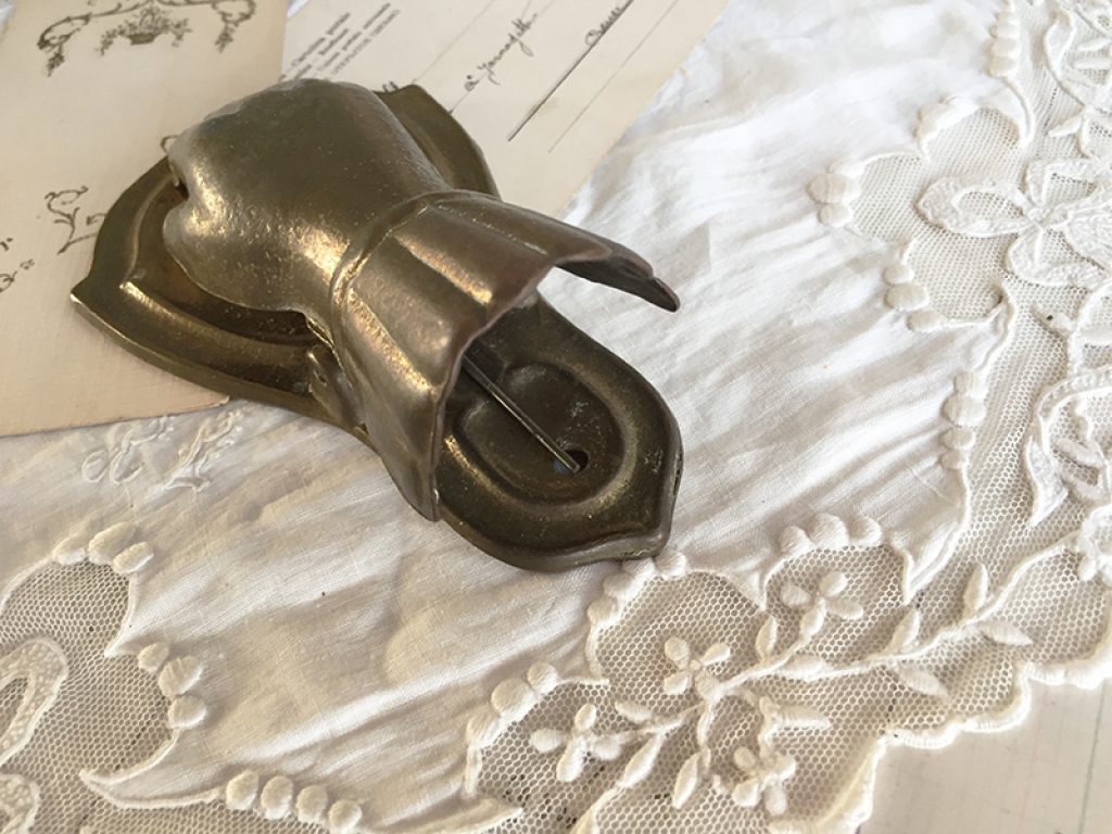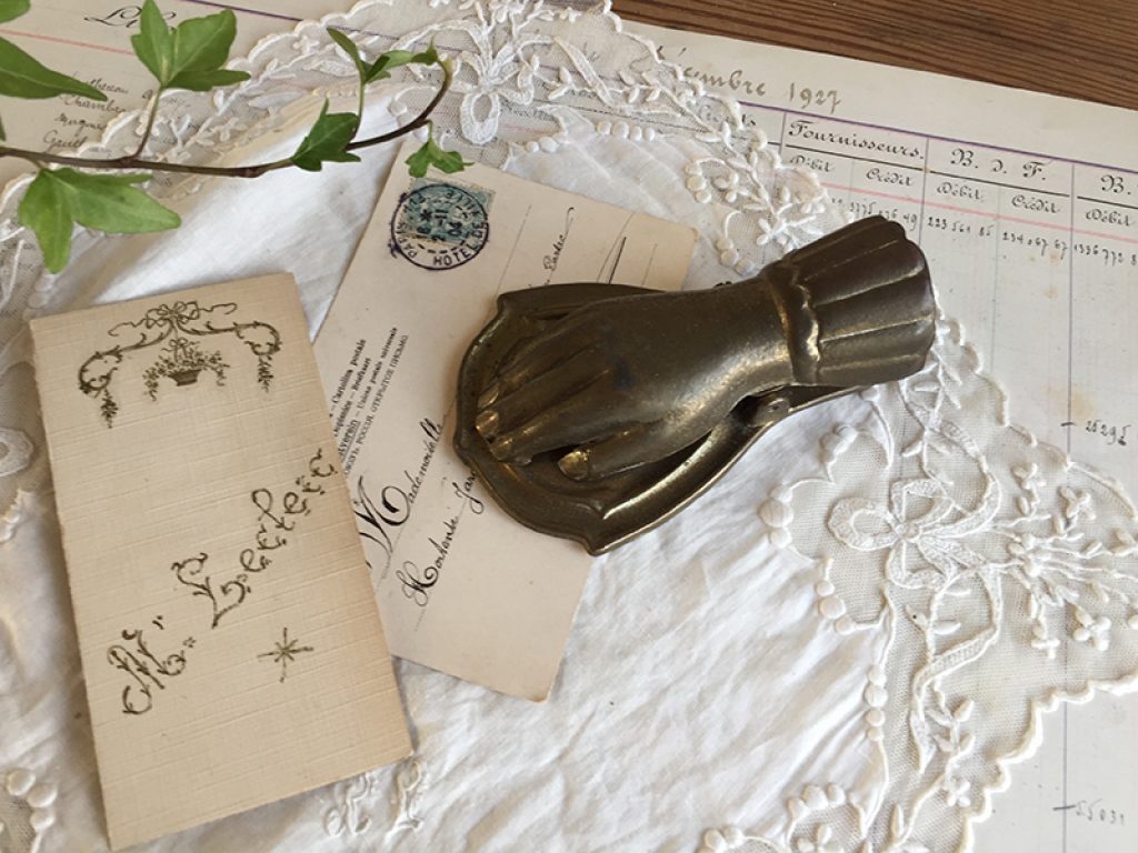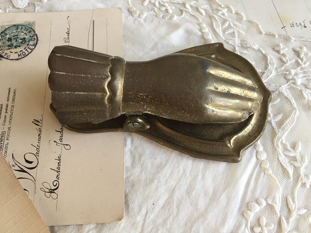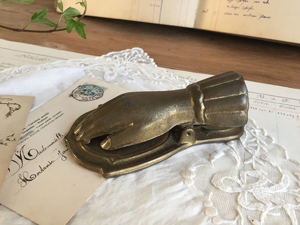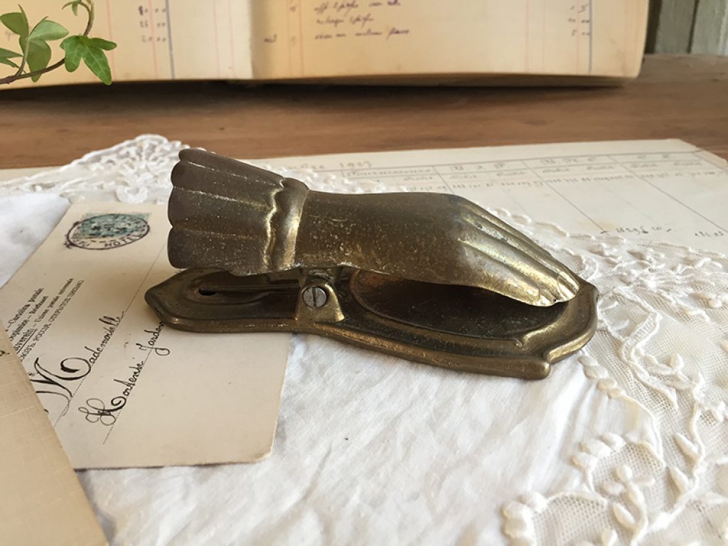 Ancienne pince à document en forme de main en métal doré, à utiliser aussi pour accrocher une photo, image …