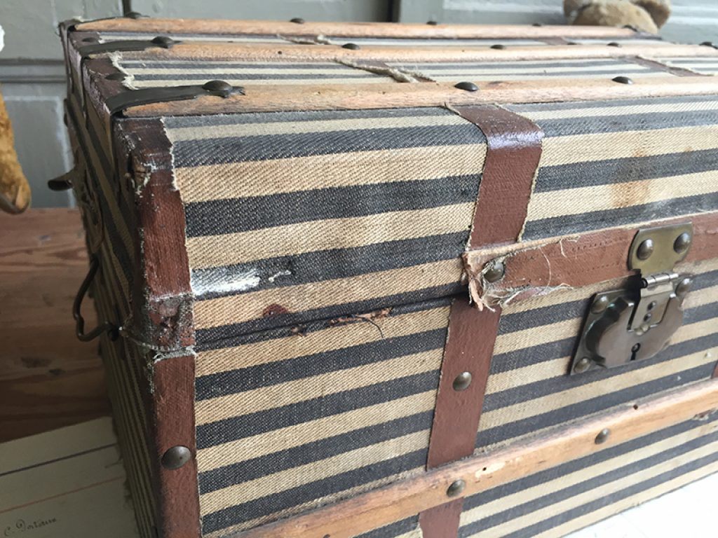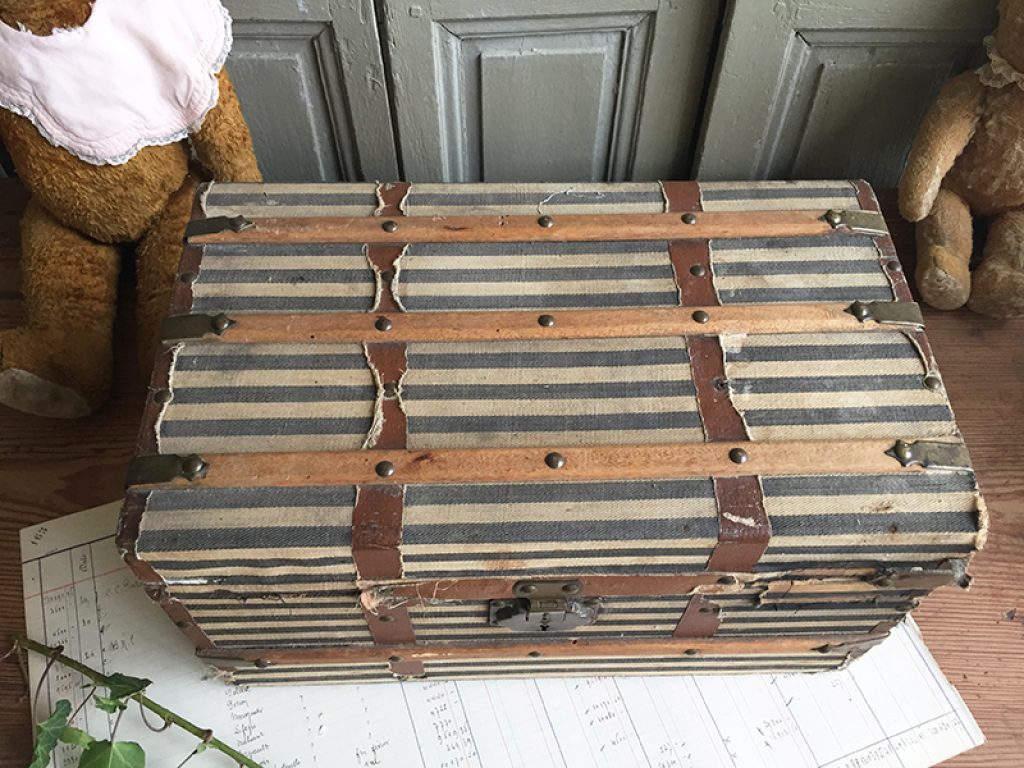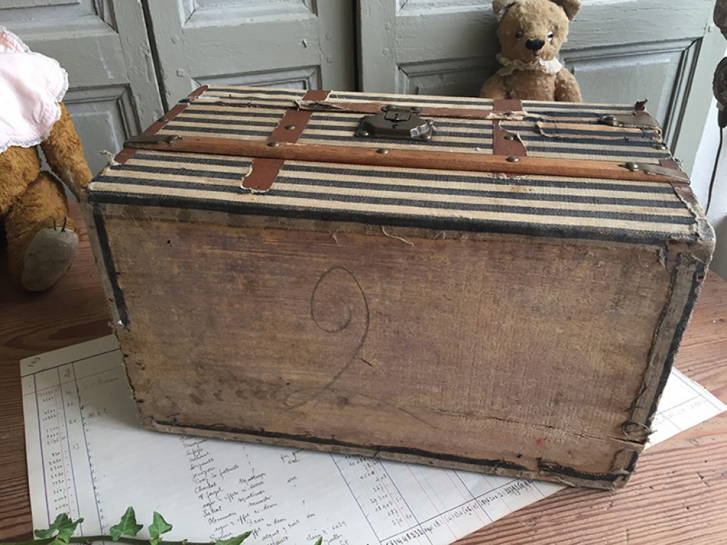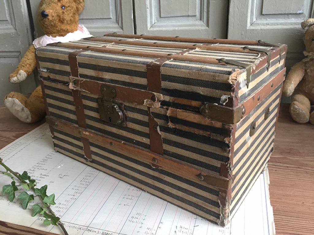 Adorable petite malle ancienne pour poupée, réplique exacte des grands modèles, comportant des manques et traces d’usage, mais devenue difficile à trouver ! manque une poignée sur un coté, pas de clé. Parfaite pour les rangements de petits vêtements ou mercerie.