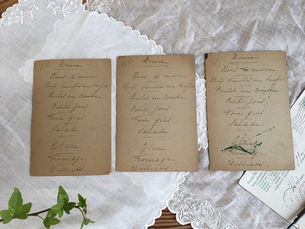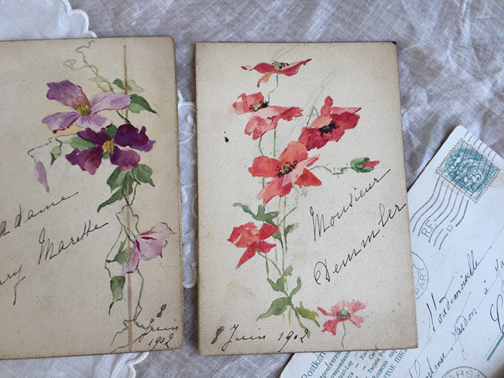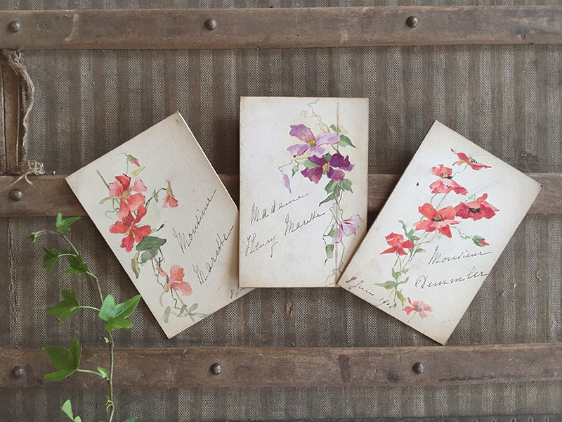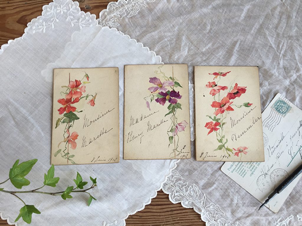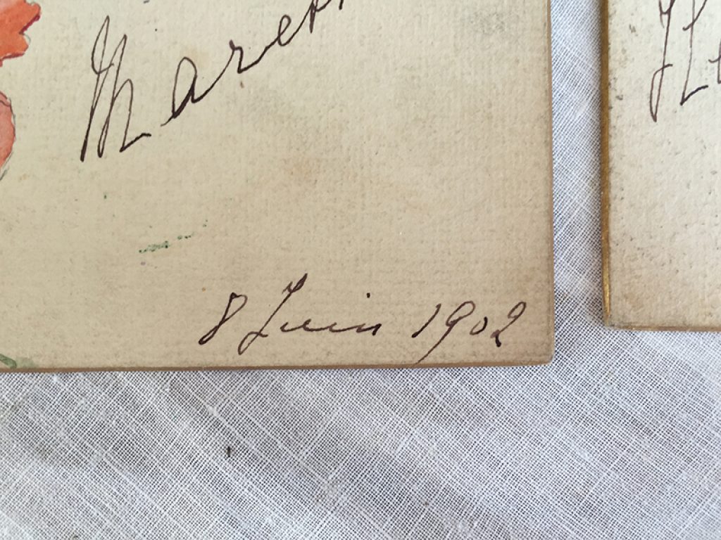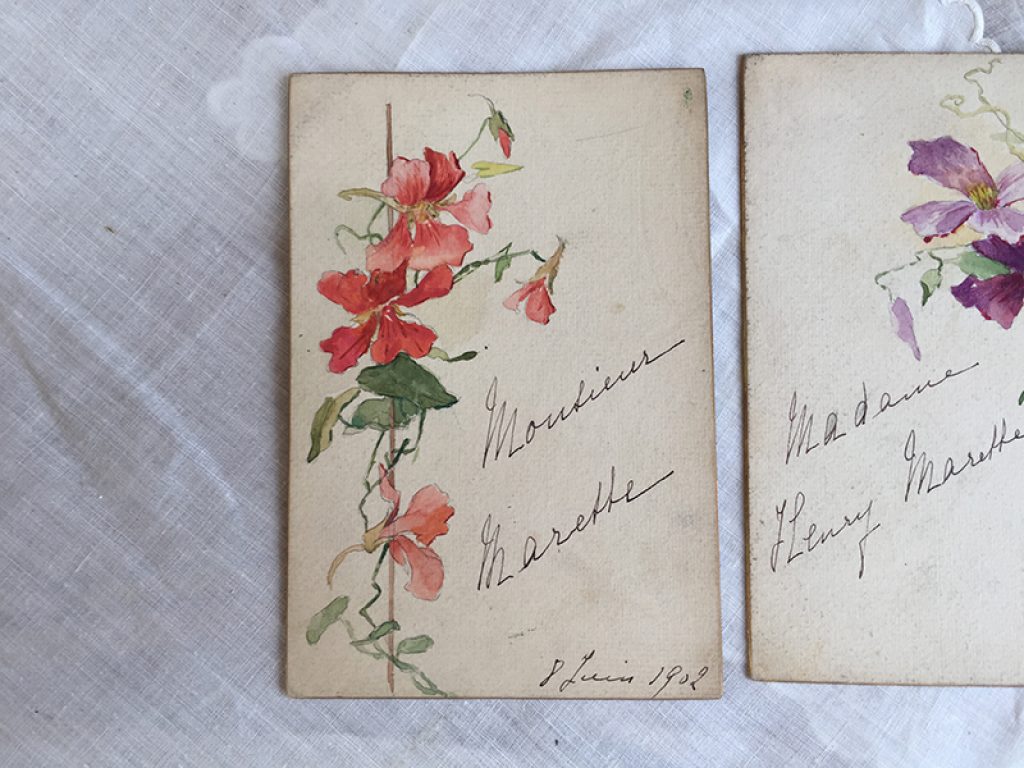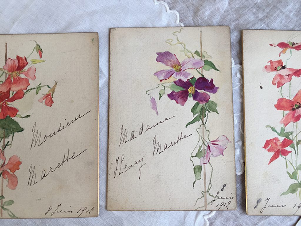 Trois anciens menus cartonnés peints et écrits à la main,, datés de 1902.Vendus séparément, jolis décors fleuris.