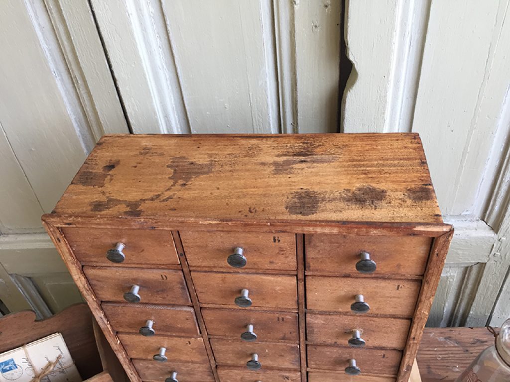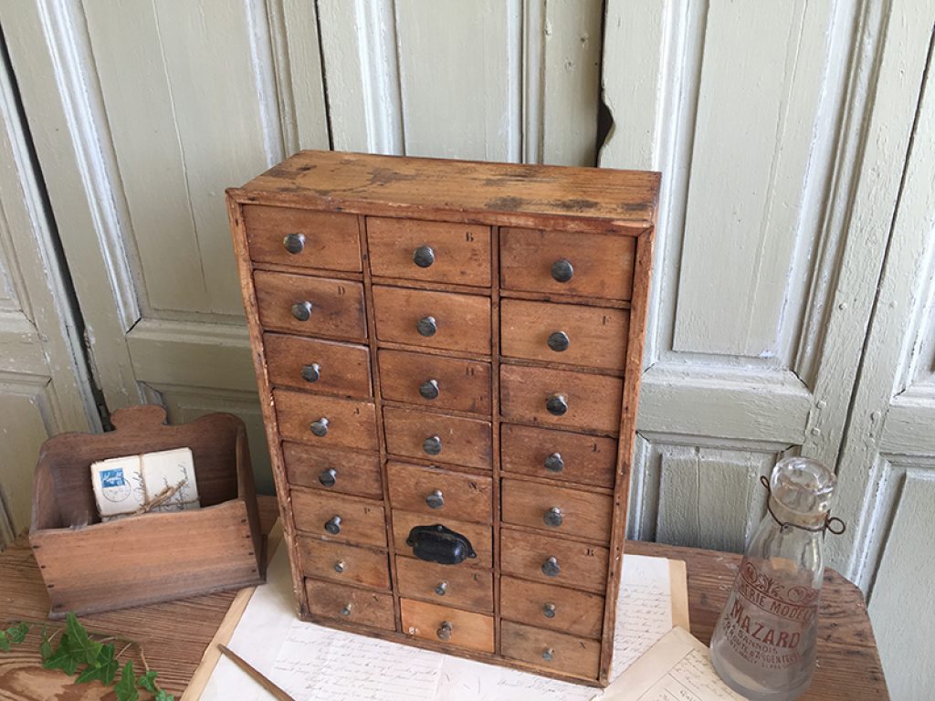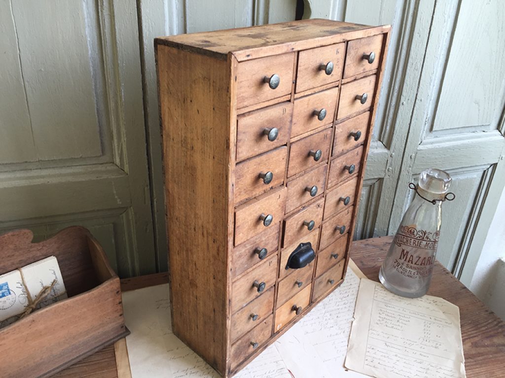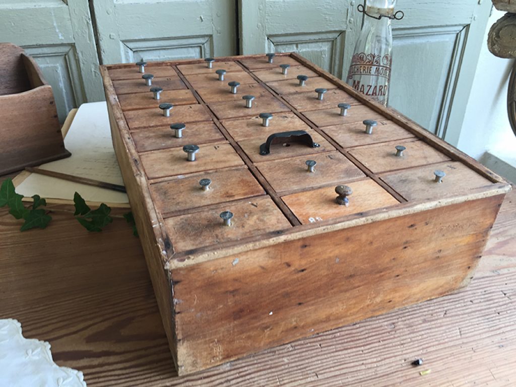 Petit meuble de métier ancien, avec ses 24 tiroirs dont un garni d’une jolie poignée coquille, les autres boutons sont en alu légèrement noirci ou faits avec des rivets, 1 est en bois. Pratique pour les petits rangements !