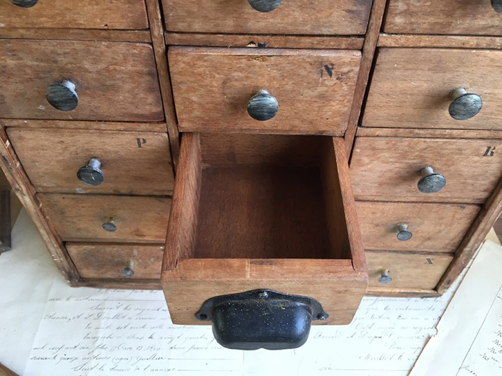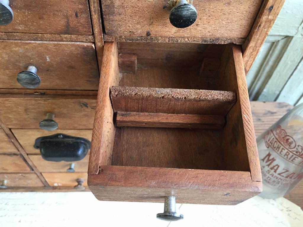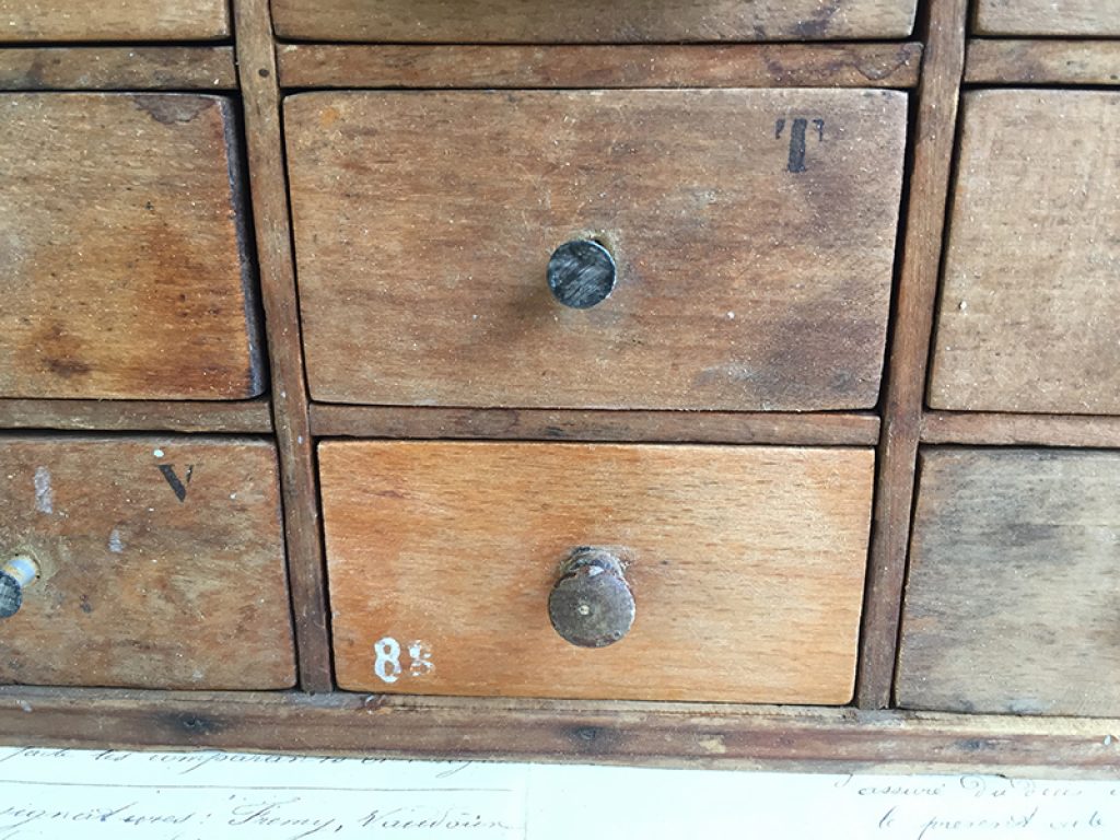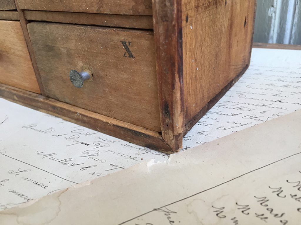 Taches d’usage, léger manque sur le bord. Trois tiroirs sont compartimentés, certains ont des lettres au pochoir.