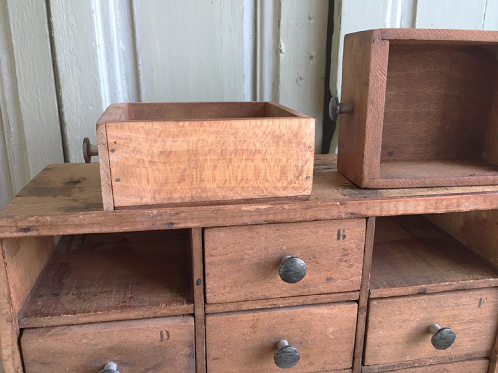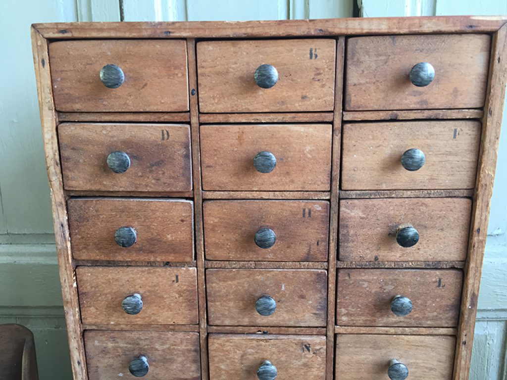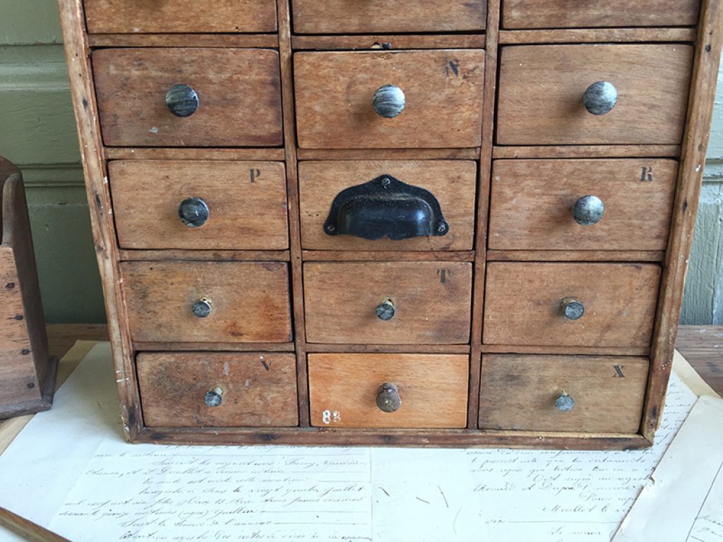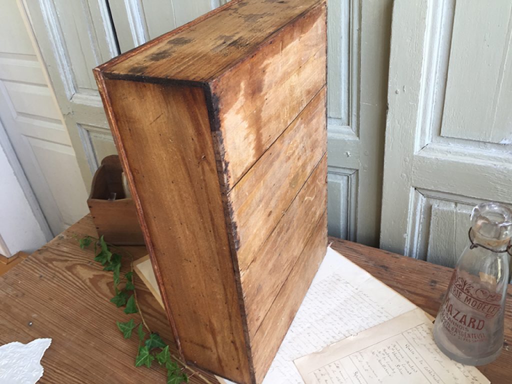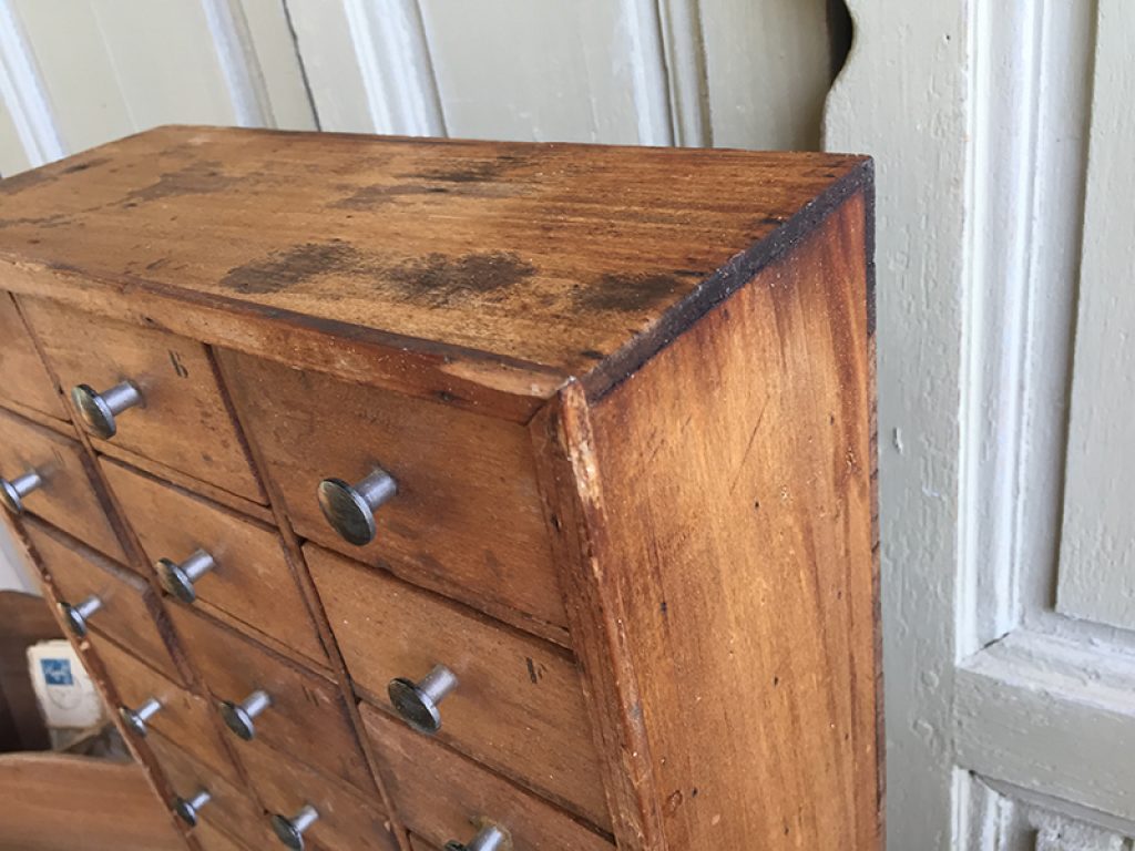 Taches d’usage, léger manque sur le bord. Trois tiroirs sont compartimentés, certains ont des lettres au pochoir.