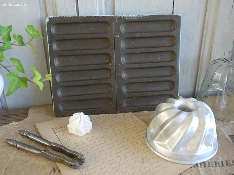 Deux anciens moules à gâteaux, vendus séparément. – Moule à boudoirs en fer, le coté bleu semble avoir été peint. Pour déco ! 25 x 19 cm – Moule en alu, diamètre 11 cm VENDU Hauteur 7 cm