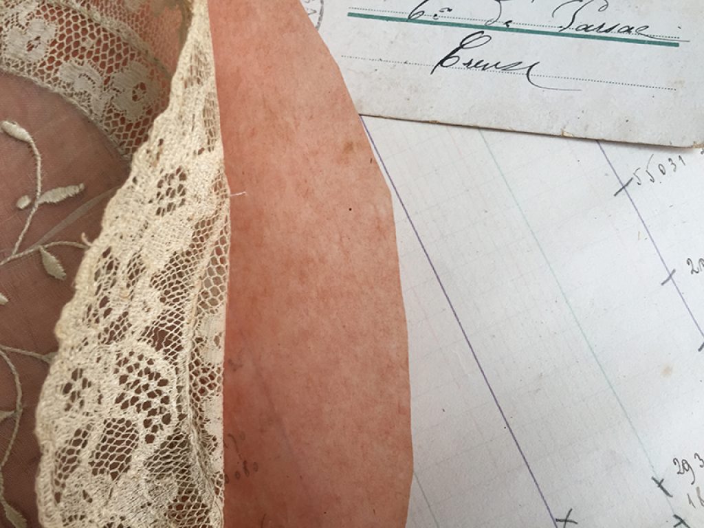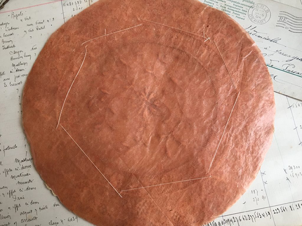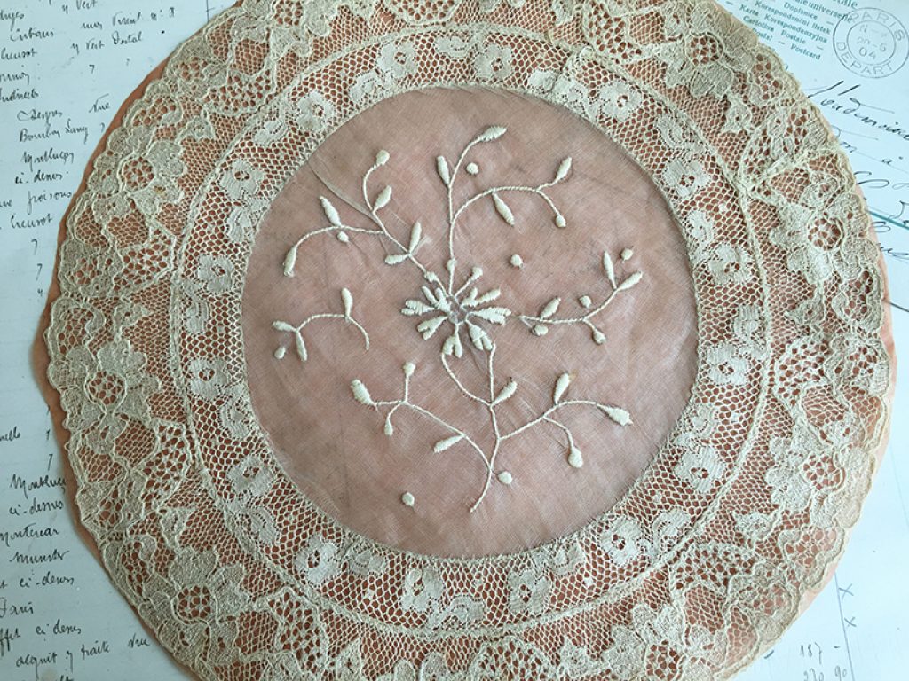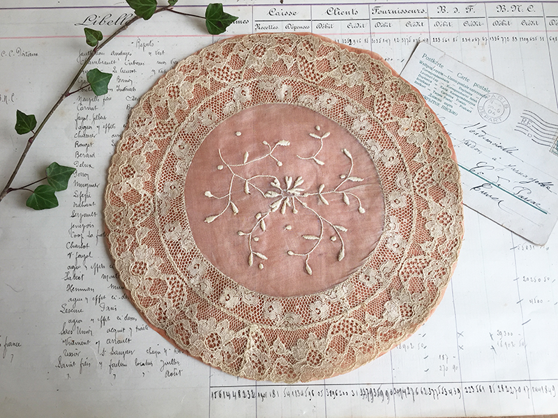 Elégant napperon ancien, jamais utilisé, encore cousu sur son support en papier rose.