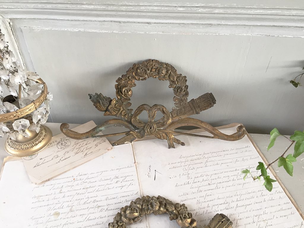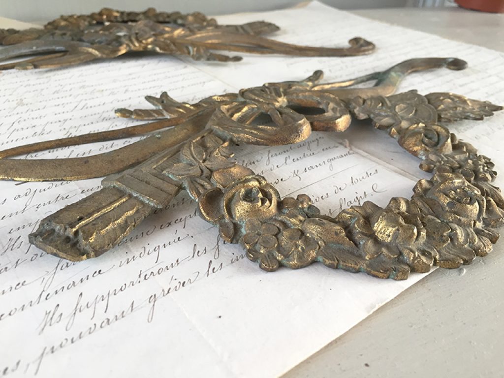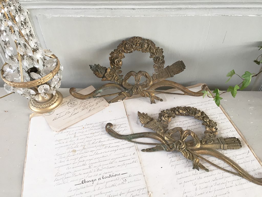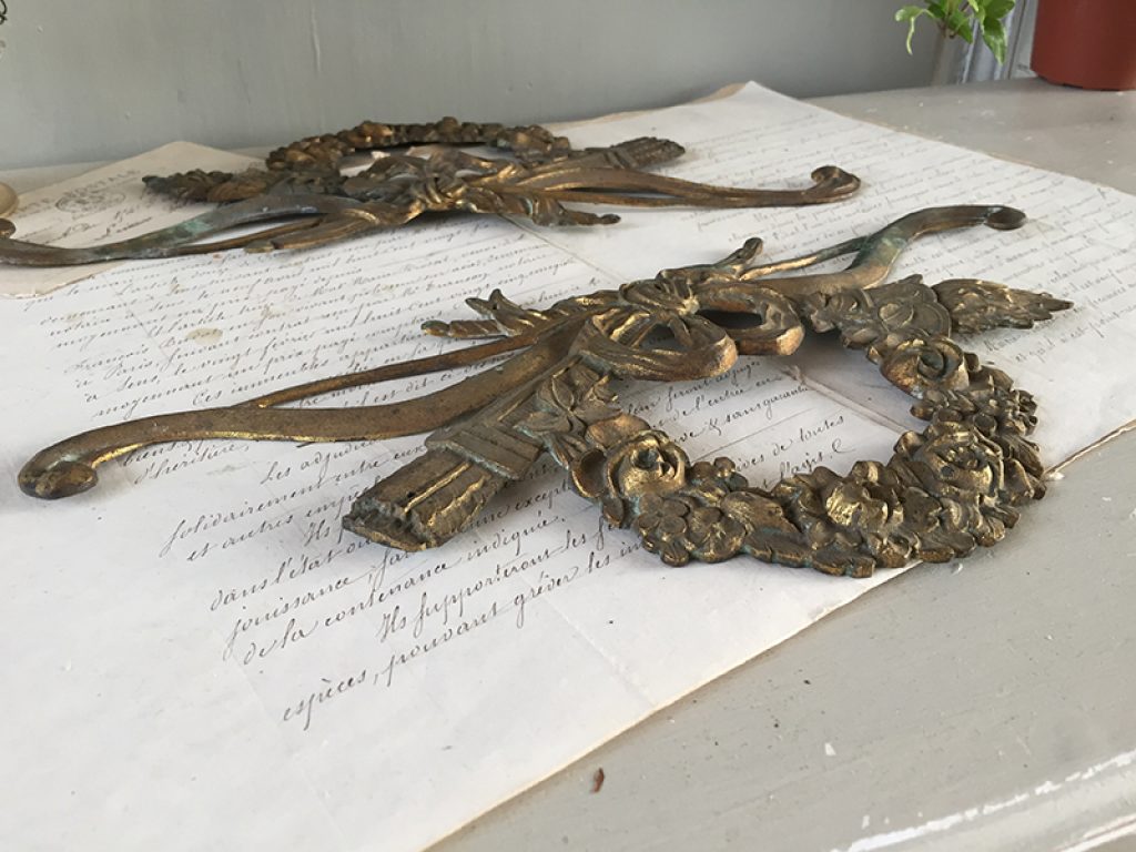 Deux anciens ornements en bronze, vendus à l’unité. Joli décor Louis XVI, parfaits pour agrémenter un meuble, une boiserie.. selon les envies ! Traces d’oxydation