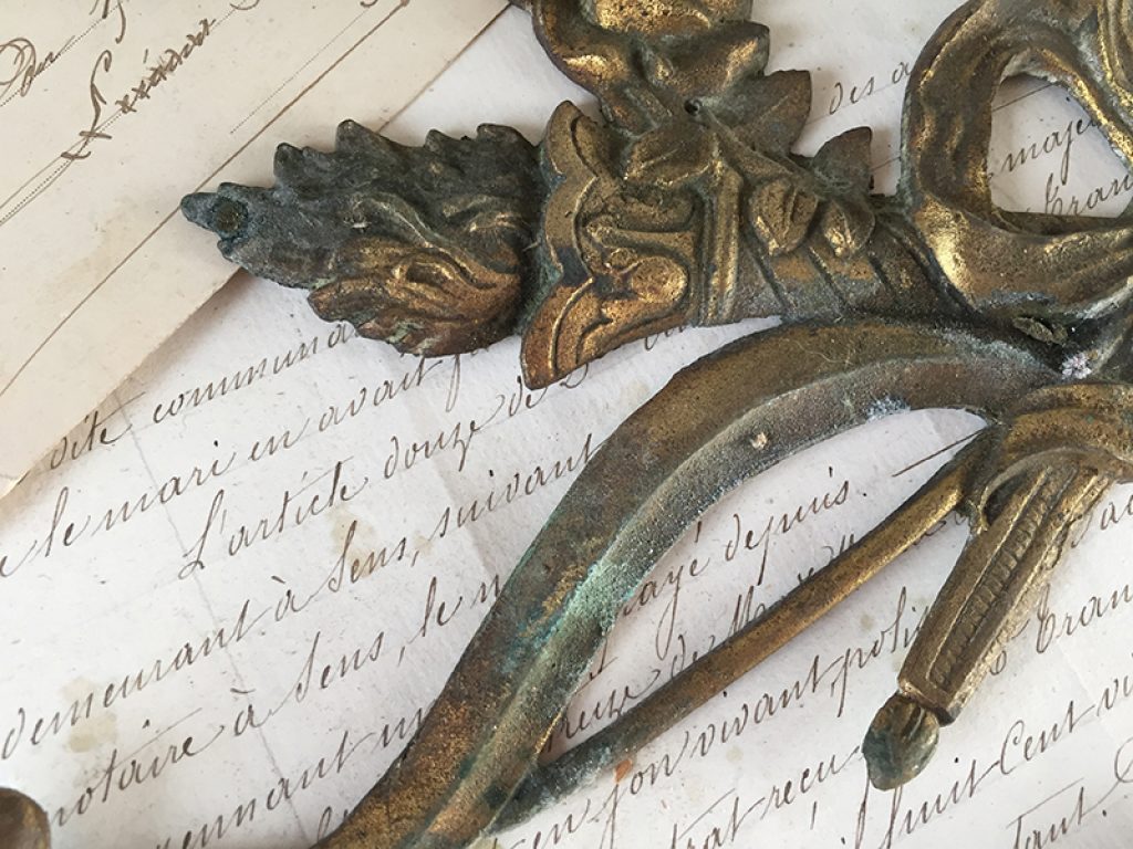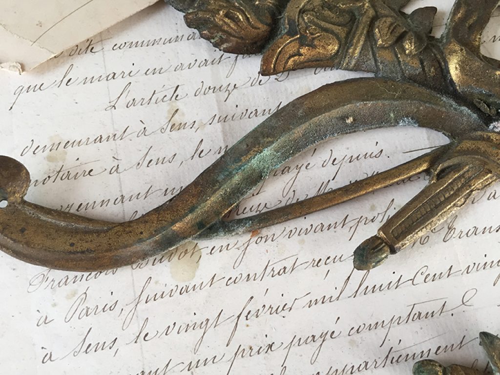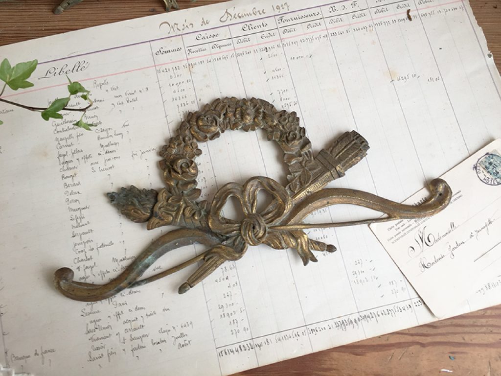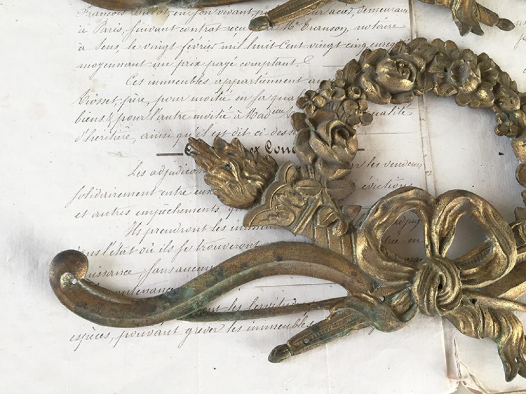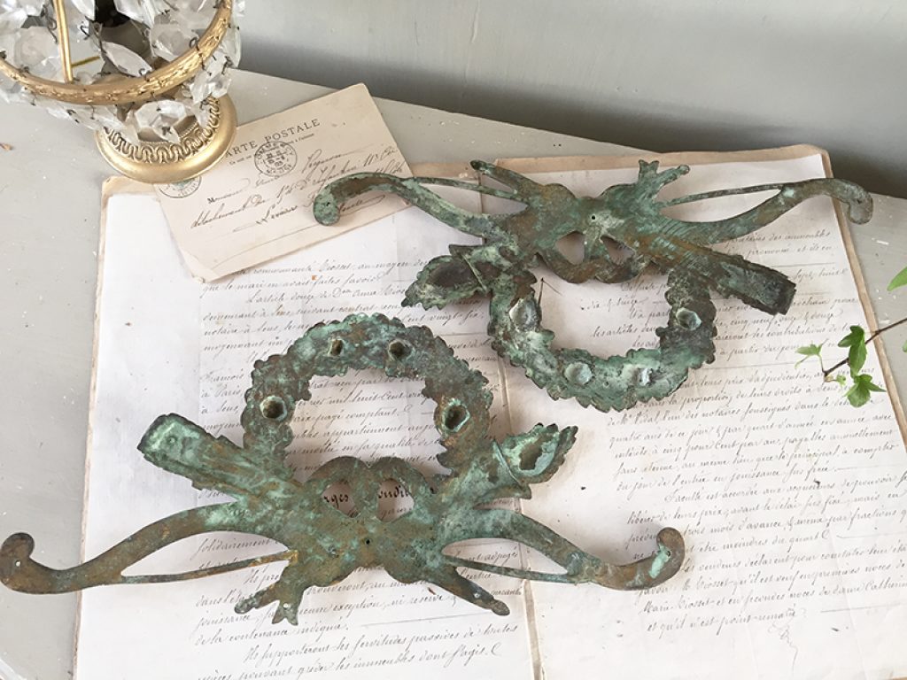Deux anciens ornements en bronze, vendus à l’unité. Joli décor Louis XVI, parfaits pour agrémenter un meuble, une boiserie.. selon les envies ! Traces d’oxydation