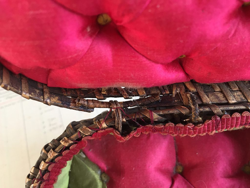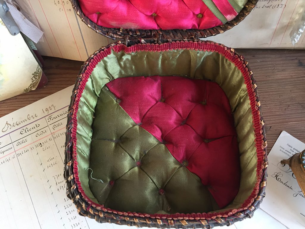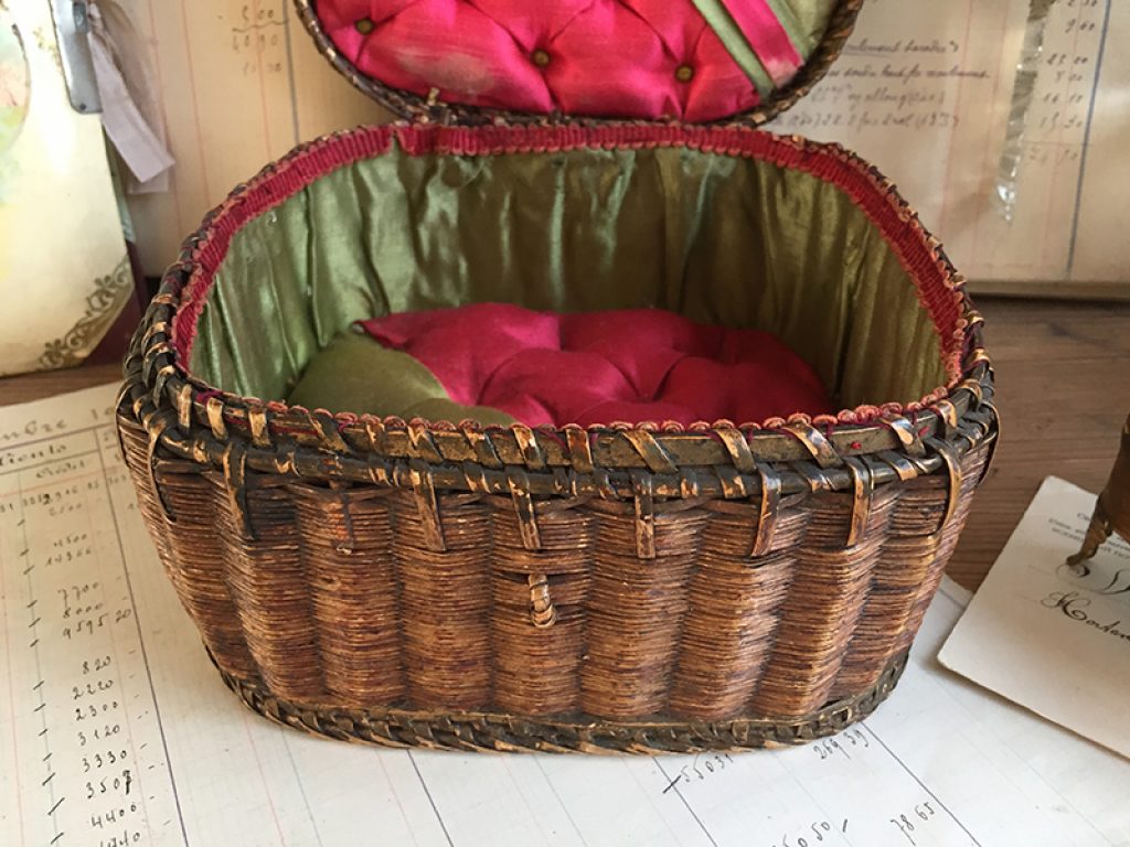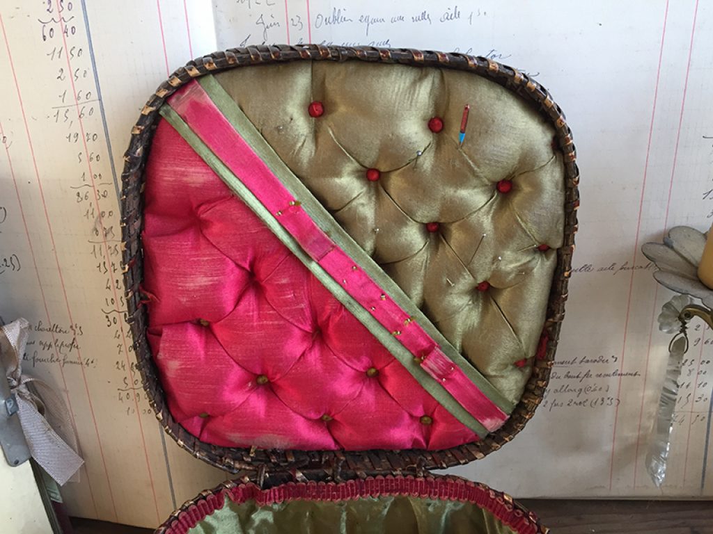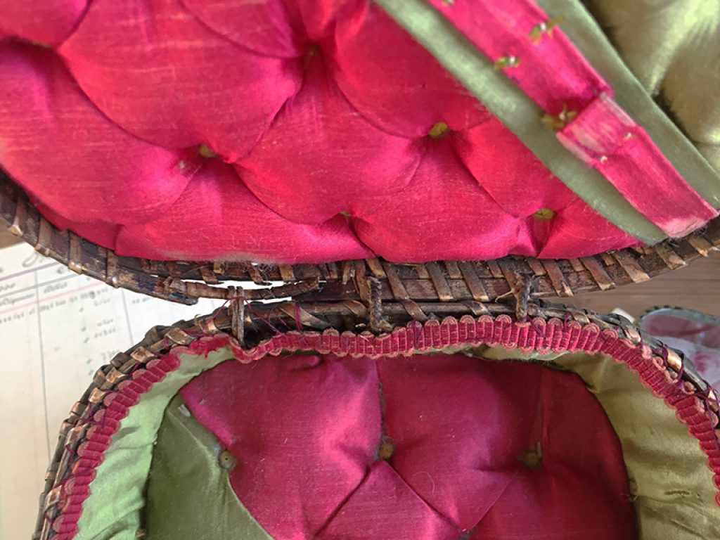 Jolie petite corbeille à ouvrage avec intérieur en soie capitonnée comportant quelques marques d’usures. Pas de système de fermeture, une réparation au niveau d’une charnière.