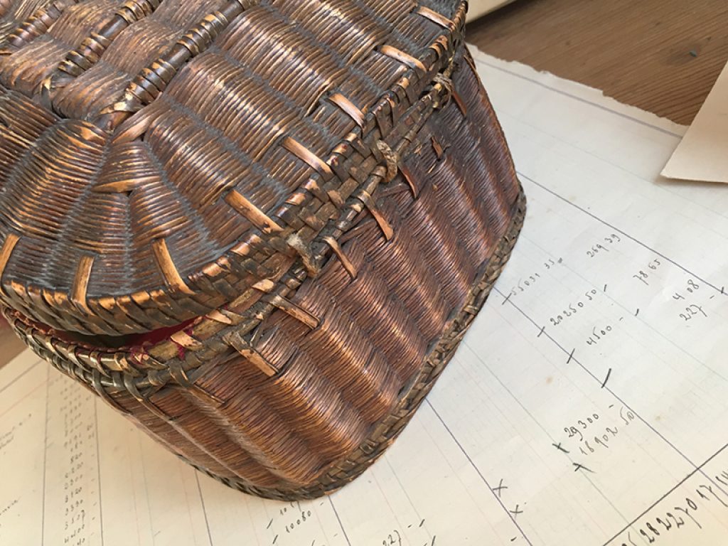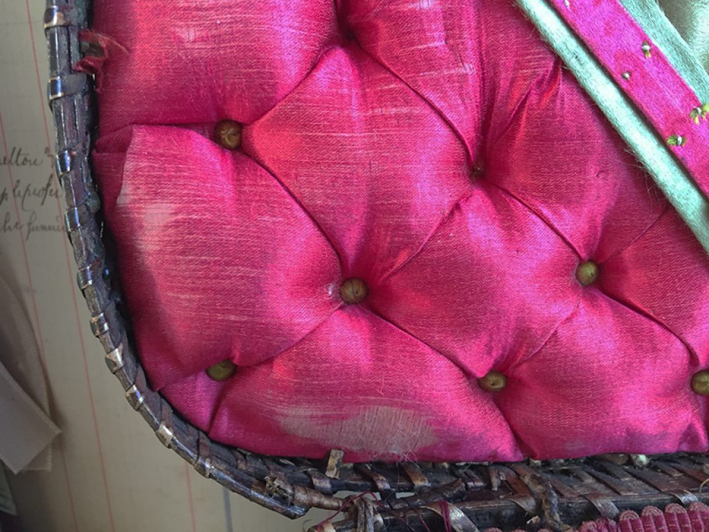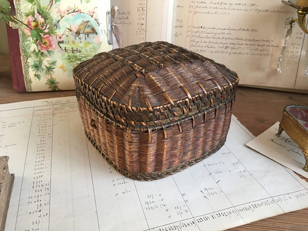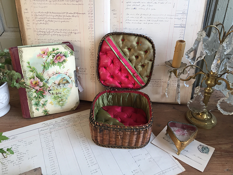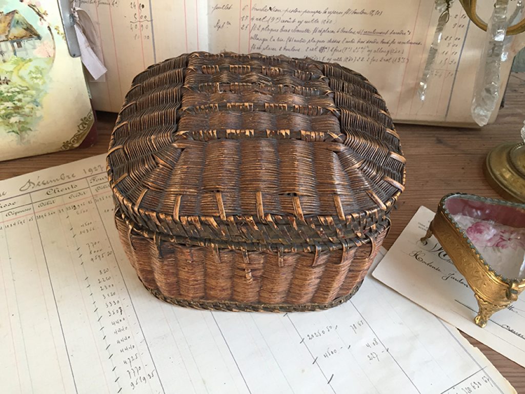 Jolie petite corbeille à ouvrage avec intérieur en soie capitonnée comportant quelques marques d’usures. Pas de système de fermeture, une réparation au niveau d’une charnière.