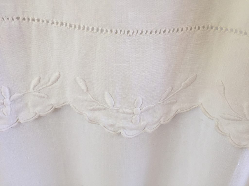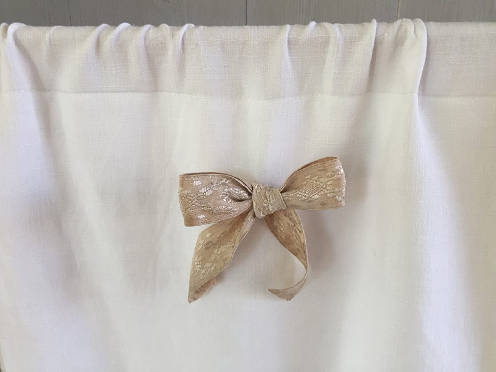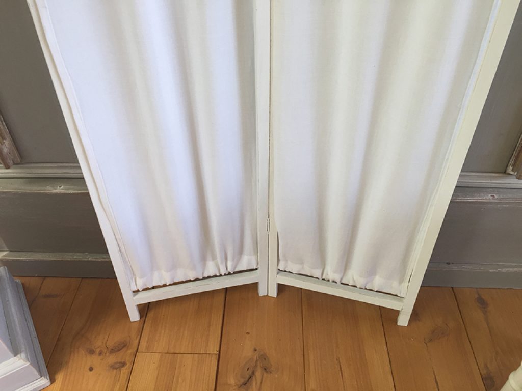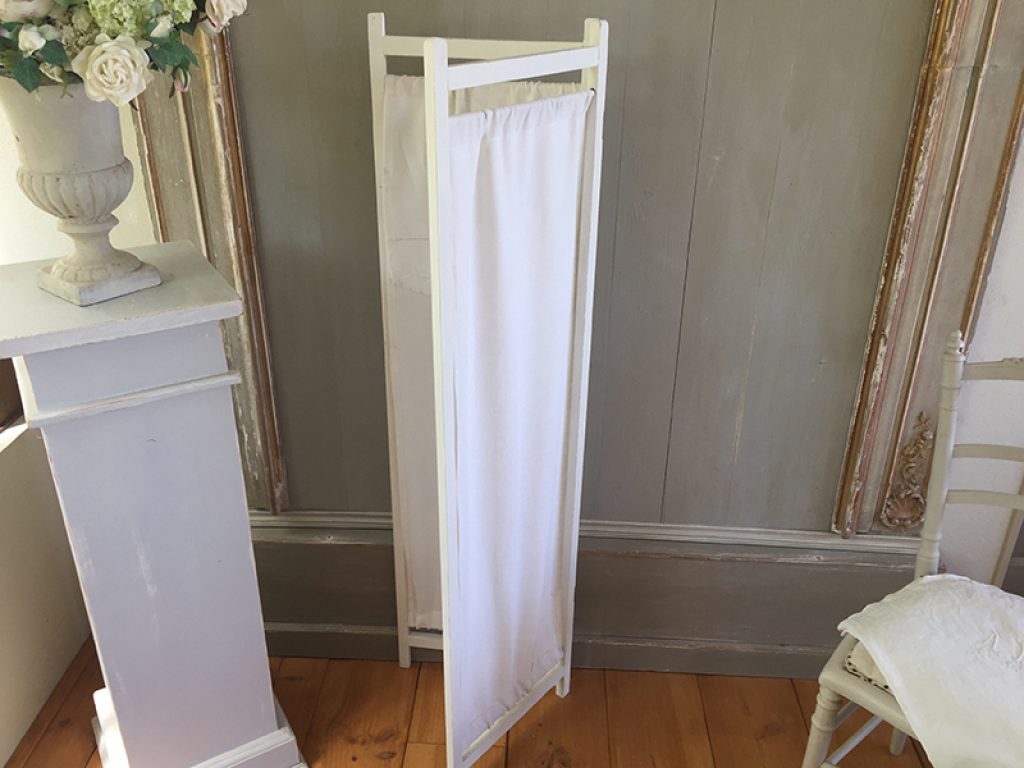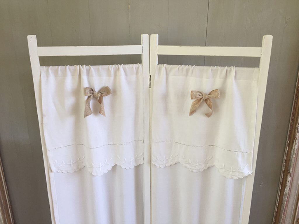 Ancien paravent en bois avec rideaux amovibles confectionnés dans une drap d’époque, brodé à la main. Agrémenté de deux noeuds en ruban.