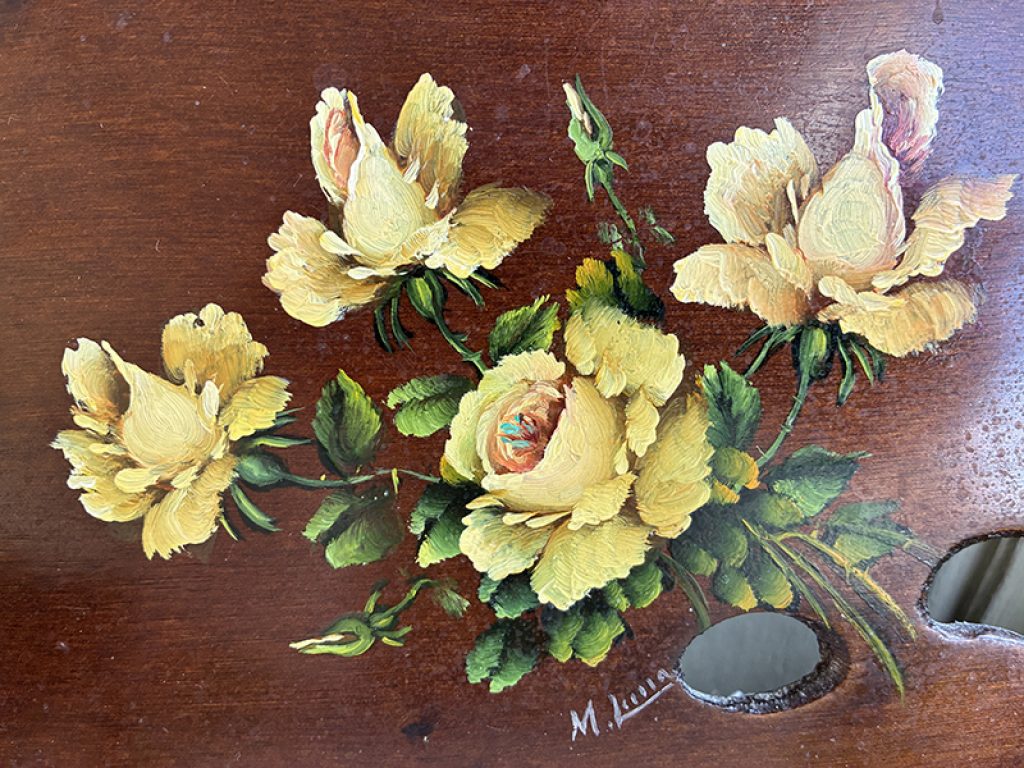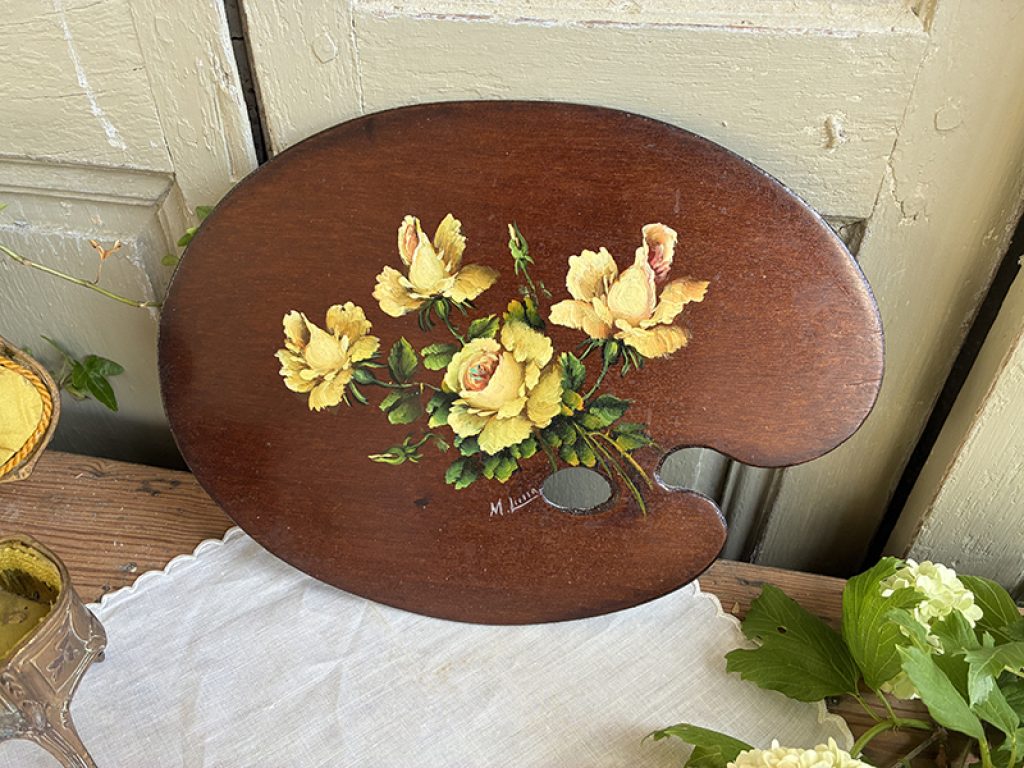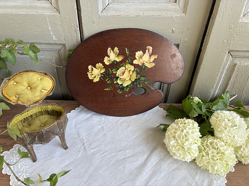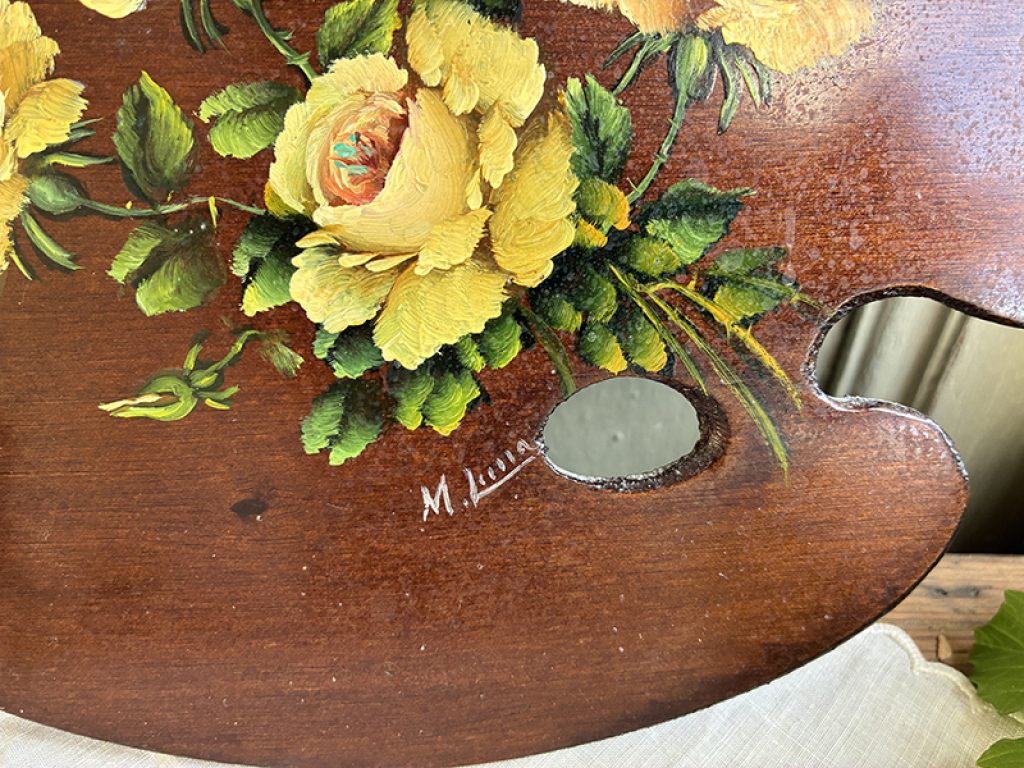Jolie petite peinture à l’huile ancienne sur palette en bois, signée. Charmant décor de roses jaunes.