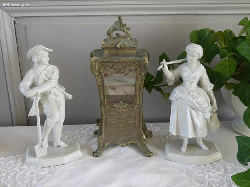 Deux personnages anciens en régule et socle en bois patiné en gris / lin. Parfaits en déco de charme ! Hauteur 18 cm Prix pour la paire