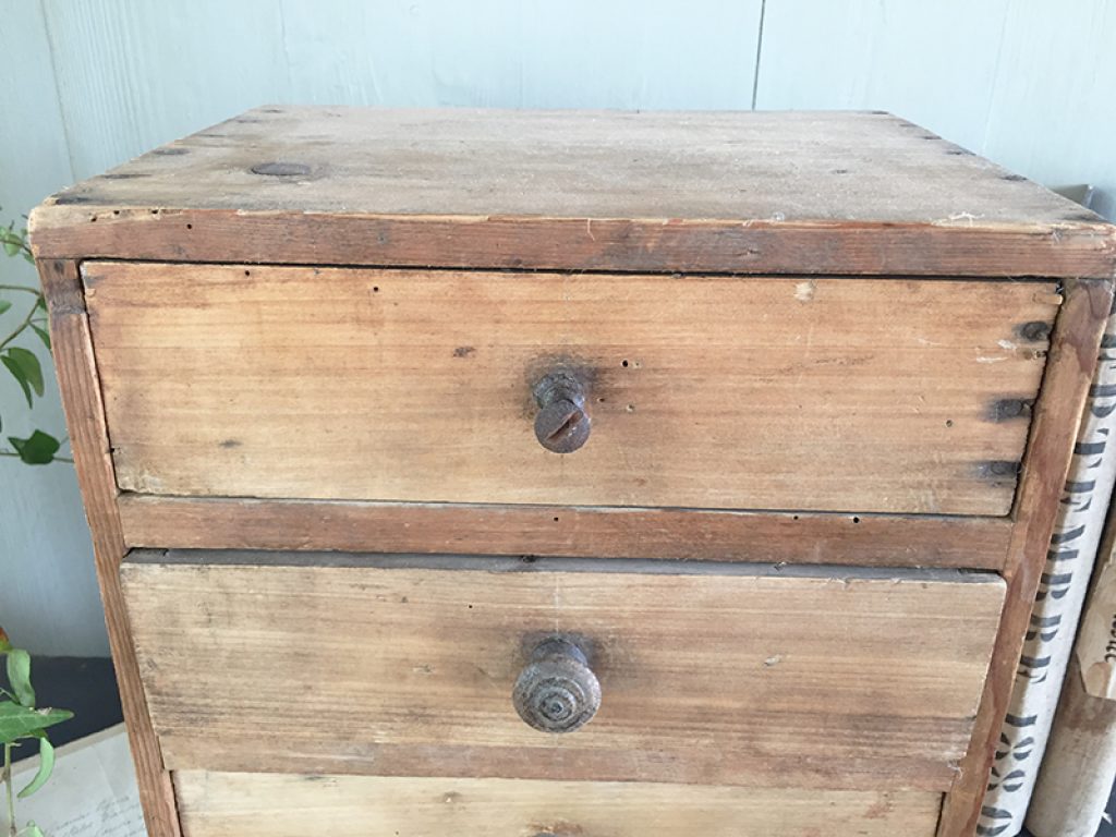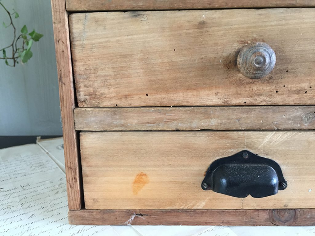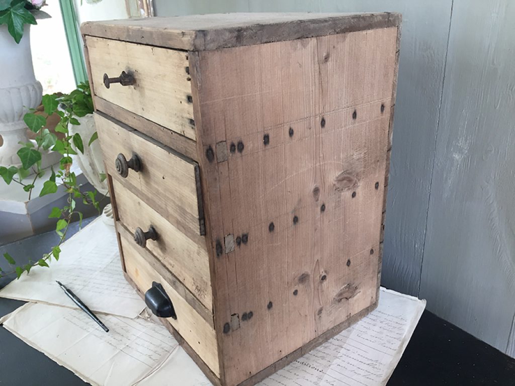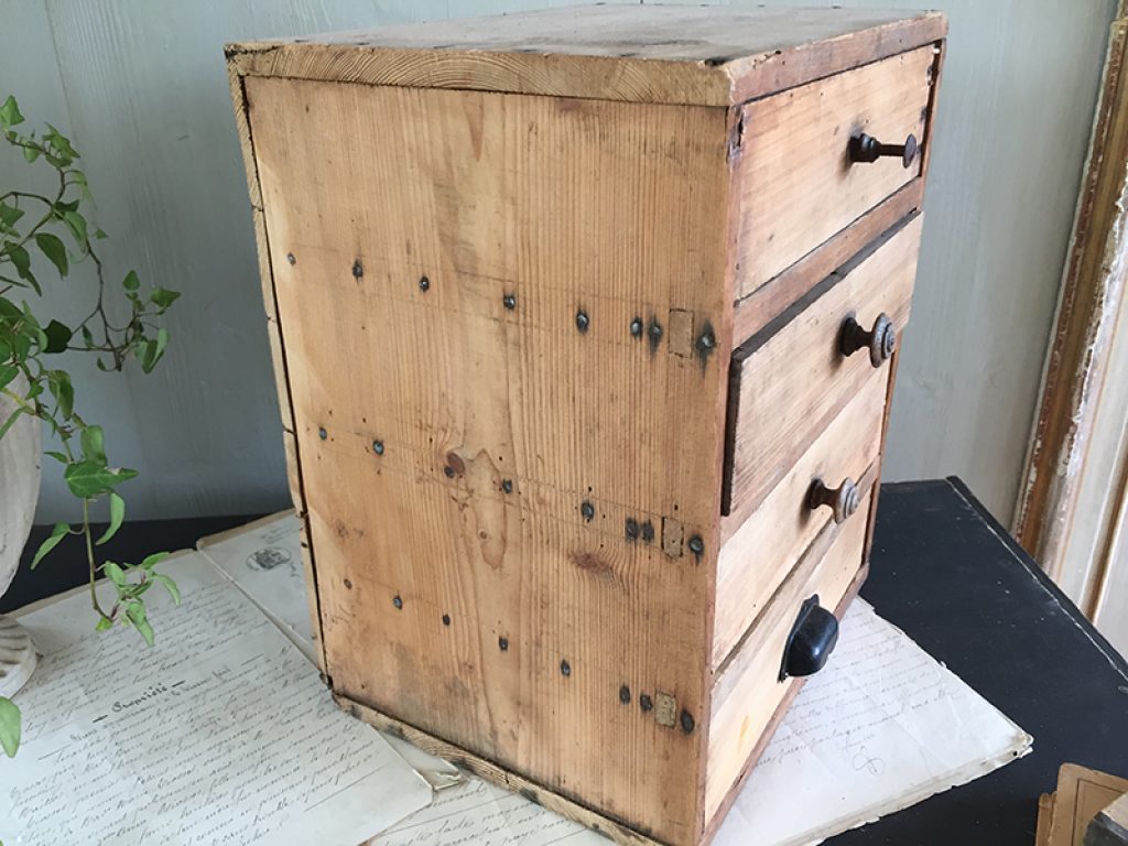 Petit meuble de métier ancien en pin, avec 4 tiroirs dont un avec poignée coquille, pratique pour les rangements de bricolage, mercerie ou autre selon les besoins .