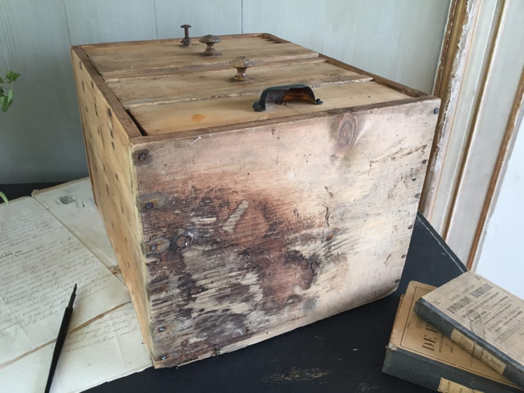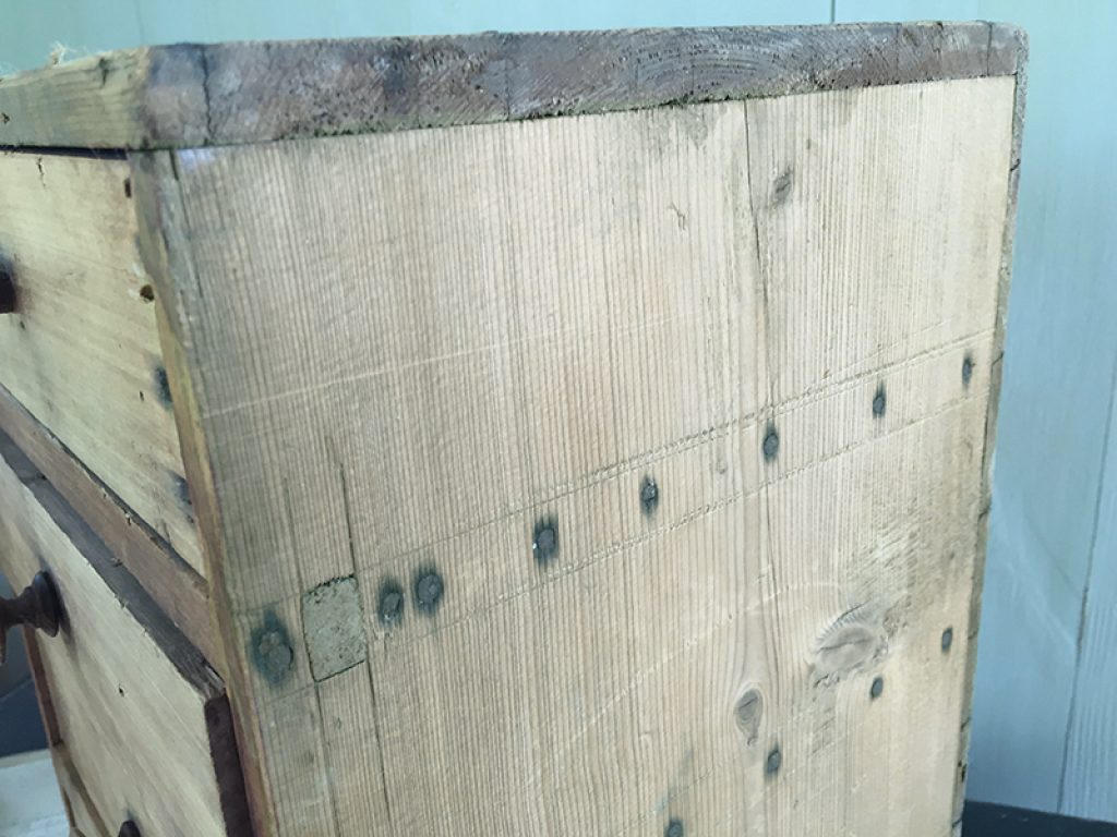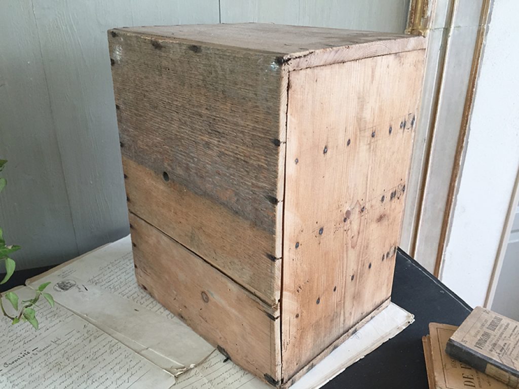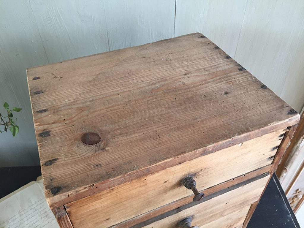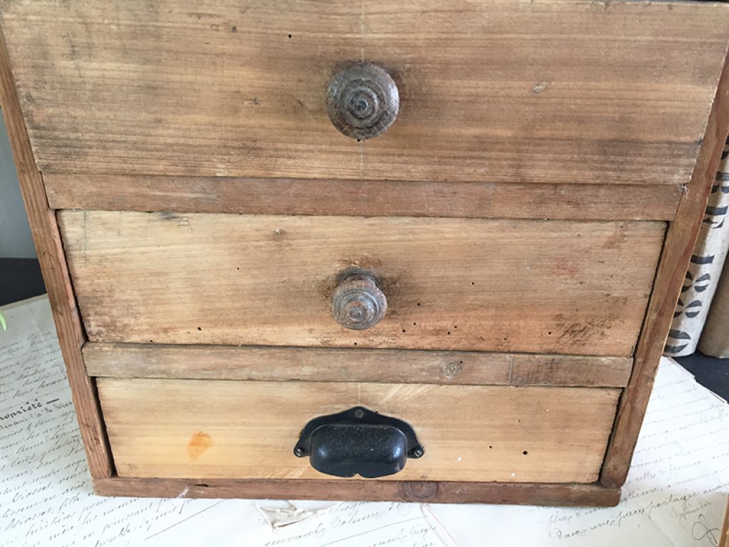 Petit meuble de métier ancien en pin, avec 4 tiroirs dont un avec poignée coquille, pratique pour les rangements de bricolage, mercerie ou autre selon les besoins .