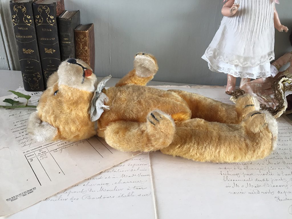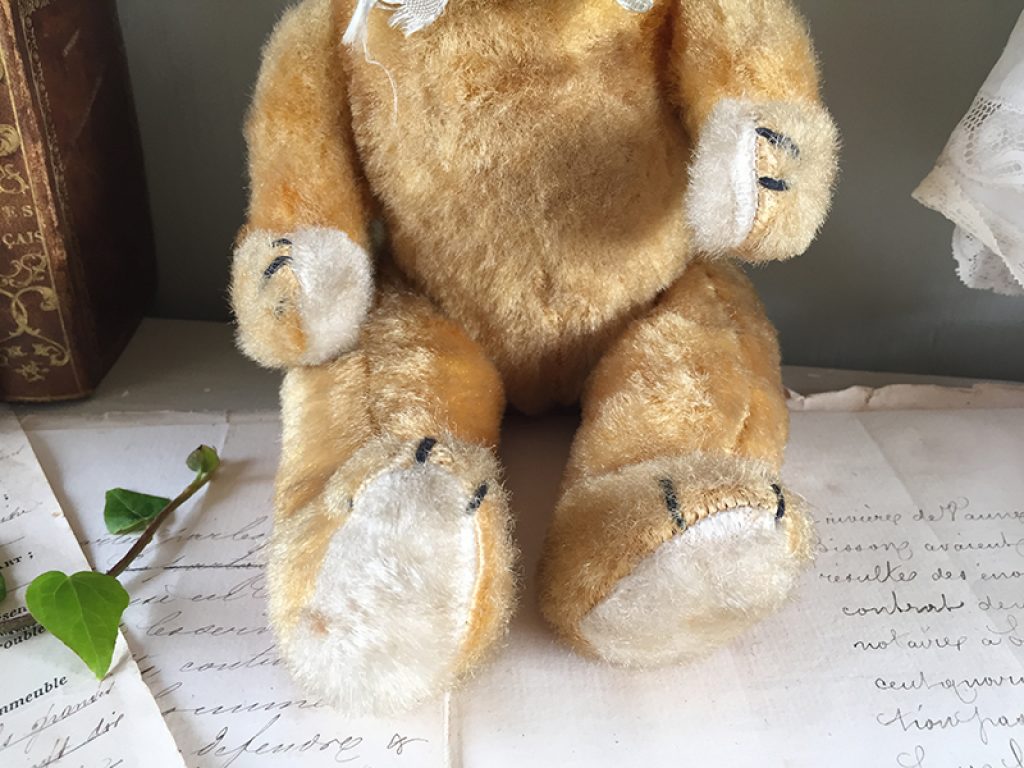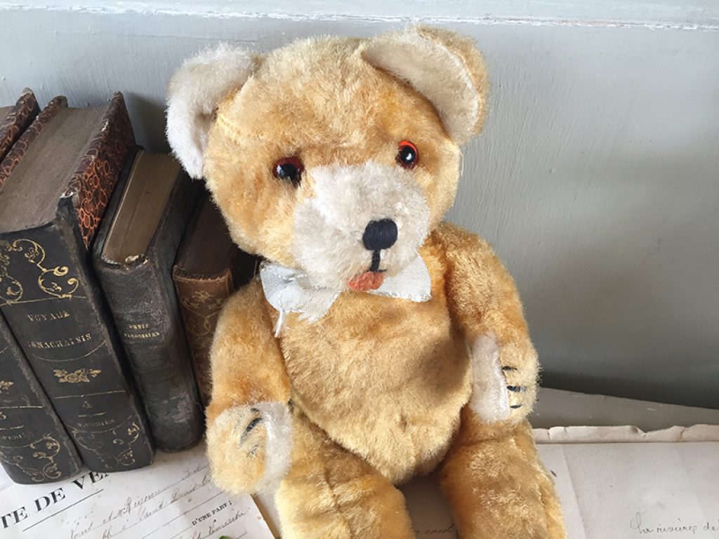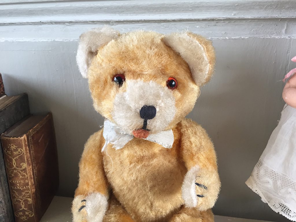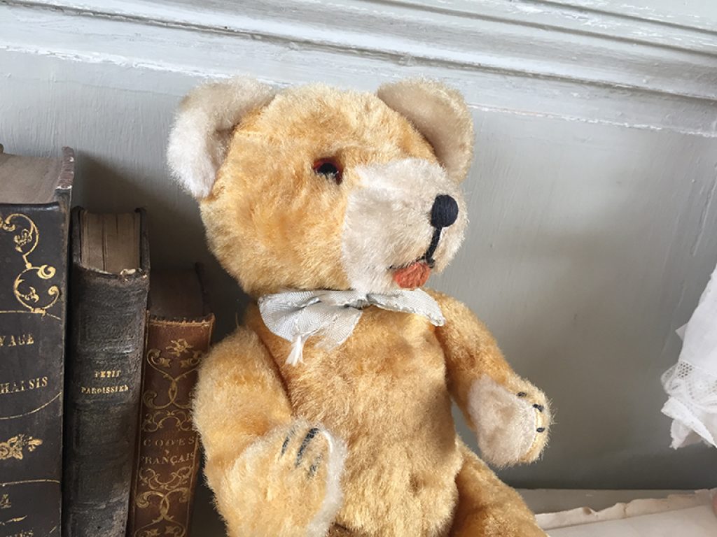 Adorable petit ours ancien qui tire la langue, en bon état général, légèrement sali sur les parties blanches. Il a du « couiner » dans sa jeunesse. 28 cm