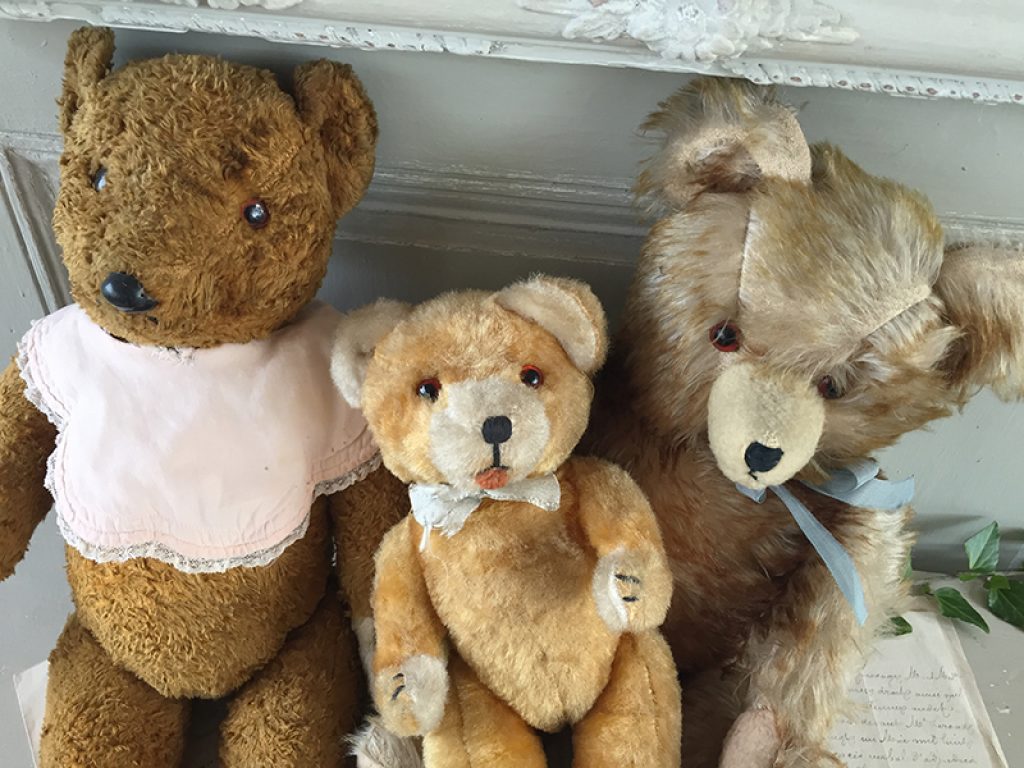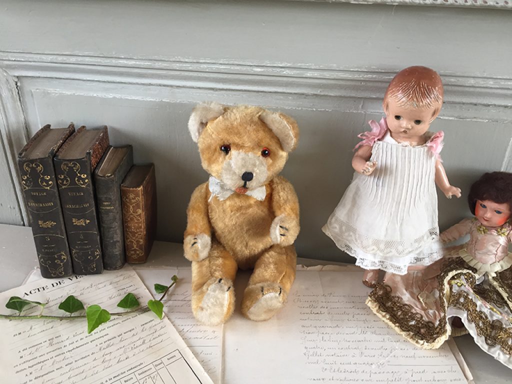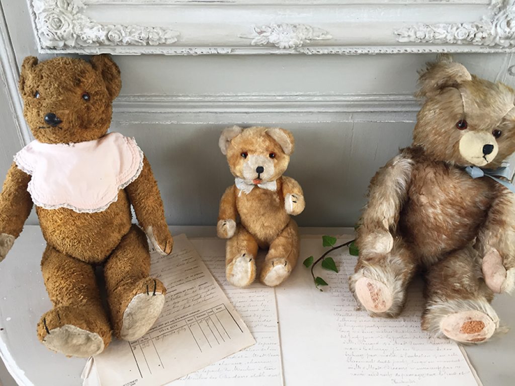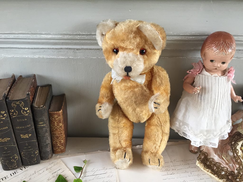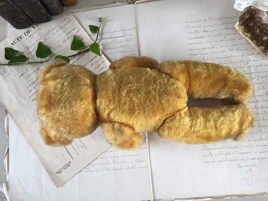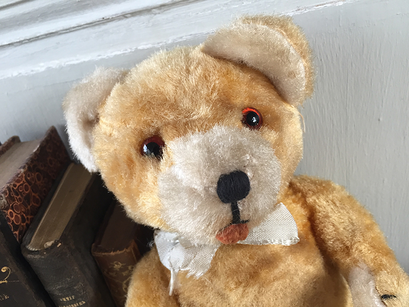 Adorable petit ours ancien qui tire la langue, en bon état général, légèrement sali sur les parties blanches. Il a du « couiner » dans sa jeunesse. 28 cm
