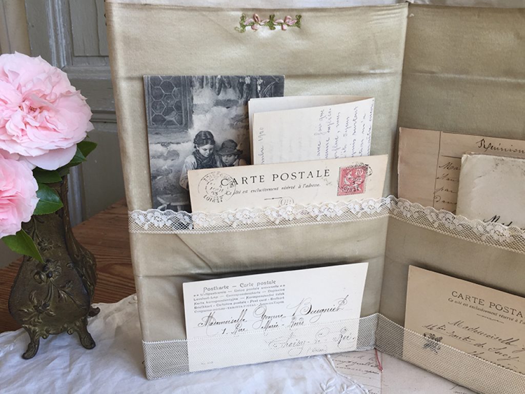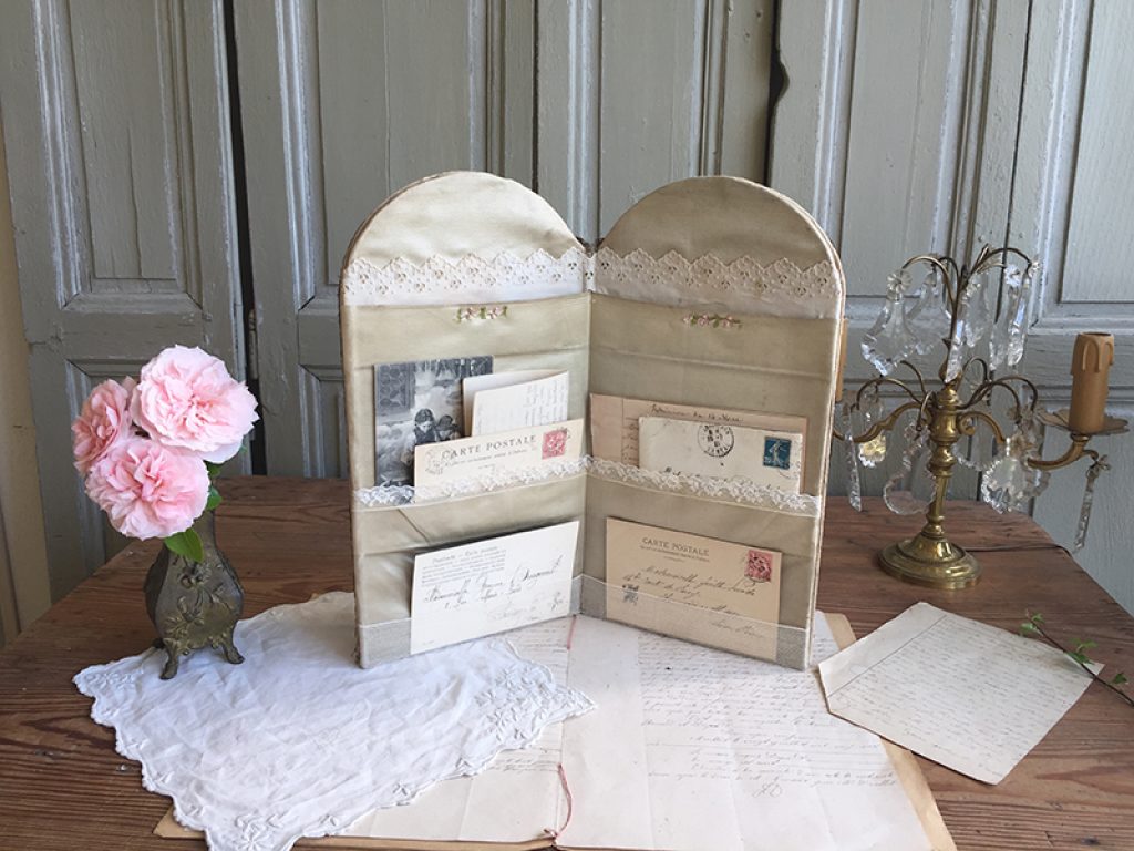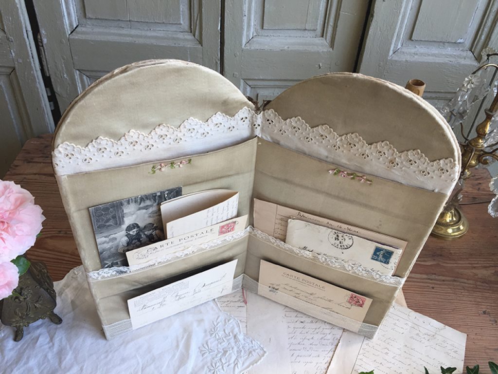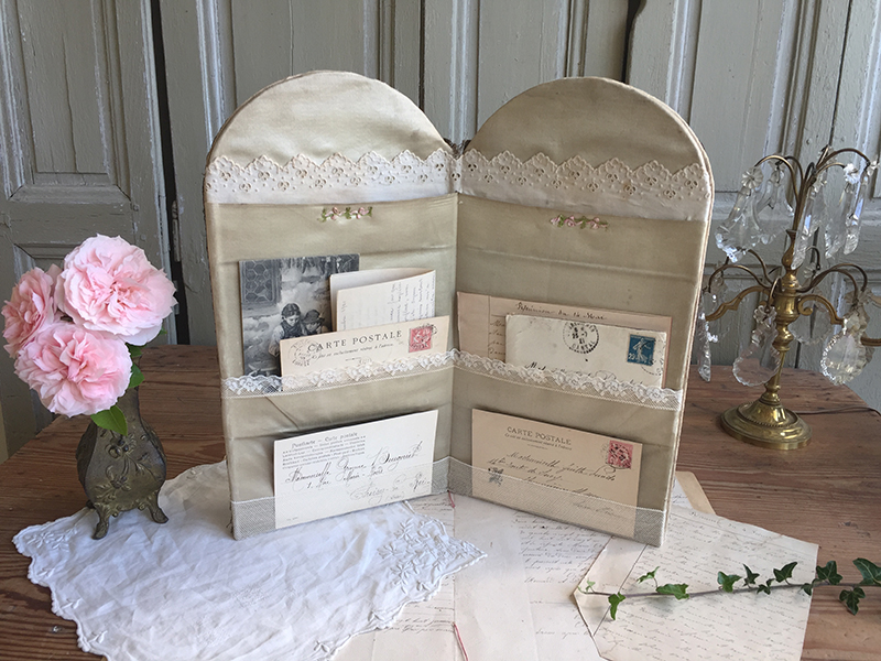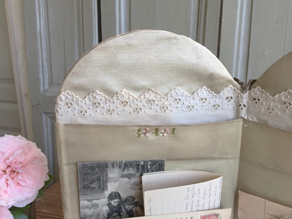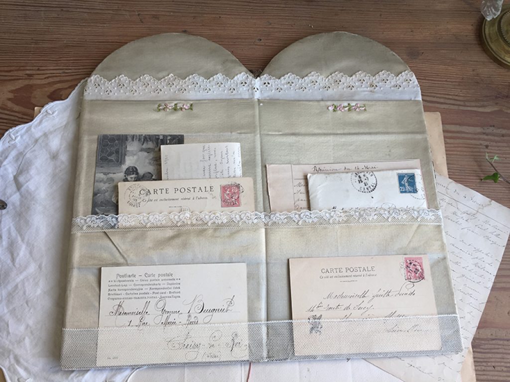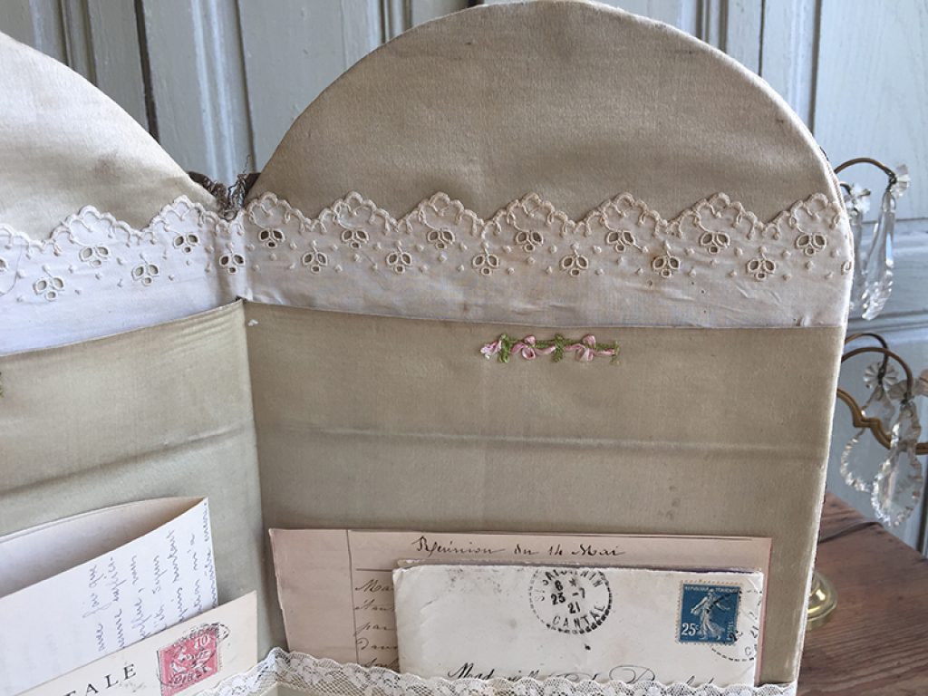 Petit porte photo ou courrier ancien en soie, tissu et dentelle garni de documents et papiers d’époque. Jolie broderie sur la face extérieure avec fleur en tissu. Fabrication artisanale, traces d’usage, tache discrète