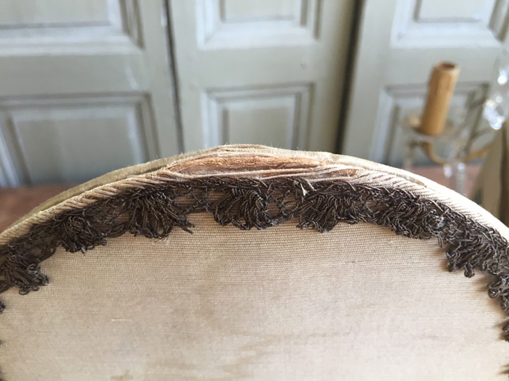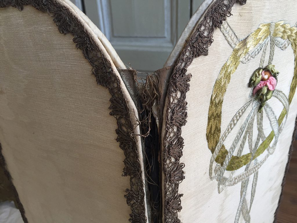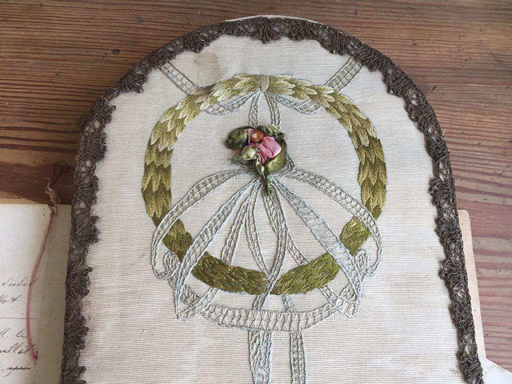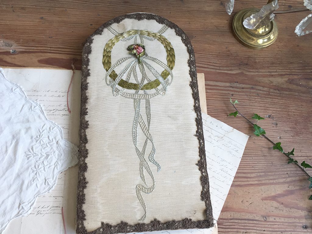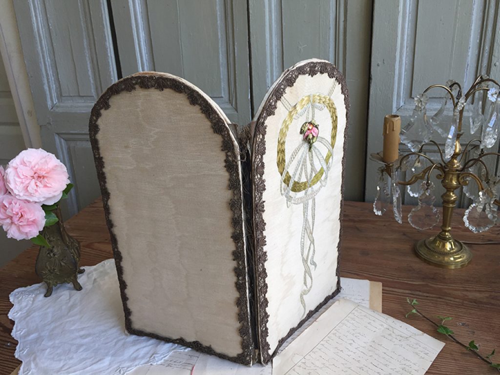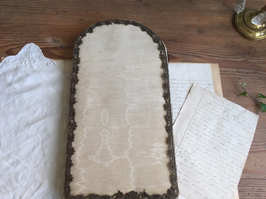 Petit porte photo ou courrier ancien en soie, tissu et dentelle garni de documents et papiers d’époque. Jolie broderie sur la face extérieure avec fleur en tissu. Fabrication artisanale, traces d’usage, tache discrète