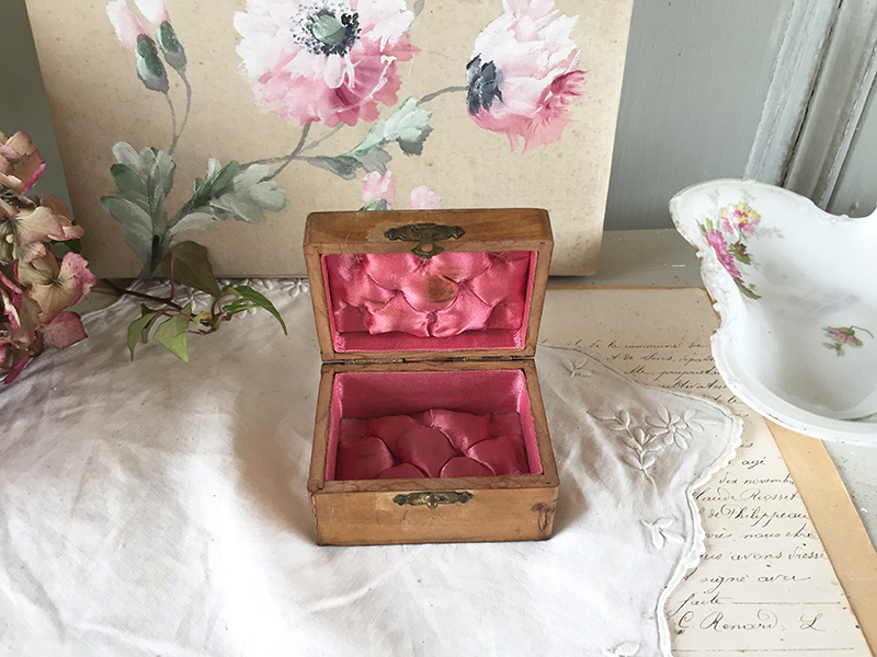 Jolie petite boite à bijoux ancienne en bois peinte à la main, avec intérieur capitonné rose.