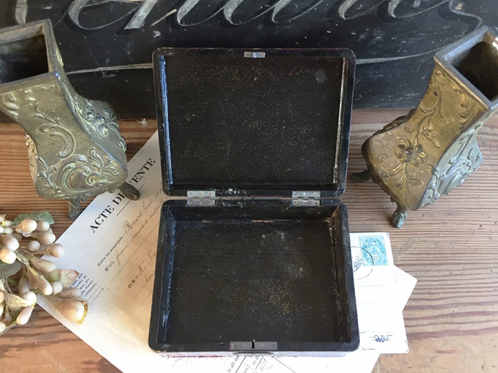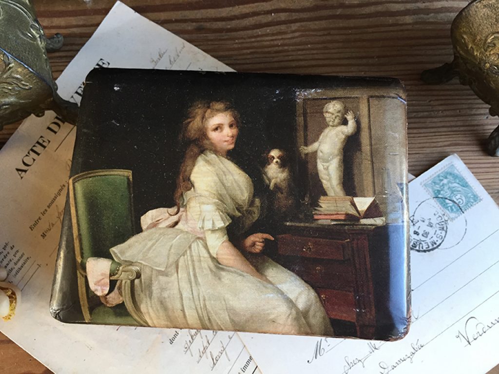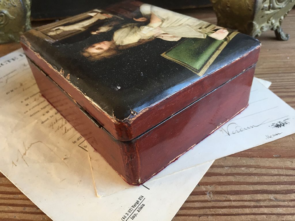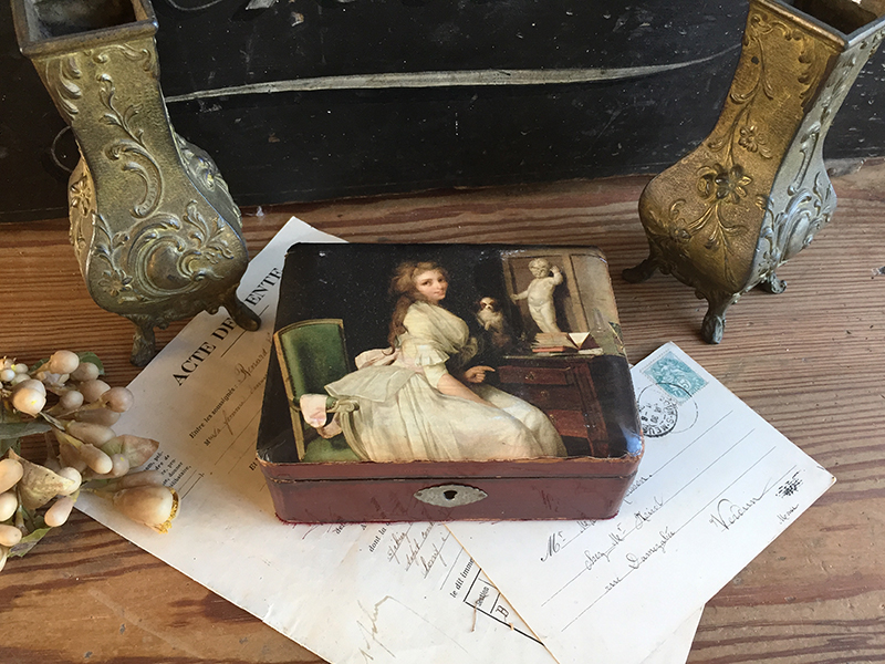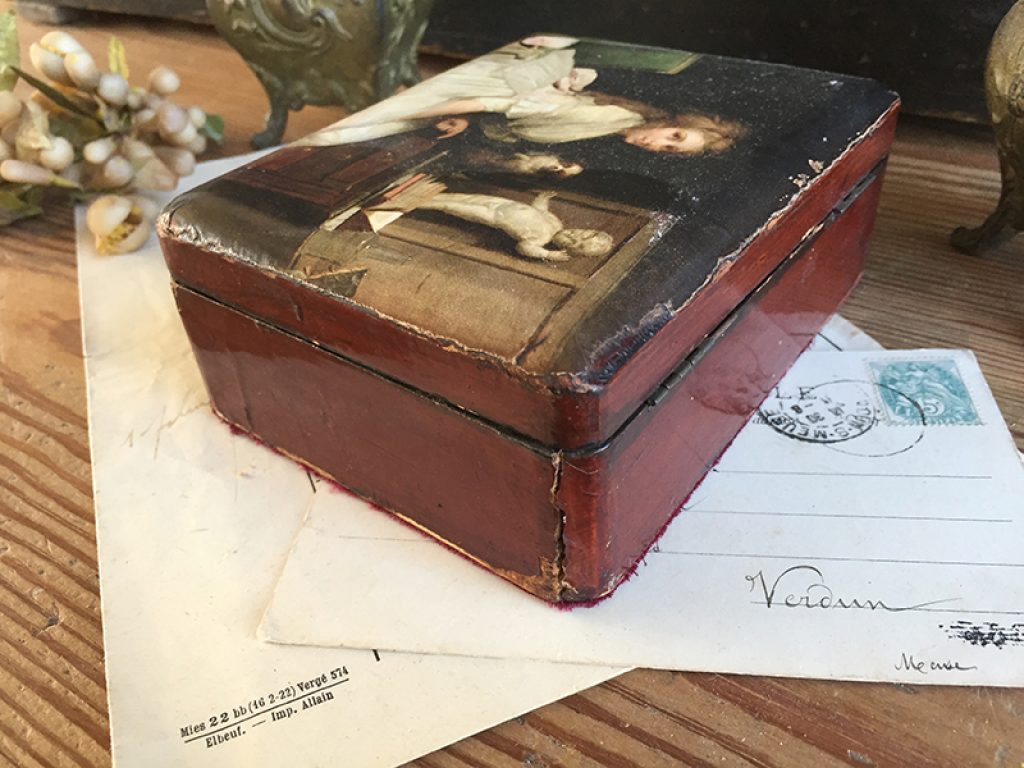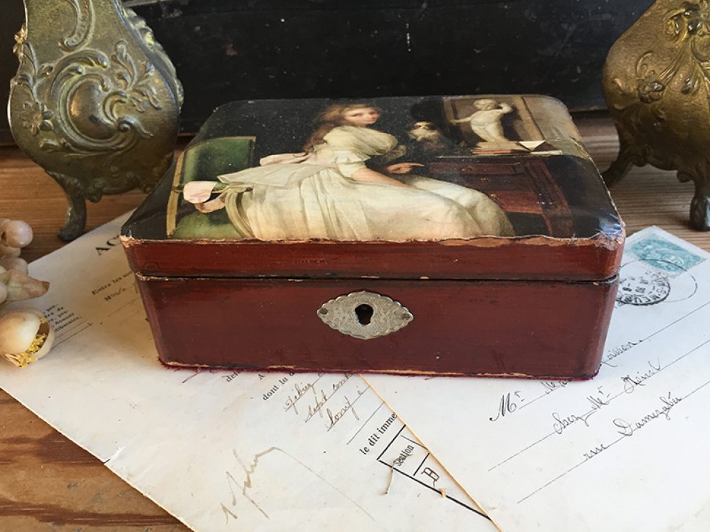 Jolie boite ancienne en bois avec image d’origine sur le couvercle au ravissant décor de femme élégante et son chien. Plus de clé, traces d’usage.
