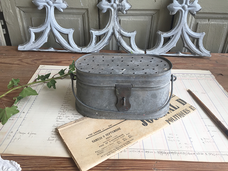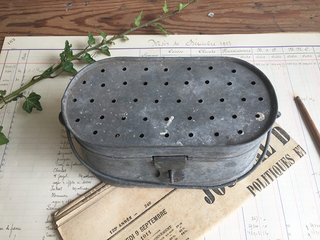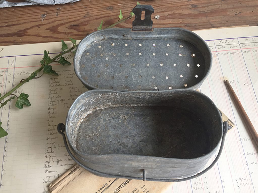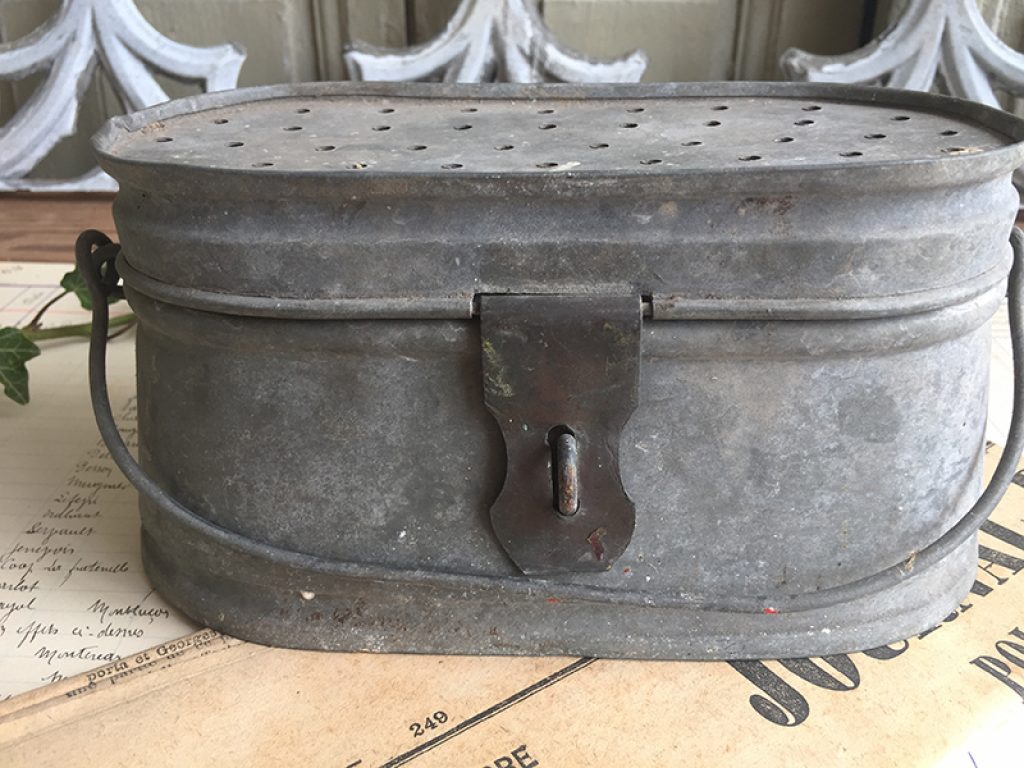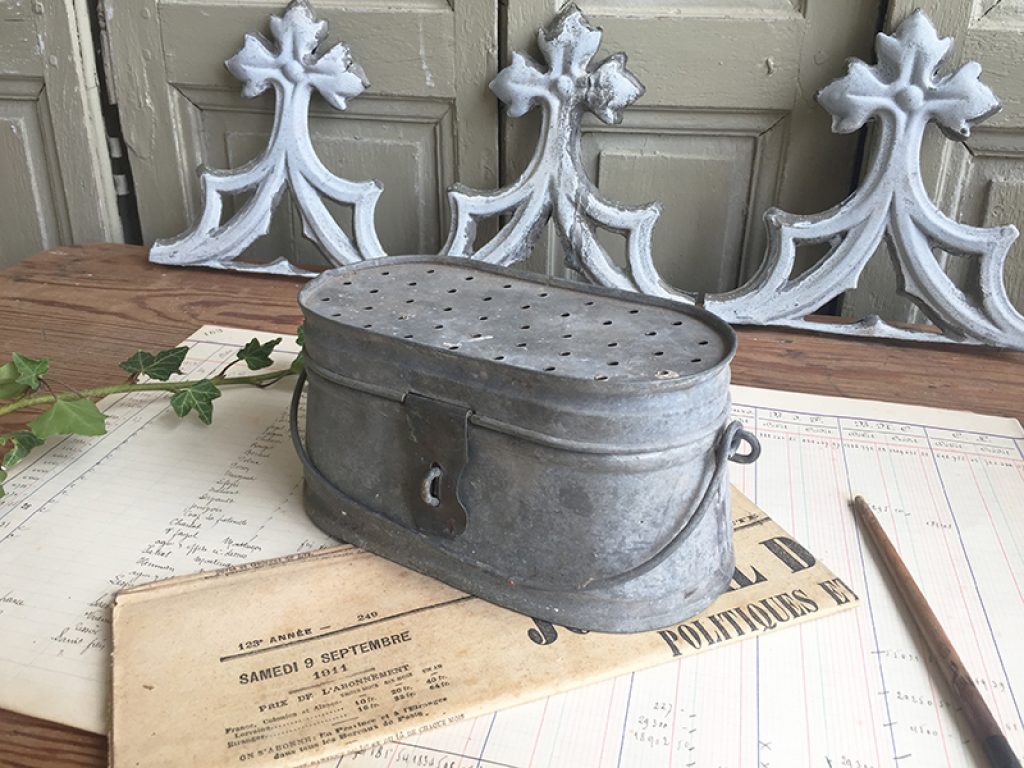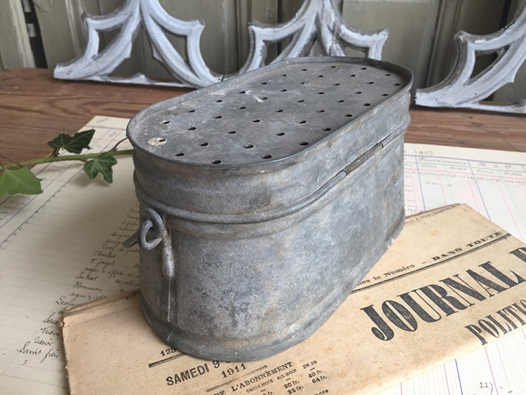 Jolie petite goujonnière ancienne en zinc, pour enfant, de forme peu courante.
