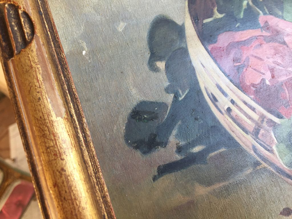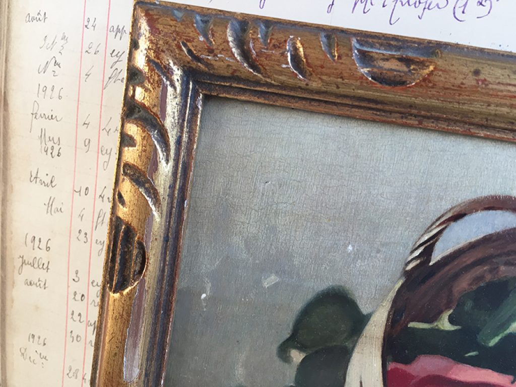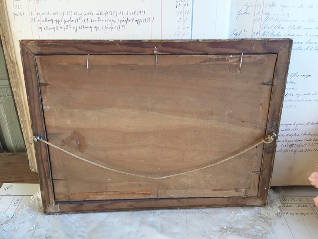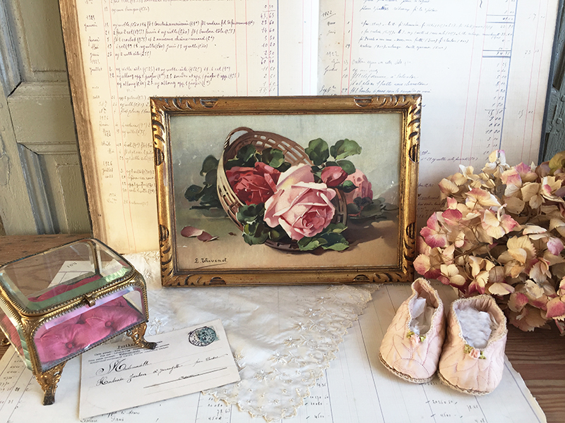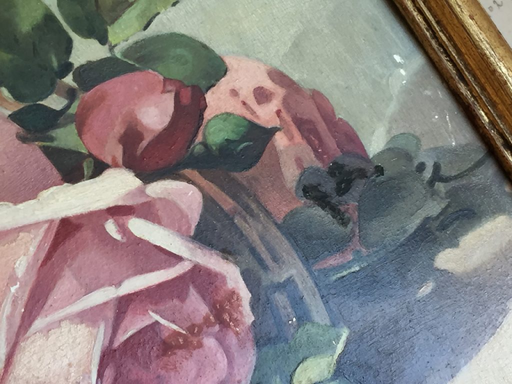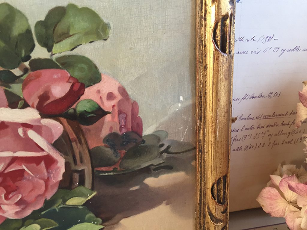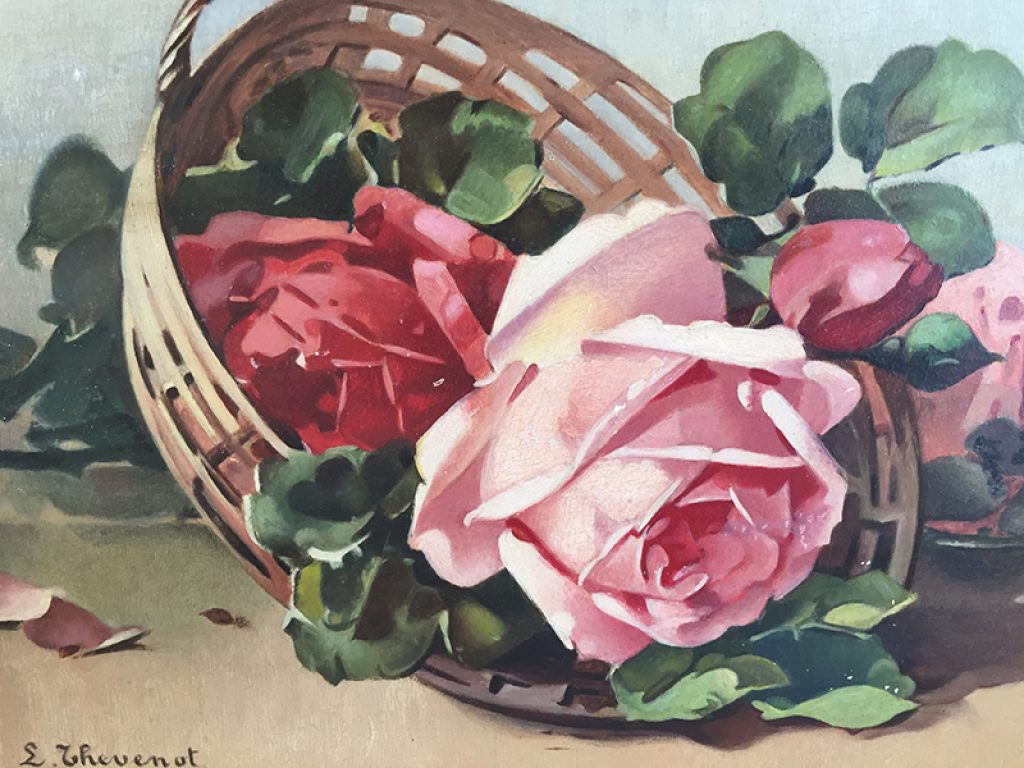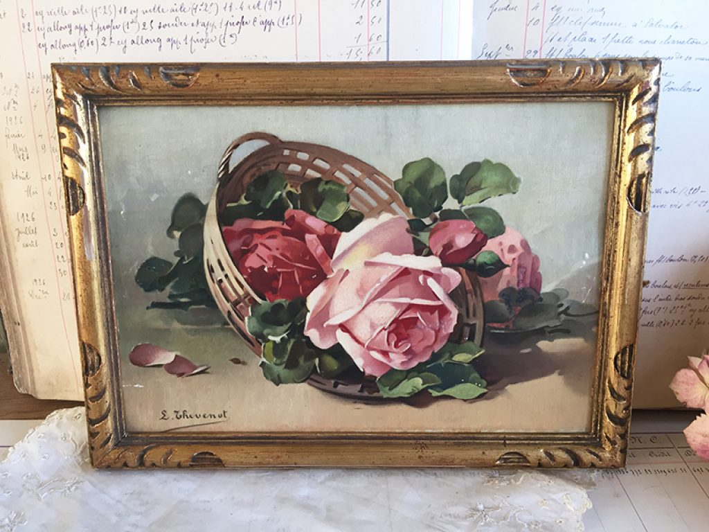 Ravissante huile ancienne sur panneau dans un cadre en bois doré, au joli décor de roses réalisé d’après C. Klein, signé en bas L.Thevenot. Petits manques sur la peinture. 30 x 22 cm
