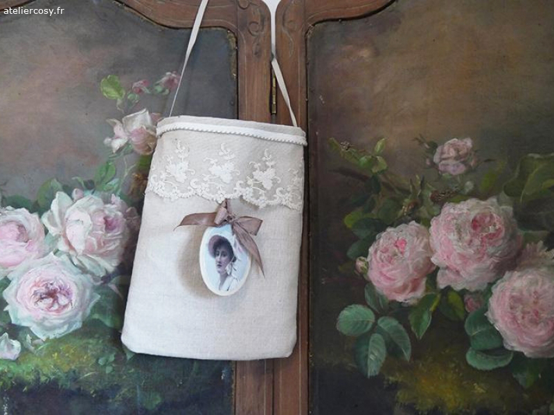 Petite pochette réalisée dans du lin ancien, avec bande de dentelle et galon, agrémentée d’un portrait cartonné. Création maison 16 x 22 cm Anse 16 cm