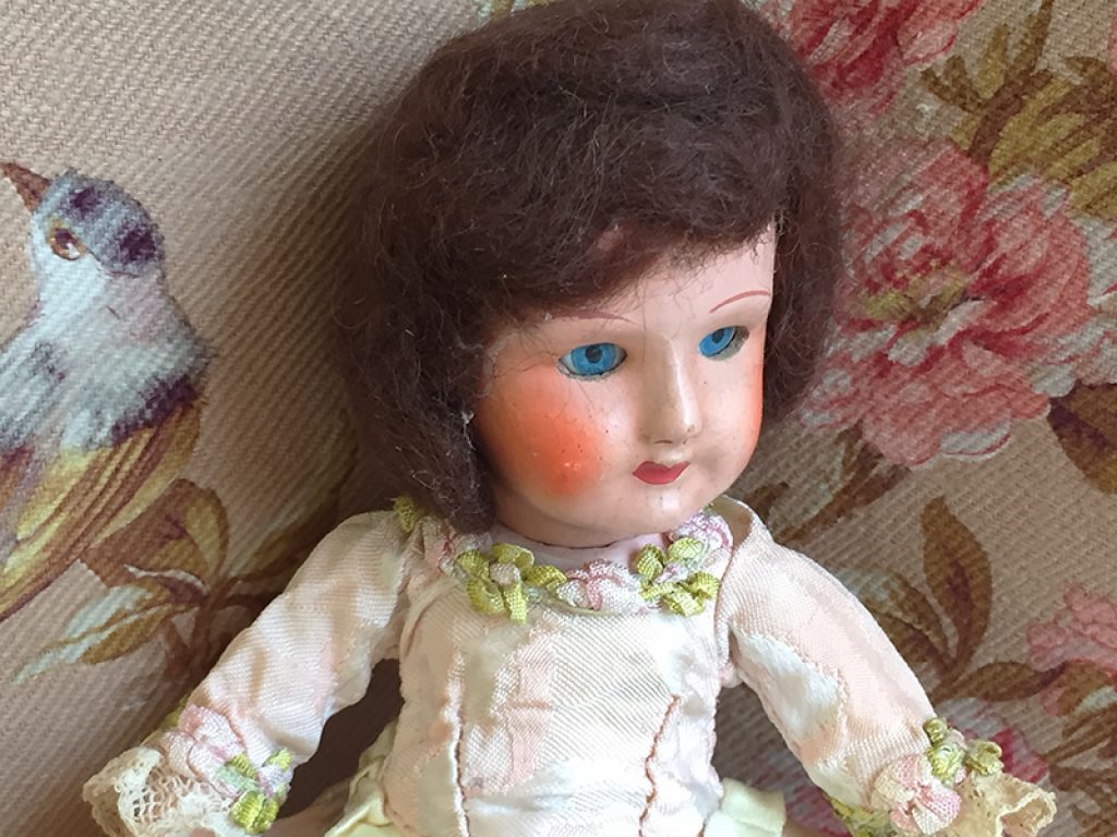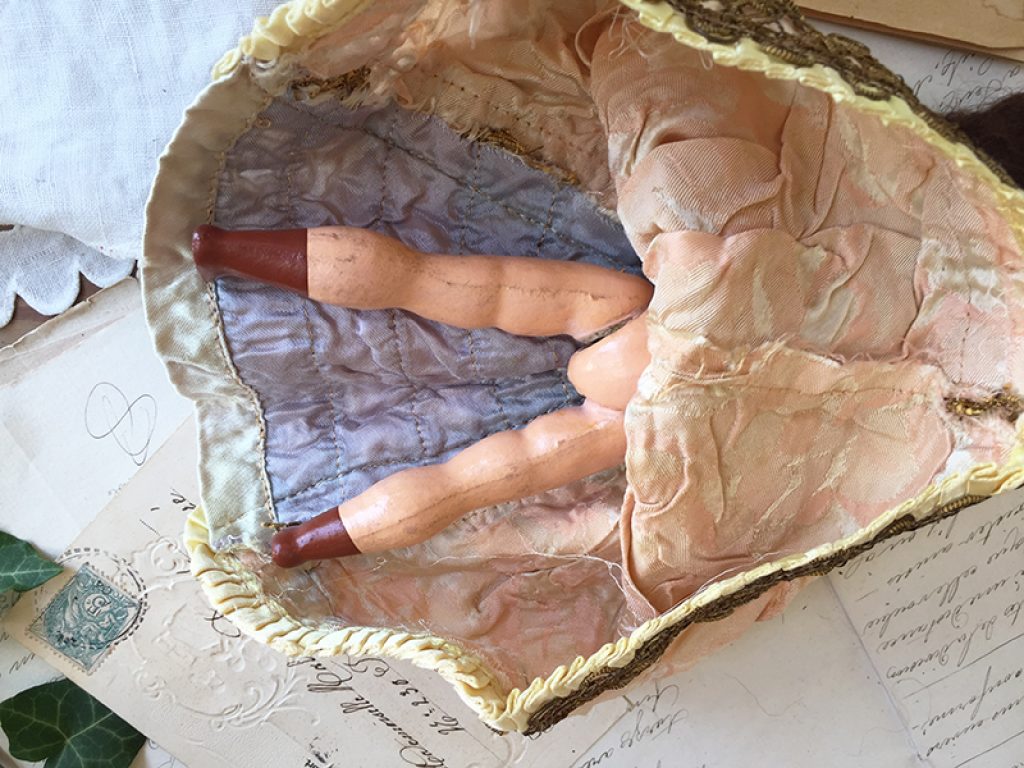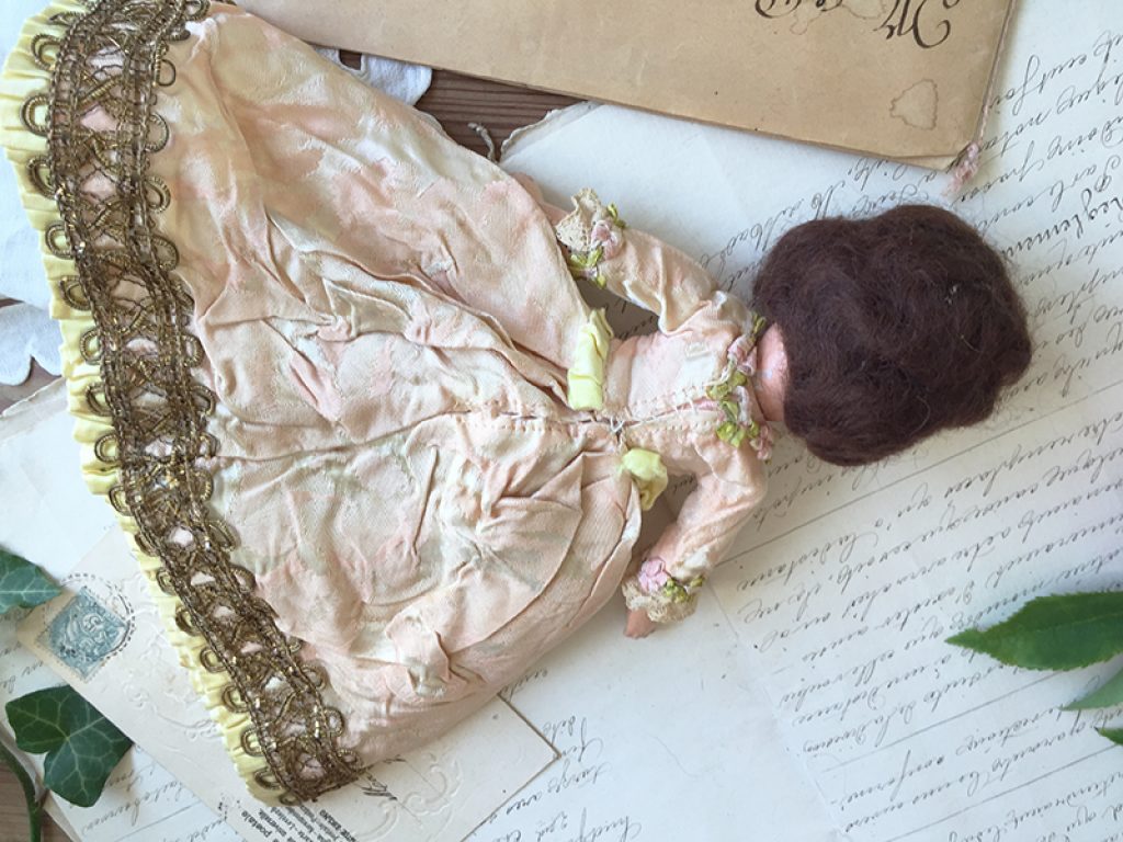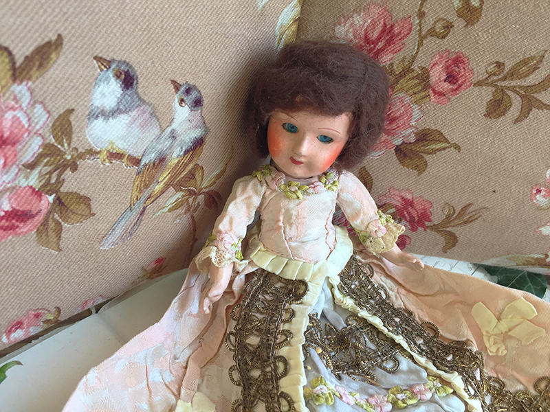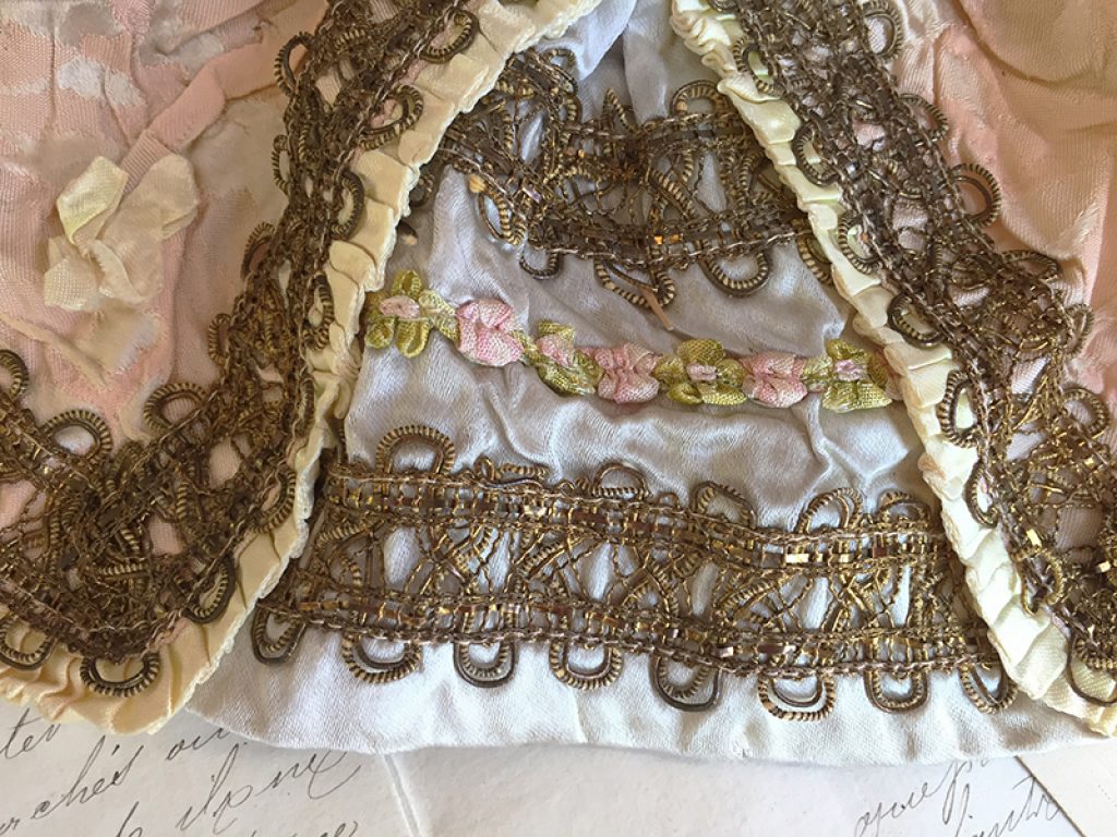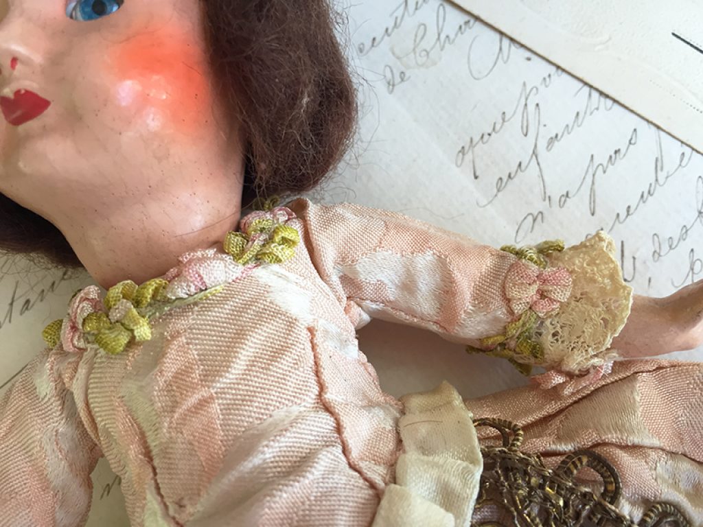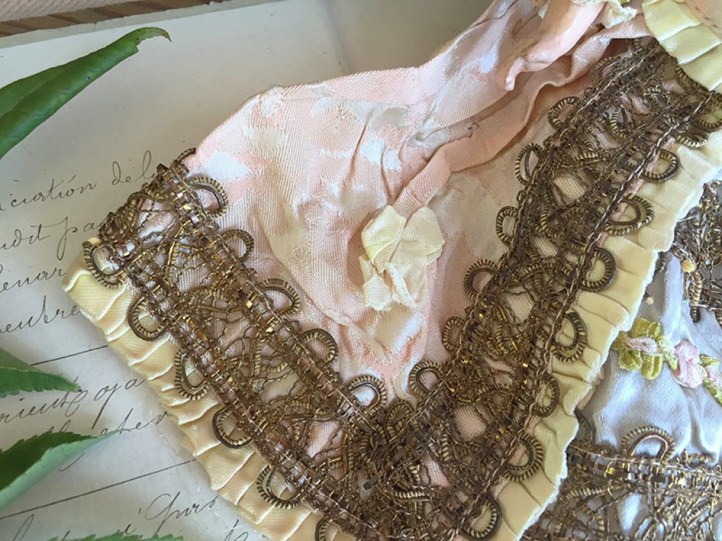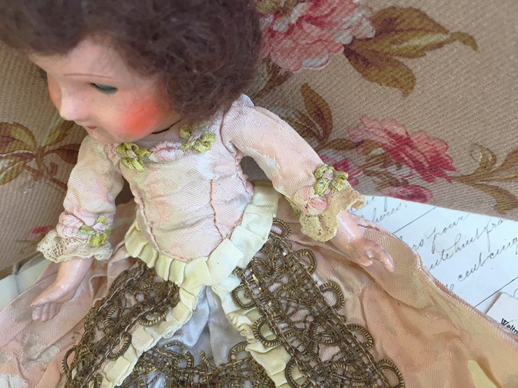 Petite poupée ancienne vêtue d’une jolie robe garnie de ruban rococo et galon doré. L’élastique de la tête est détendu.