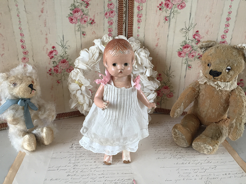Ancienne petite poupée américaine » Patsyette » vêtue d’une robe en deux parties en coton fin bordée de dentelle.