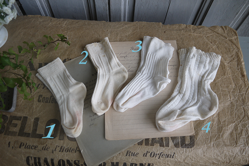 Petites paires de chaussettes anciennes, taille bébé, grande poupée ou jeune enfant, vendues séparément. Taches de stockage, de rouille ou de délavage ( traces roses en dessous ) . Parfaites aussi en déco dans des petites chaussures. A agrémenter (ruban, dentelles .. ) ou pas ! …selon les envies.
