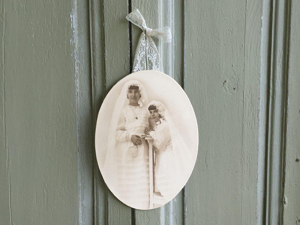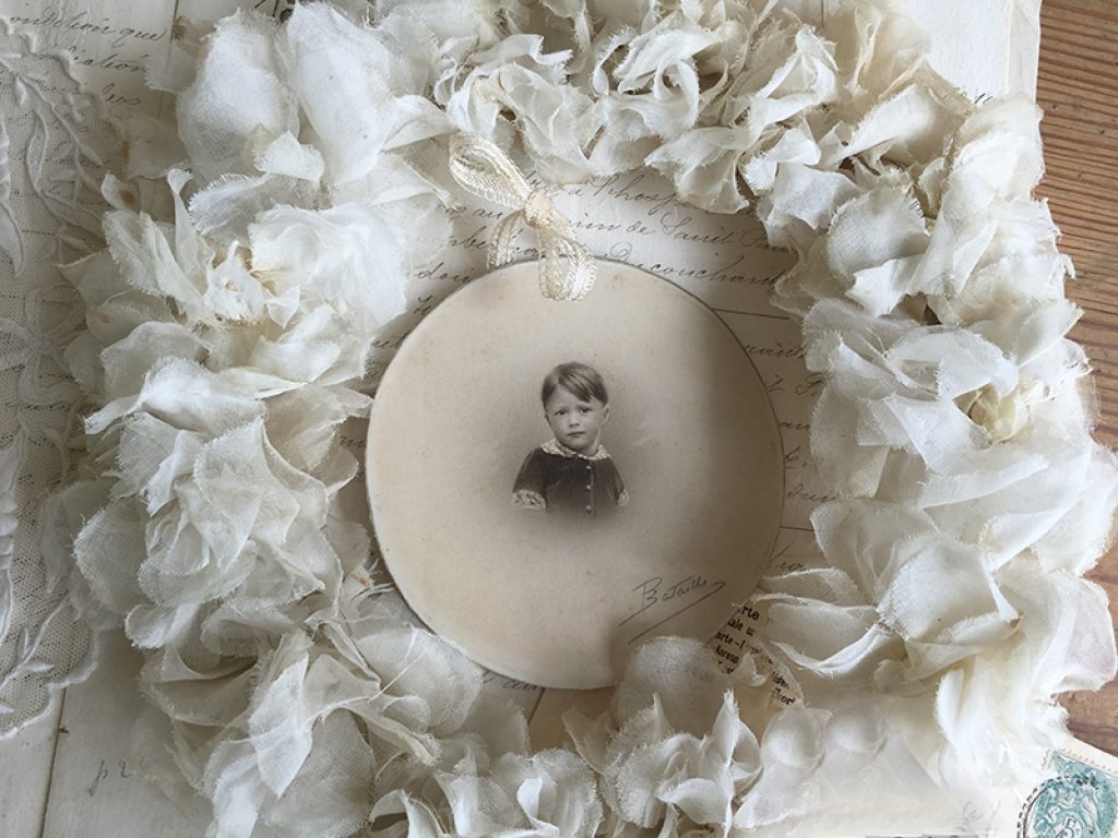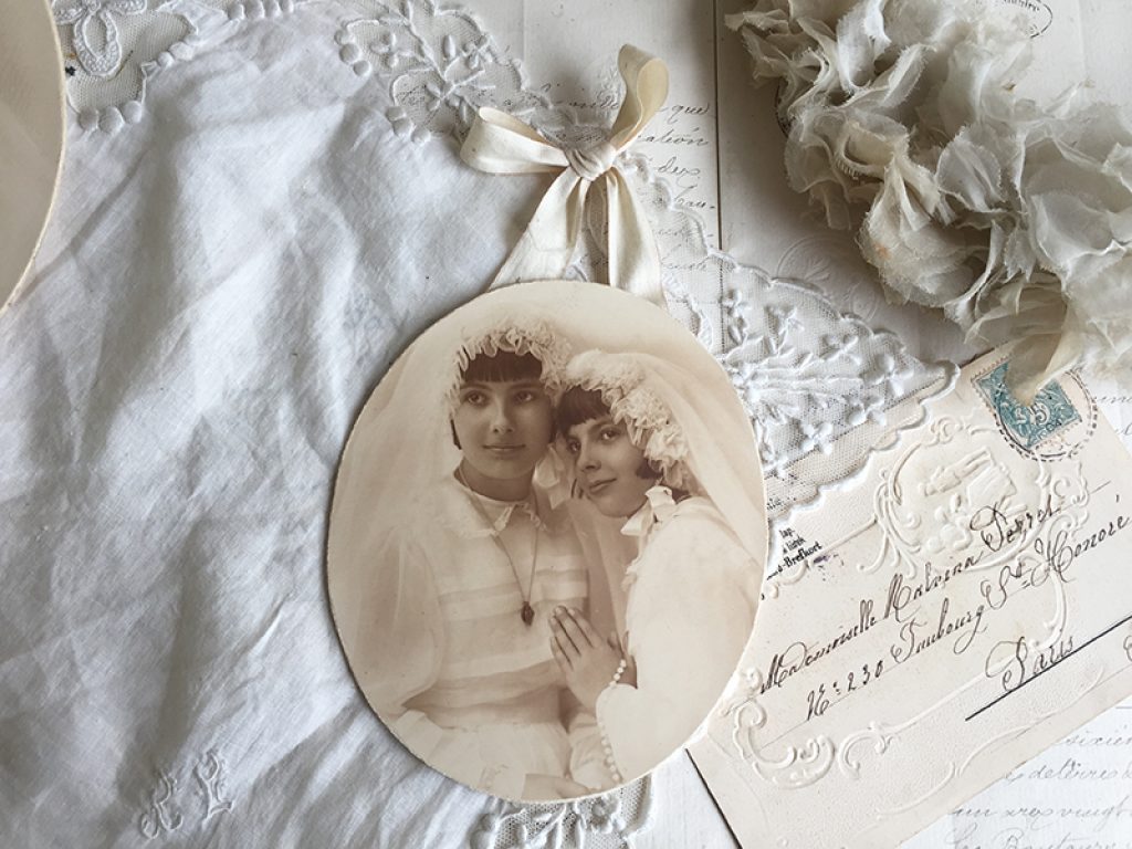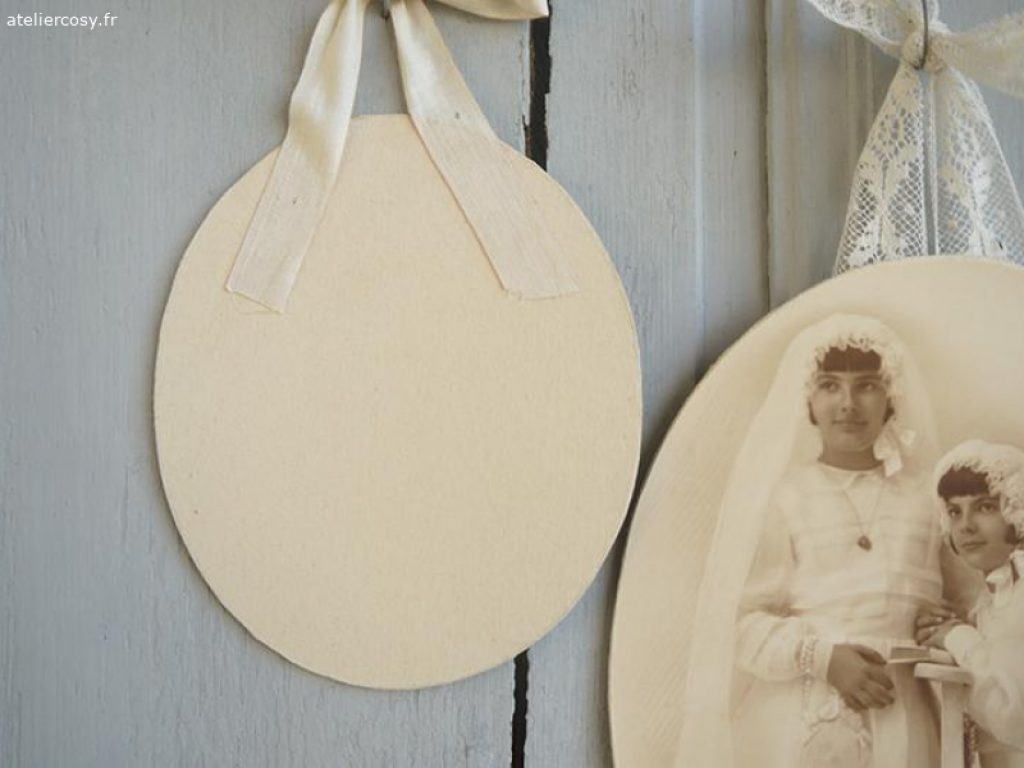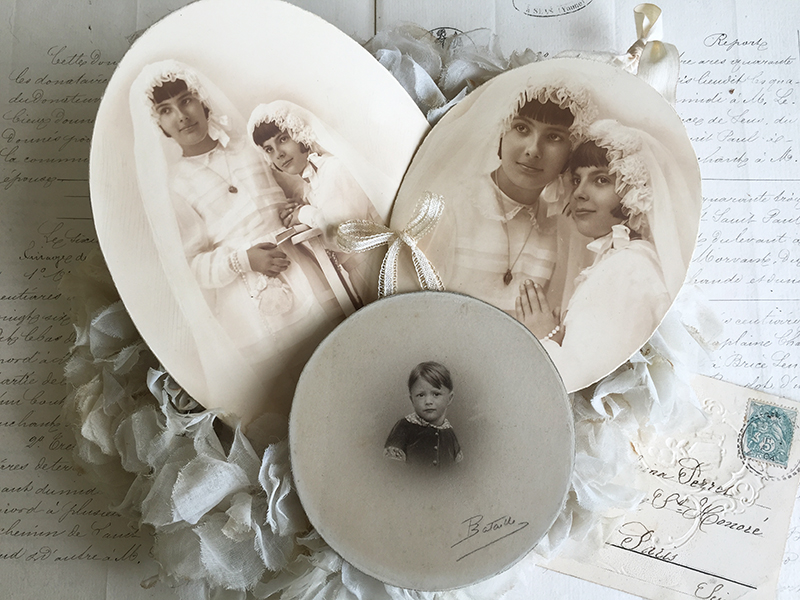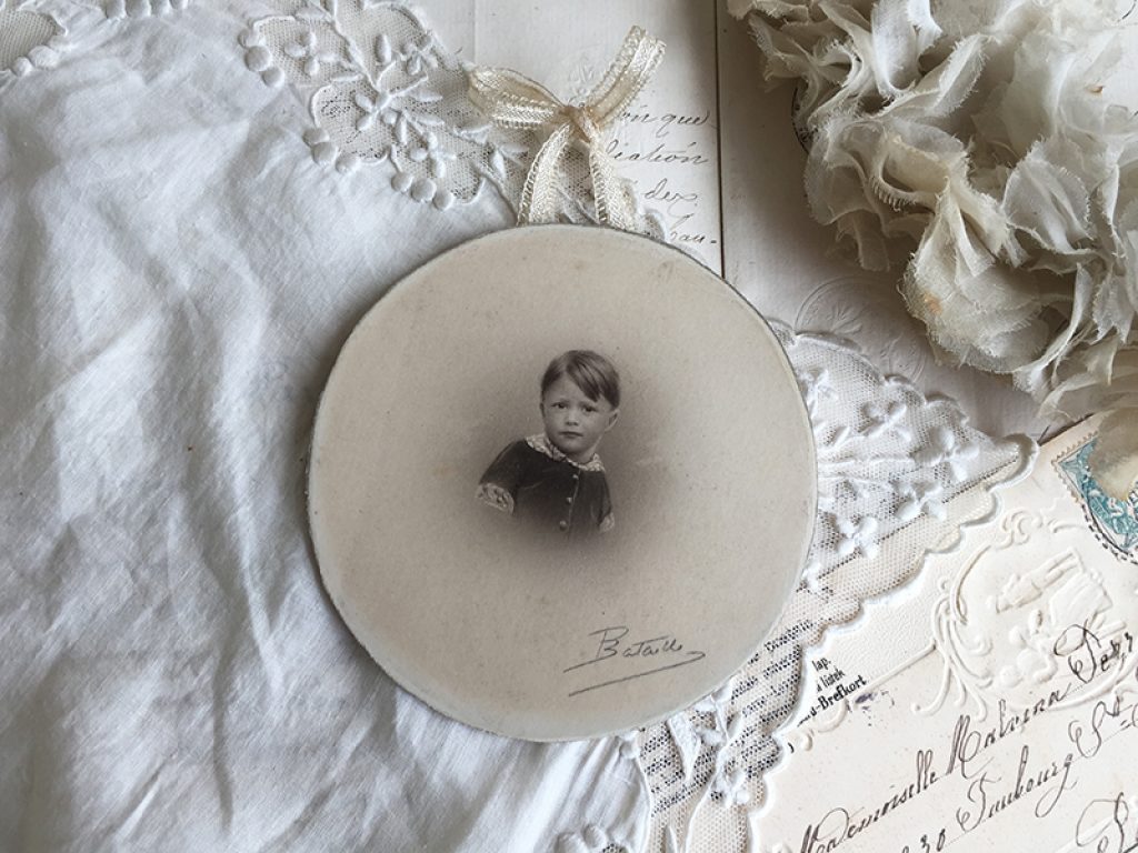 Trois ravissantes photos cartonnées anciennes recoupées en ovale ou rond et agrémentées de ruban ou dentelle pour l’accroche. Jolie tonalité crème pour les ovales, parfaites pour de belles mises en scène !